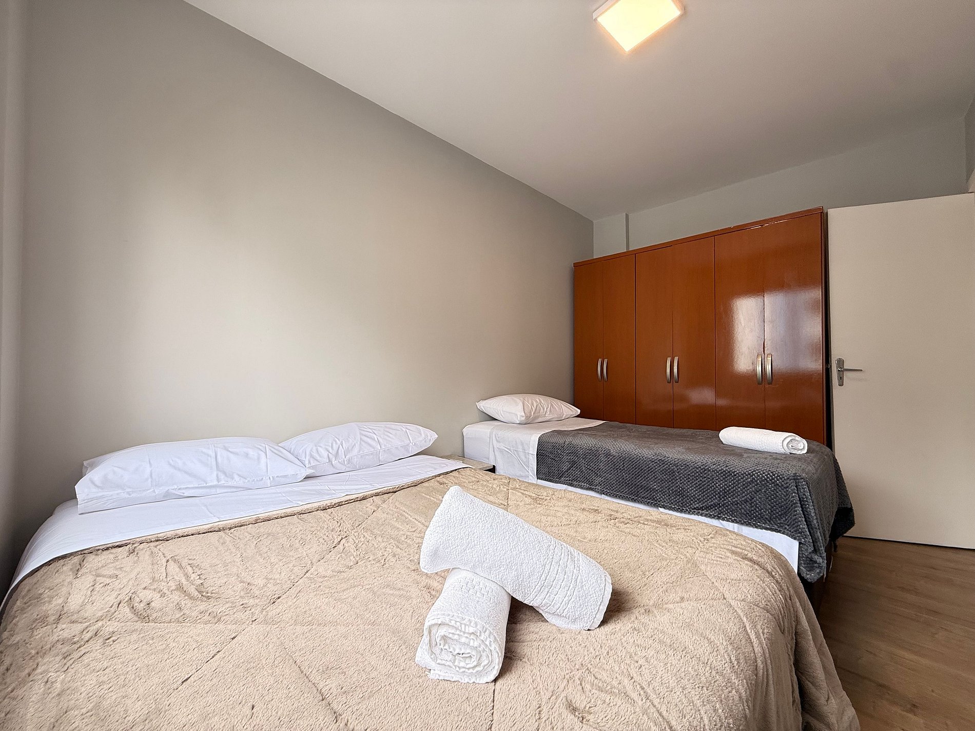 - Quarto 1: Cama de casal, guarda-roupa grande e cortinas blackout.