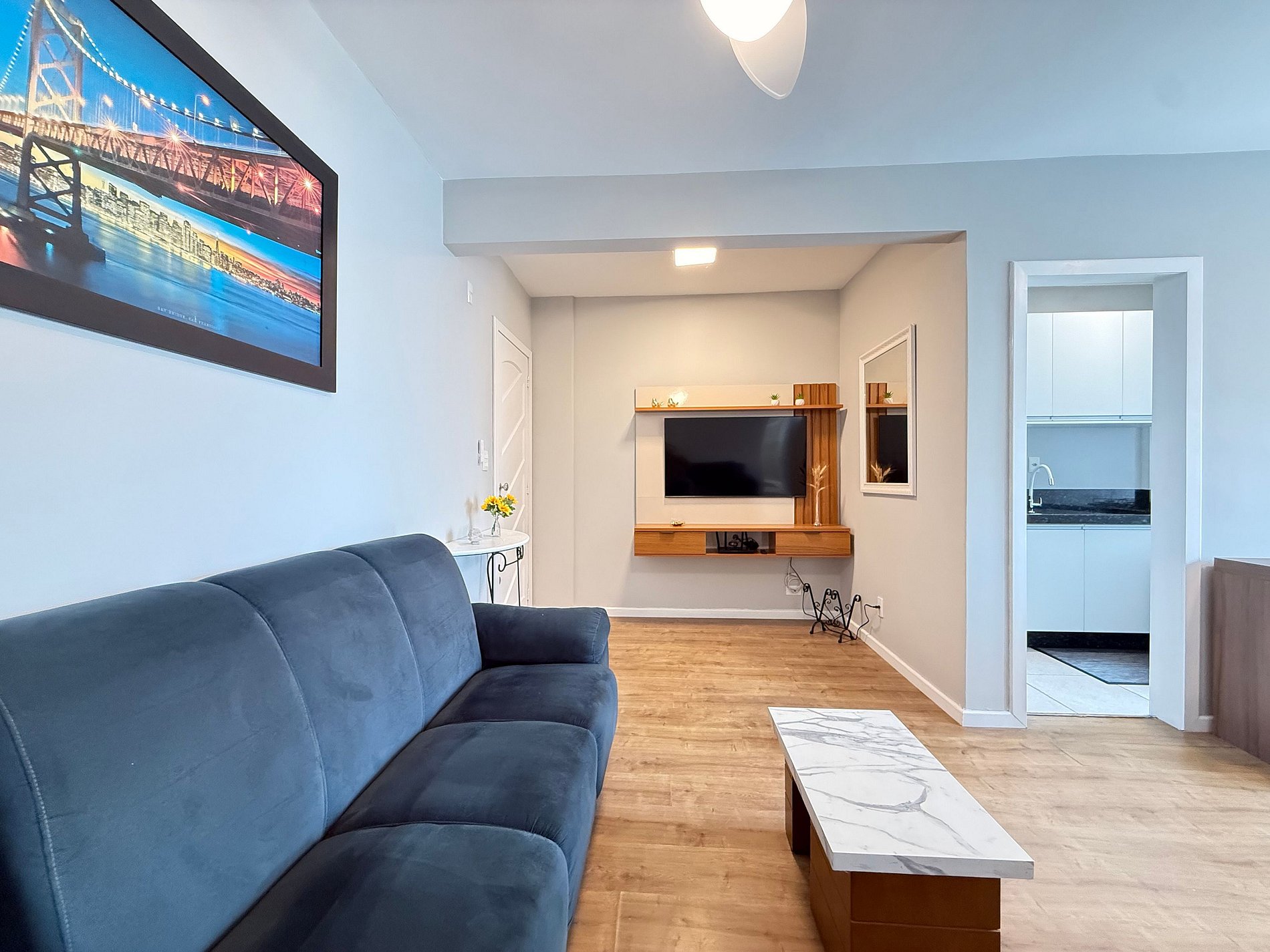 - Sala de estar ampla, com sofá confortável e TV Smart de 50" polegadas, equipada com aplicativos como Netflix, Globoplay e Amazon Prime (basta conectar sua conta).