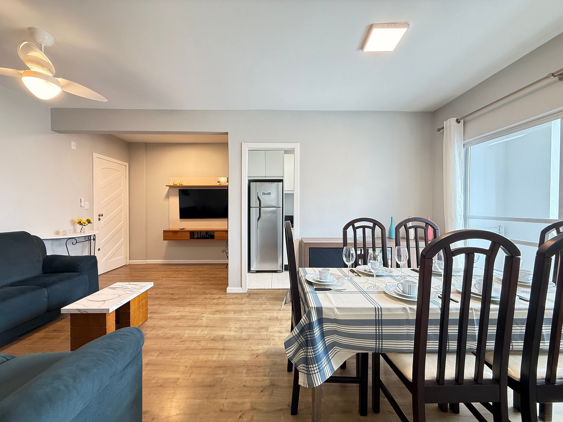A sala de TV e a área de jantar foram projetadas para criar um ambiente acolhedor e funcional, perfeito para interação entre os hóspedes: