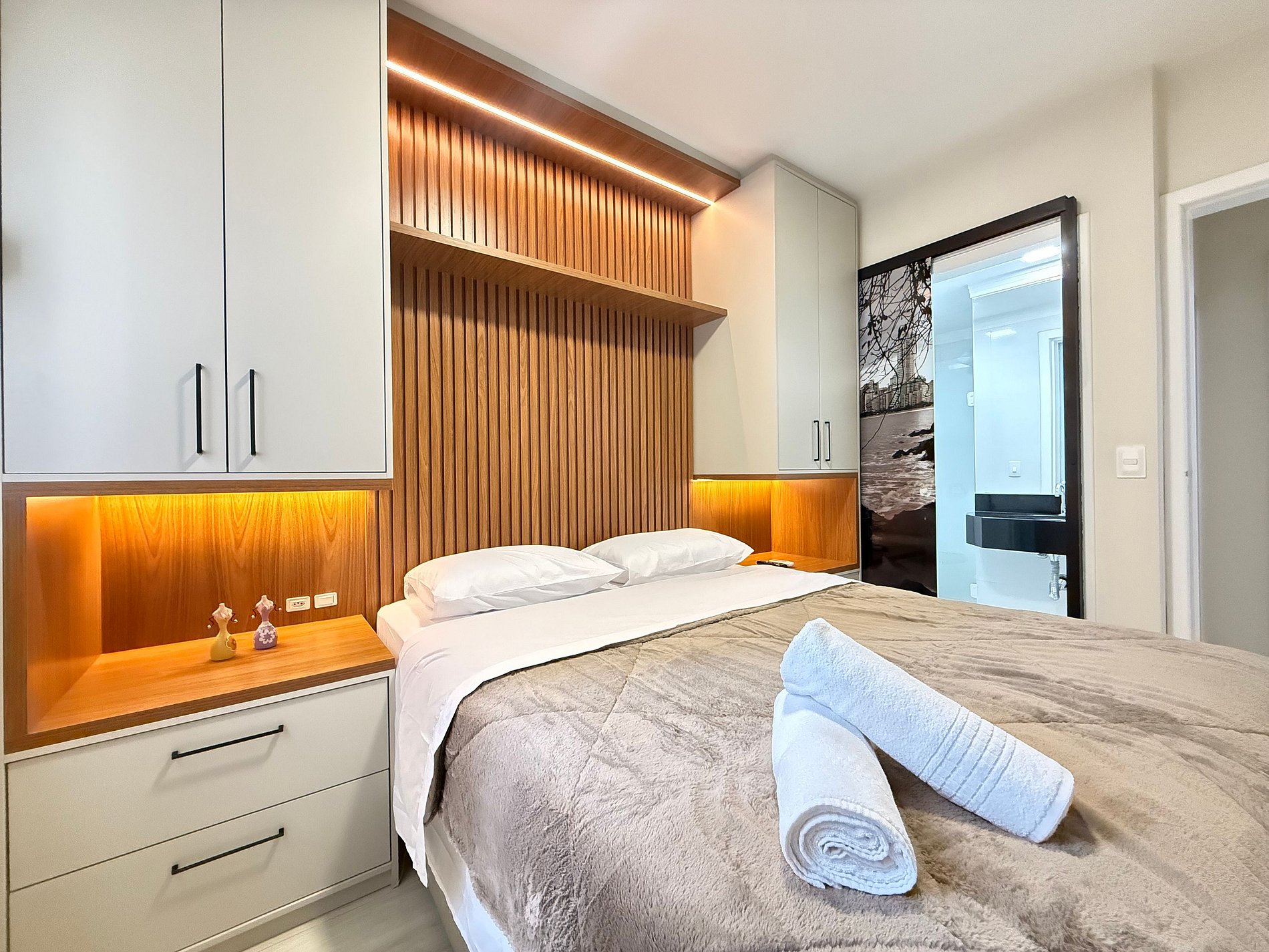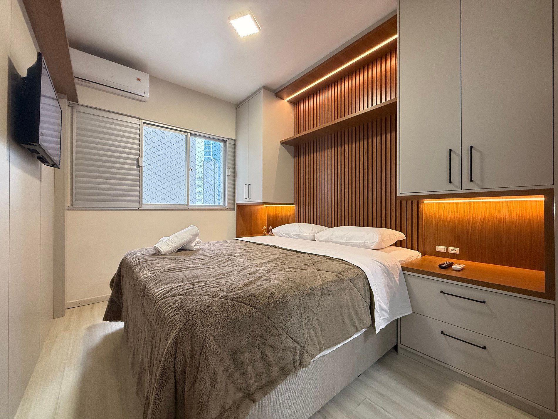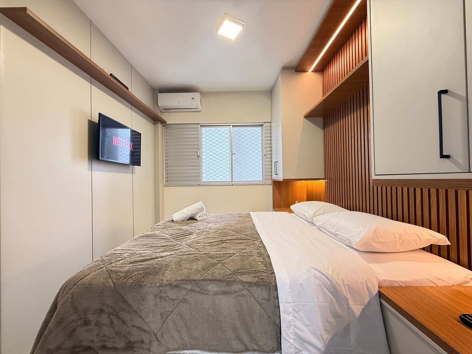 - Quarto 1 (Suíte): Cama Queen Size nova, móveis planejados com cabeceira em LED, TV Smart e banheiro completo com ducha higiênica, chuveiro eletrônico.