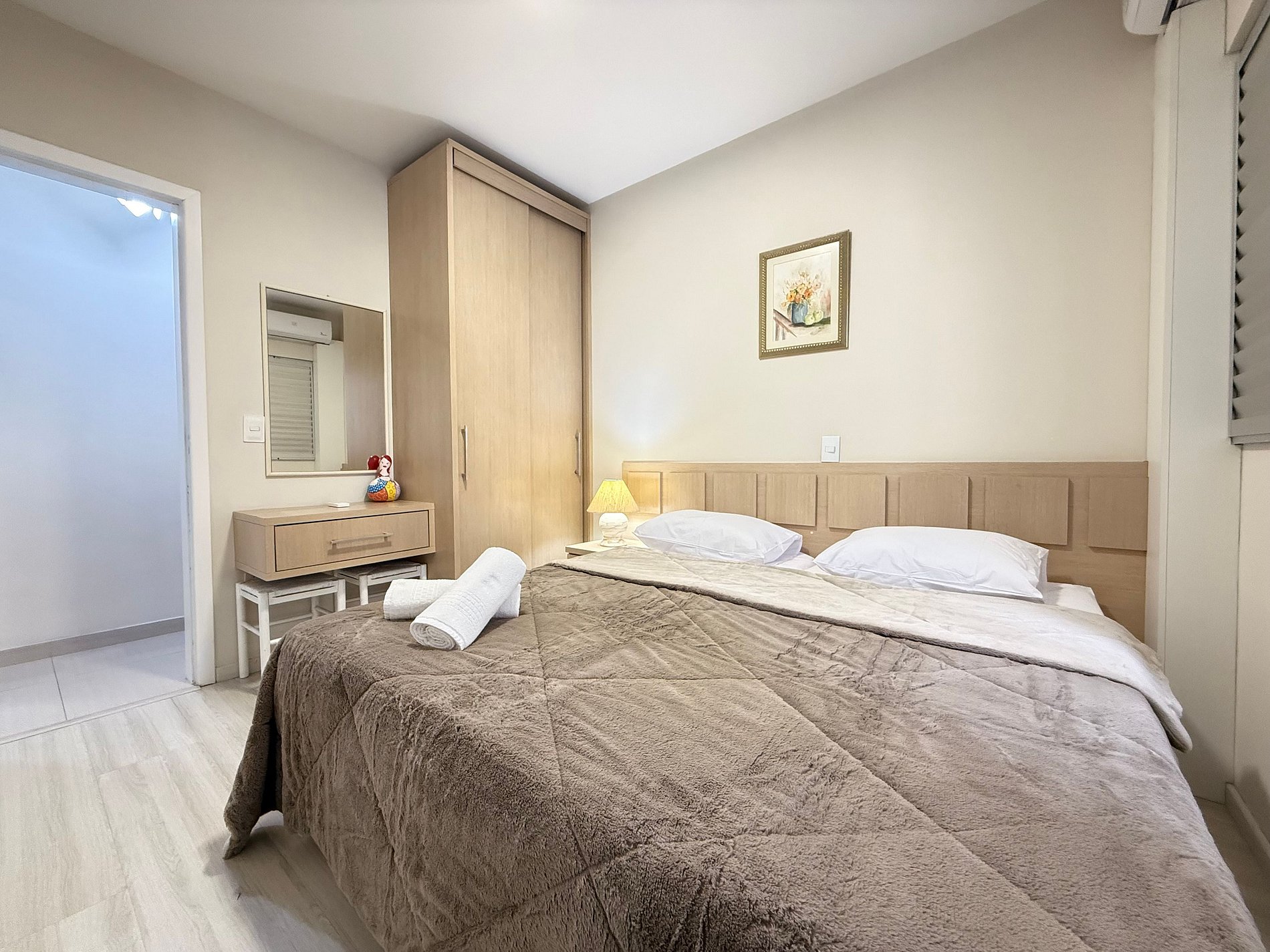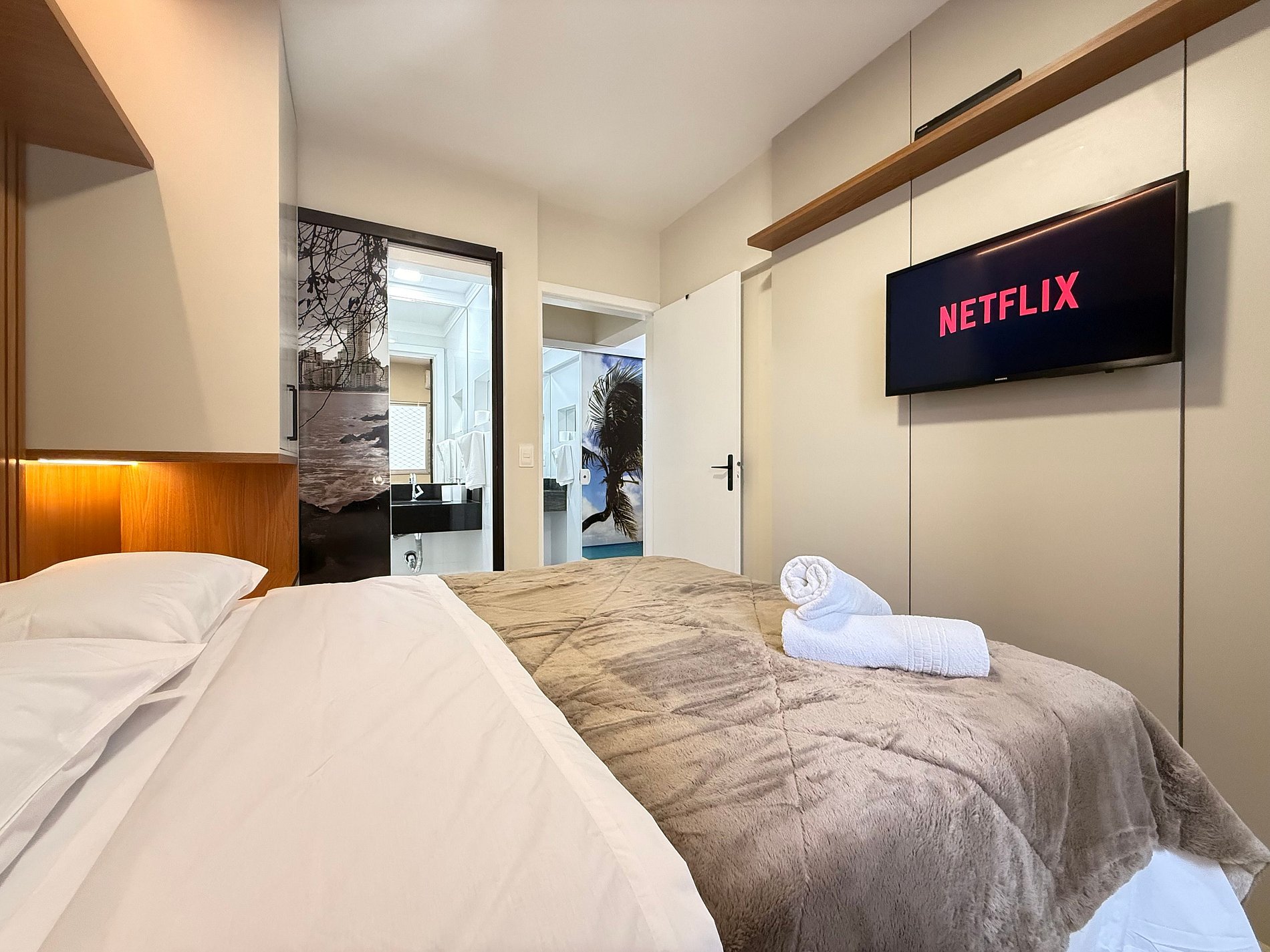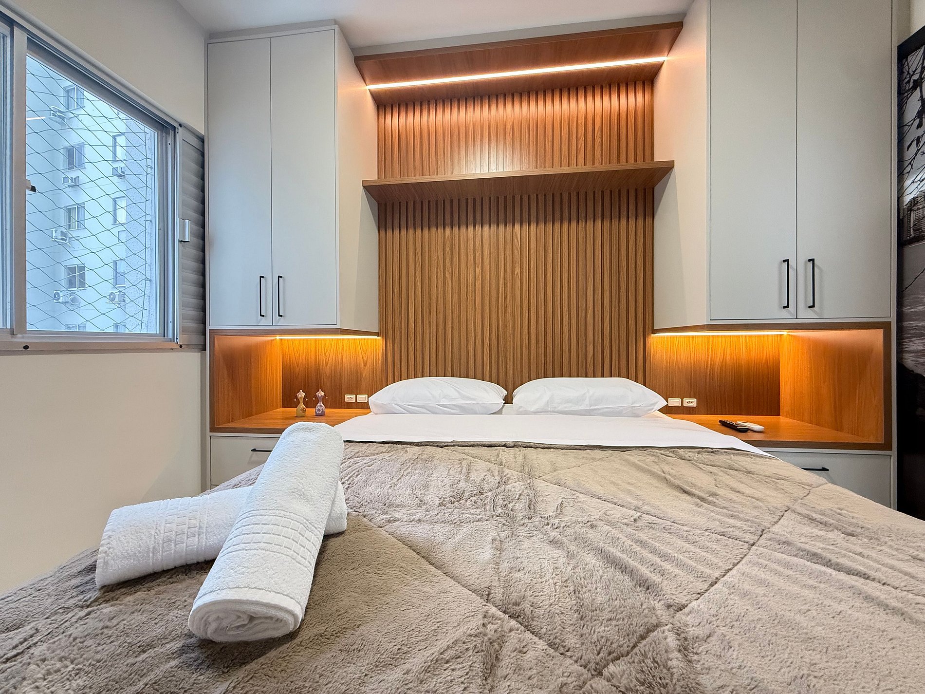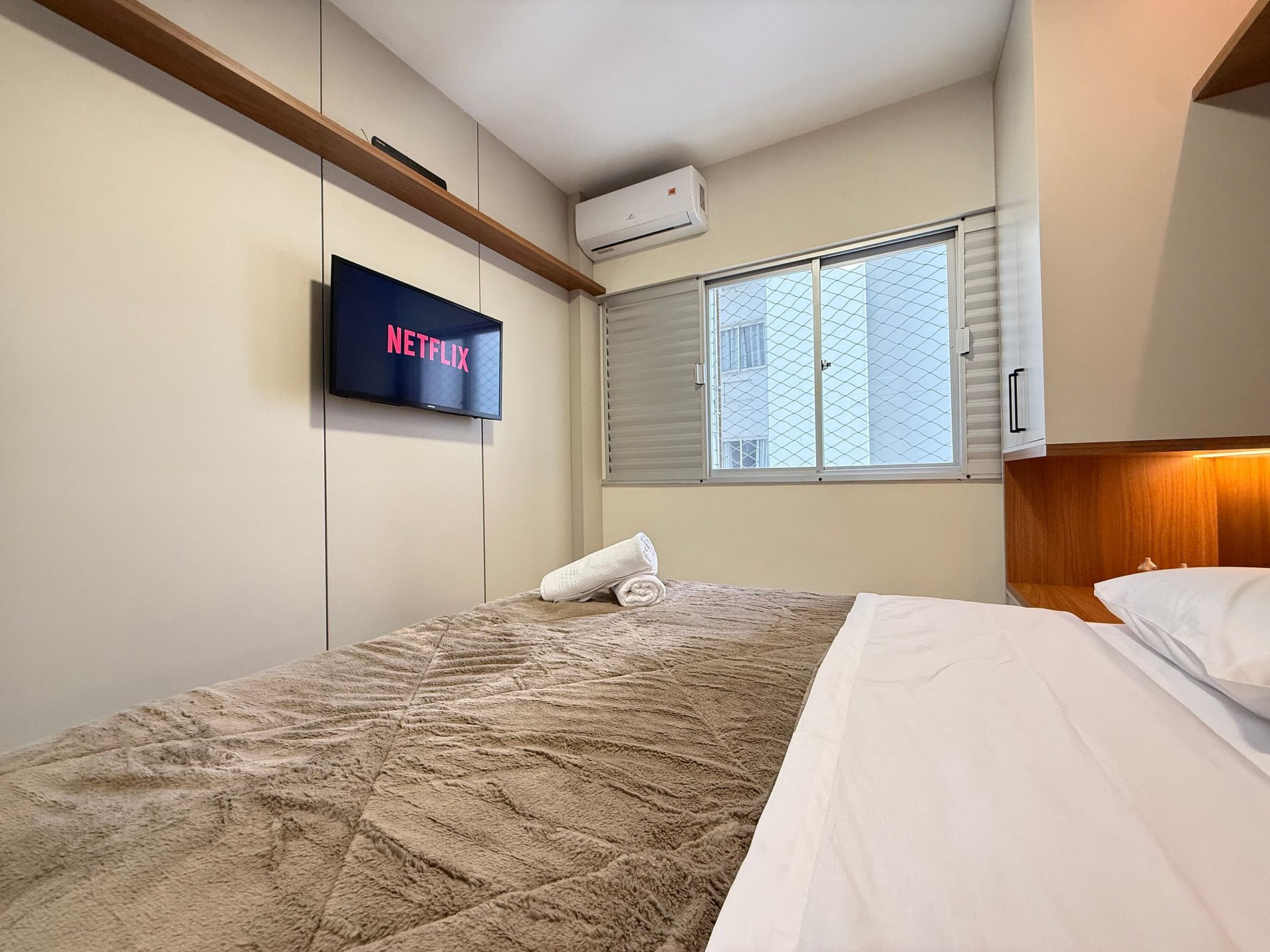 - Quarto 1 (Suíte): Cama Queen Size nova, móveis planejados com cabeceira em LED, TV Smart e banheiro completo com ducha higiênica, chuveiro eletrônico.