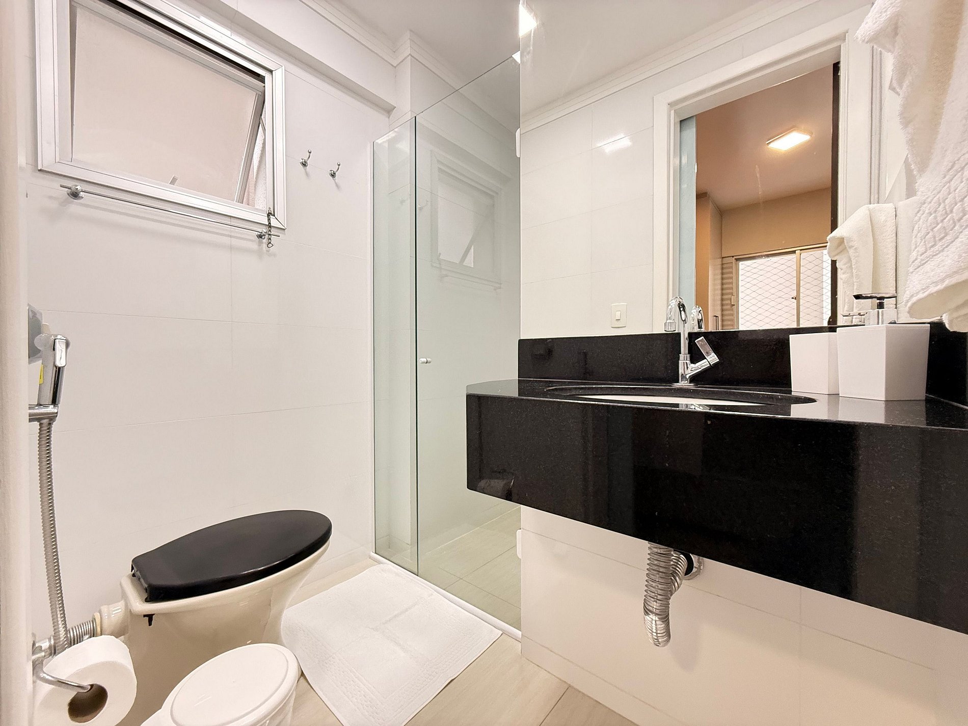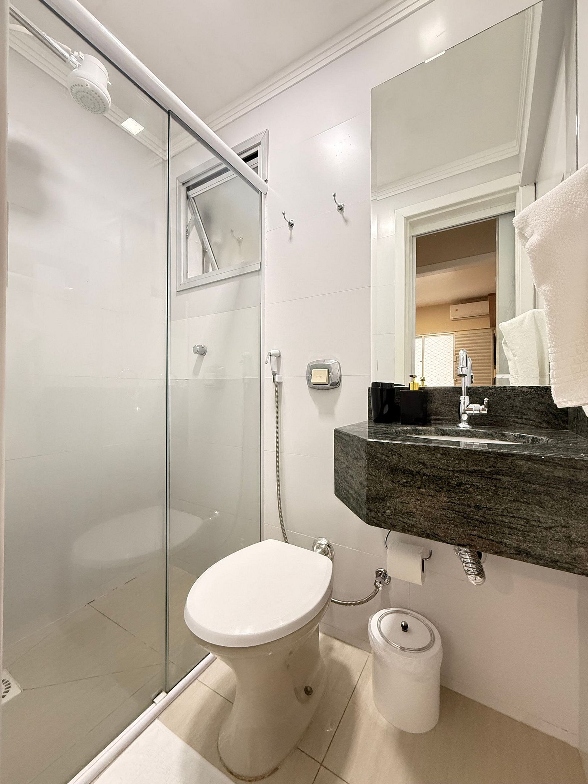 - Banheiro social completo, com ducha higiênica, chuveiro eletrônico, secador de cabelo e ferro de passar.