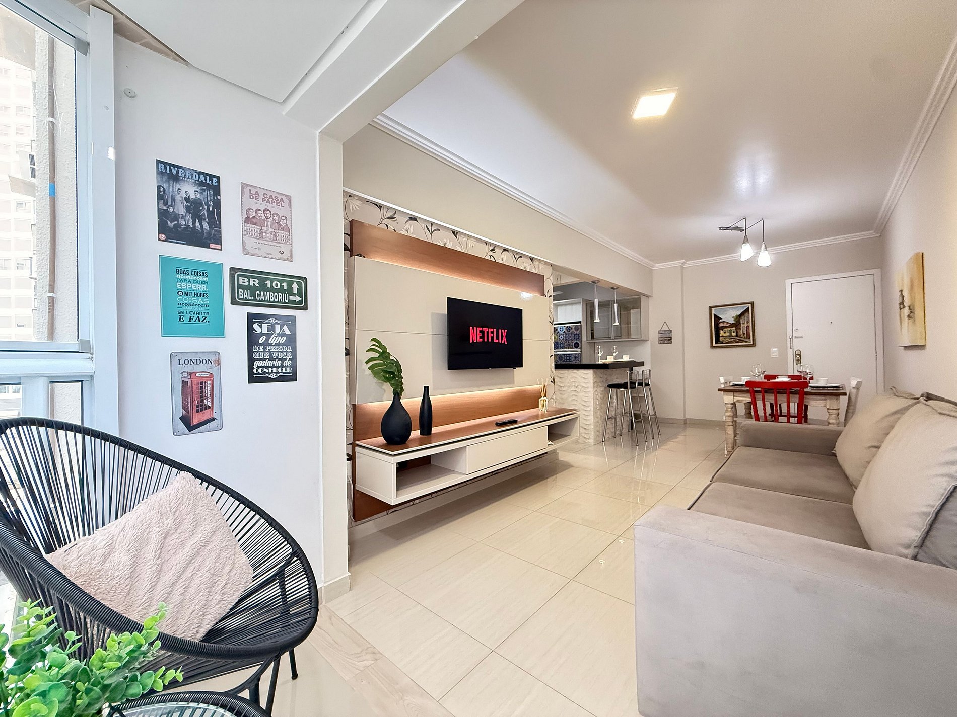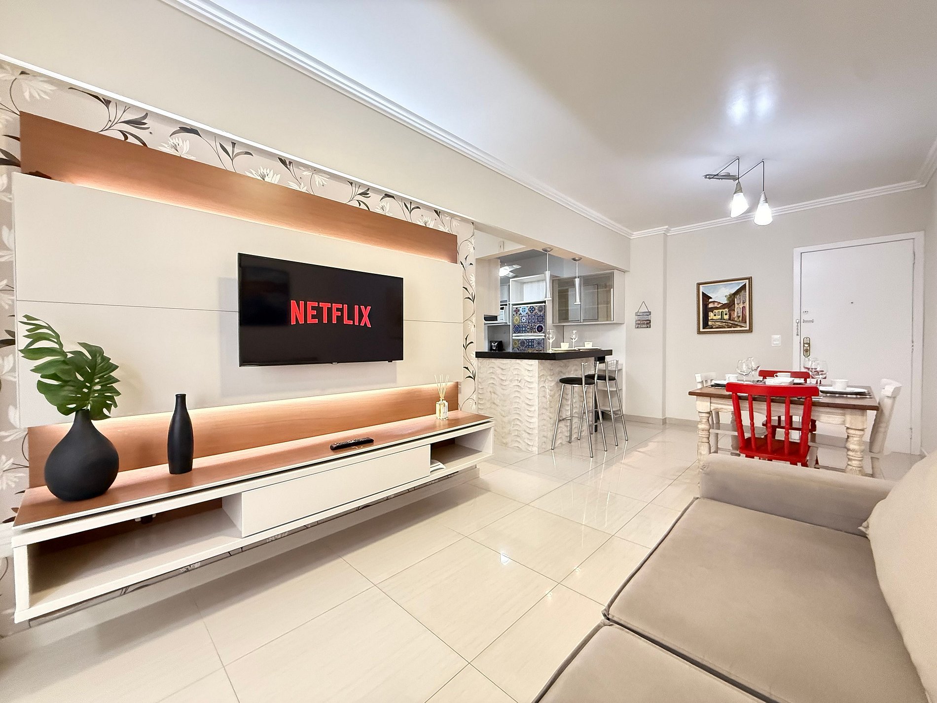 - Sala de estar com TV Smart de 47", equipada com canais a cabo e aplicativos como Netflix, Globoplay e Amazon Prime (basta conectar sua conta).