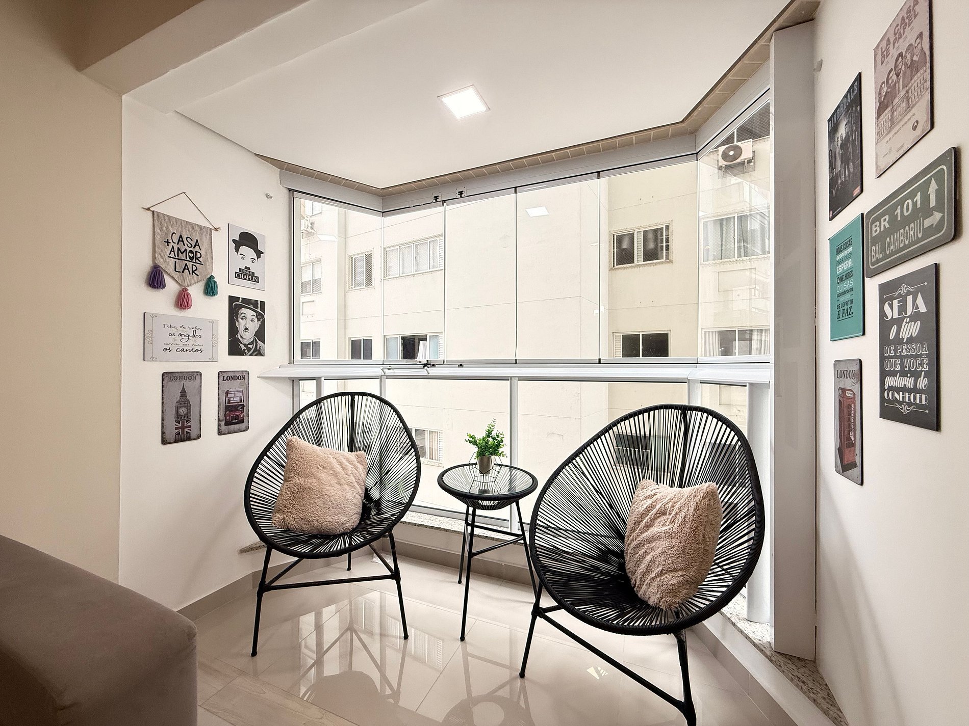 - Varanda integrada à sala aconchegante, com poltronas para leitura e relaxamento.
