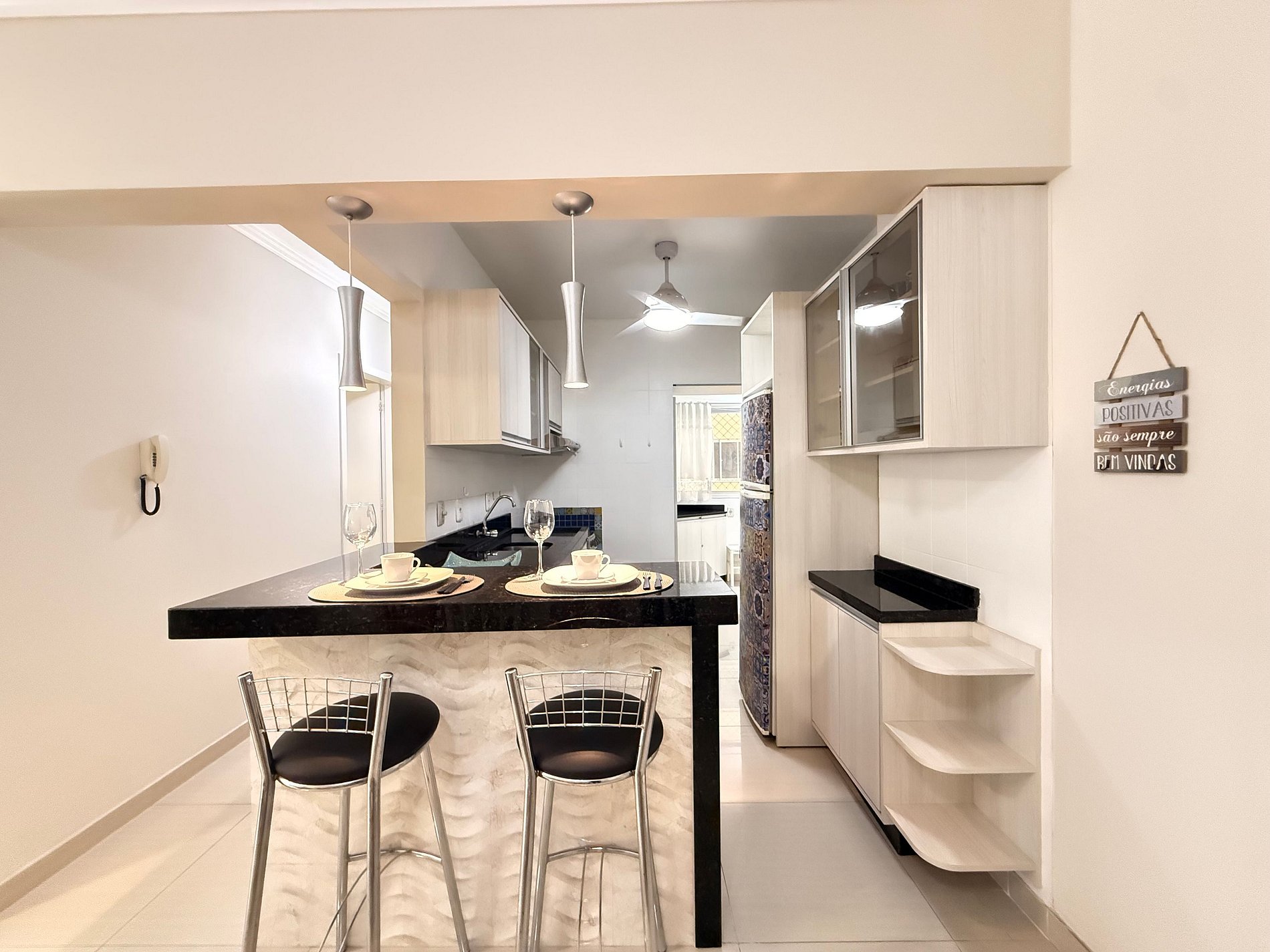 Cozinha completa, equipada com tudo que você precisa para estadias curtas ou longas: