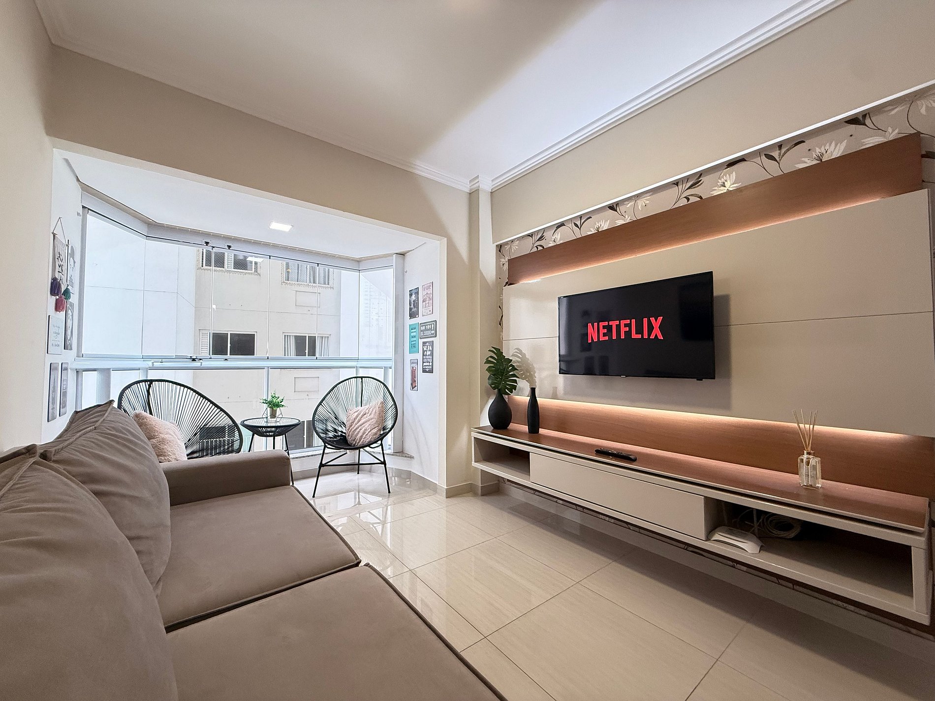 - Sala de estar com TV Smart de 47", equipada com canais a cabo e aplicativos como Netflix, Globoplay e Amazon Prime (basta conectar sua conta).