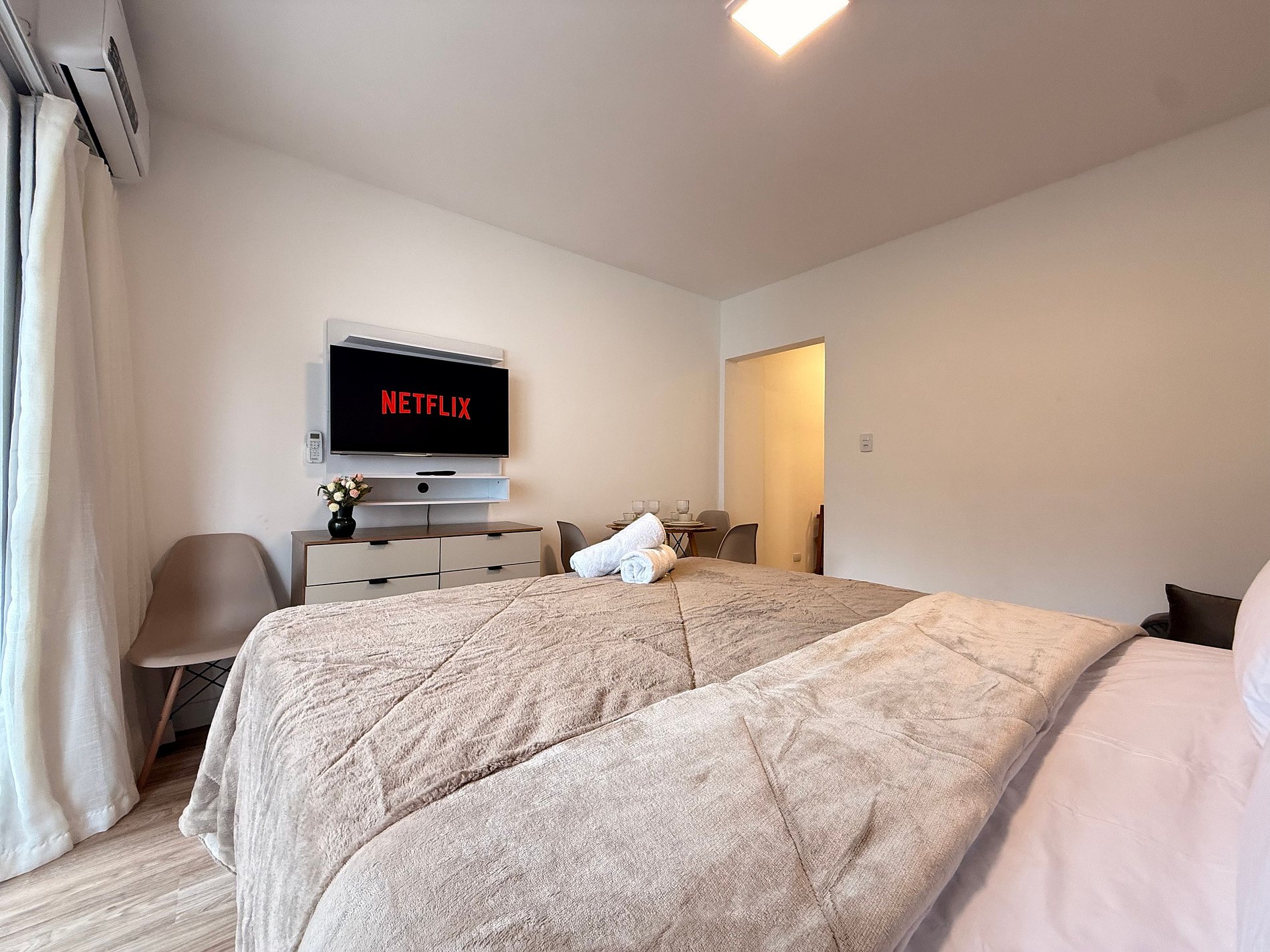- 1 quarto climatizado com cama queen size nova, cortinas blackout e ar-condicionado split.