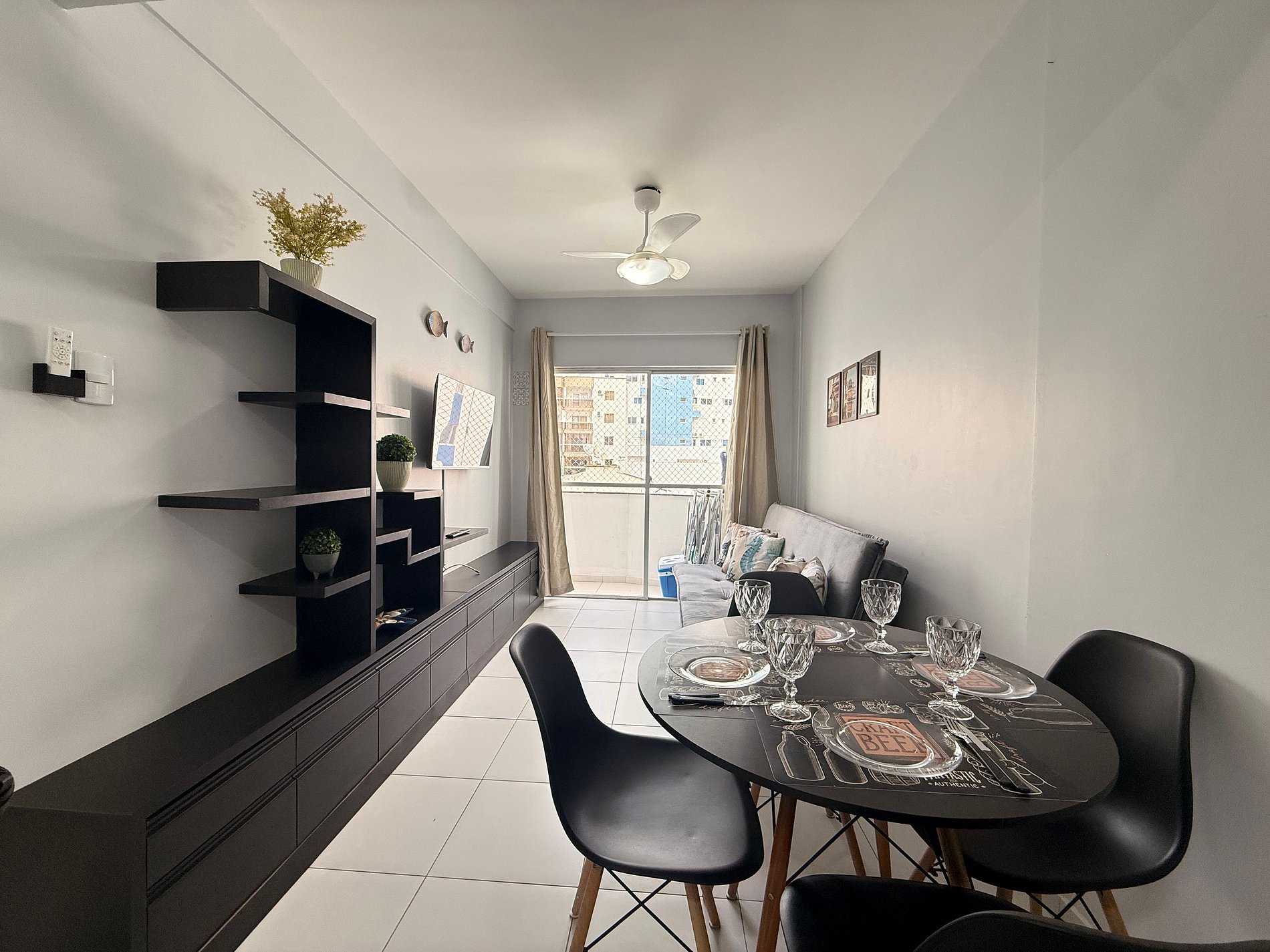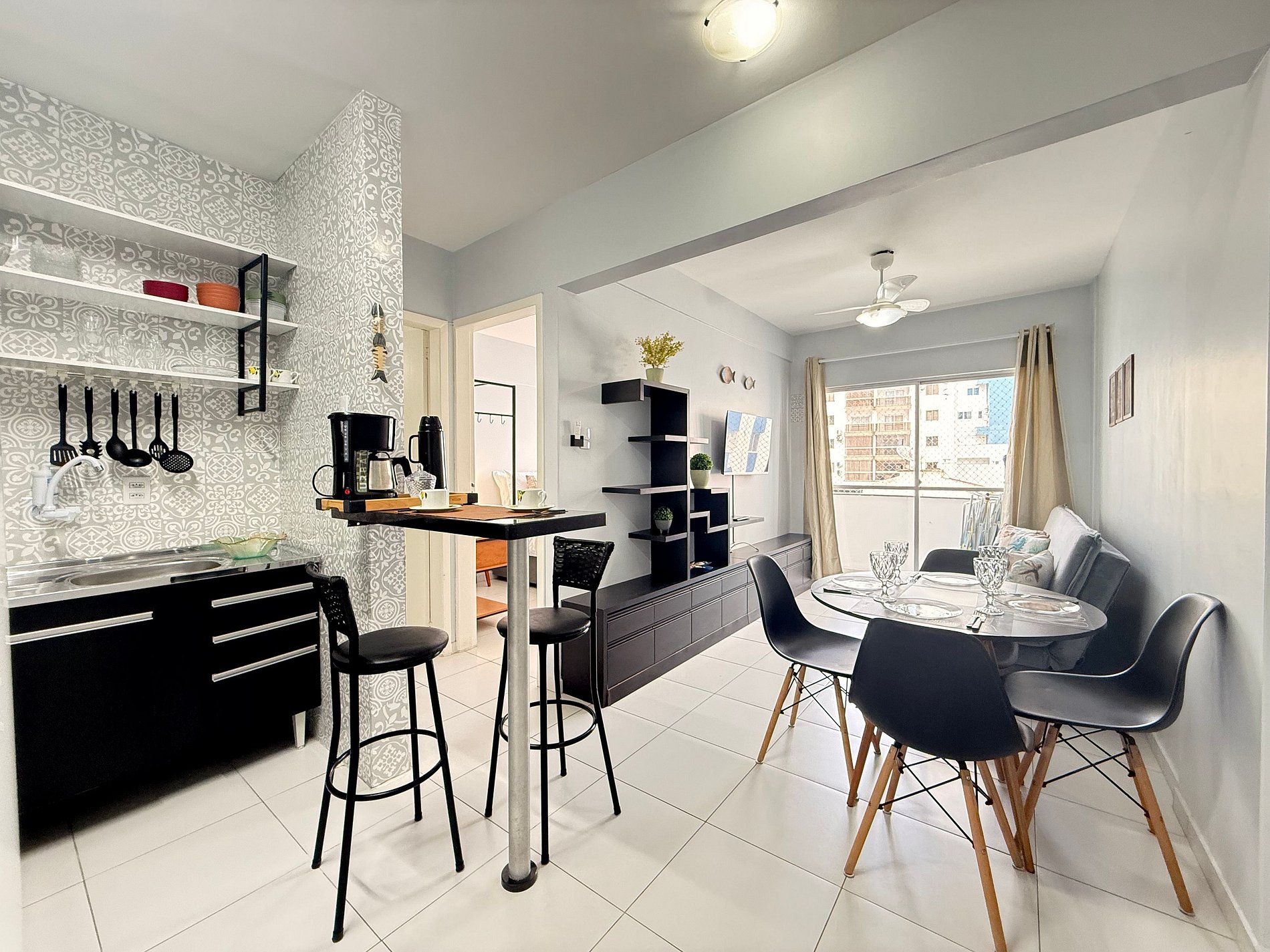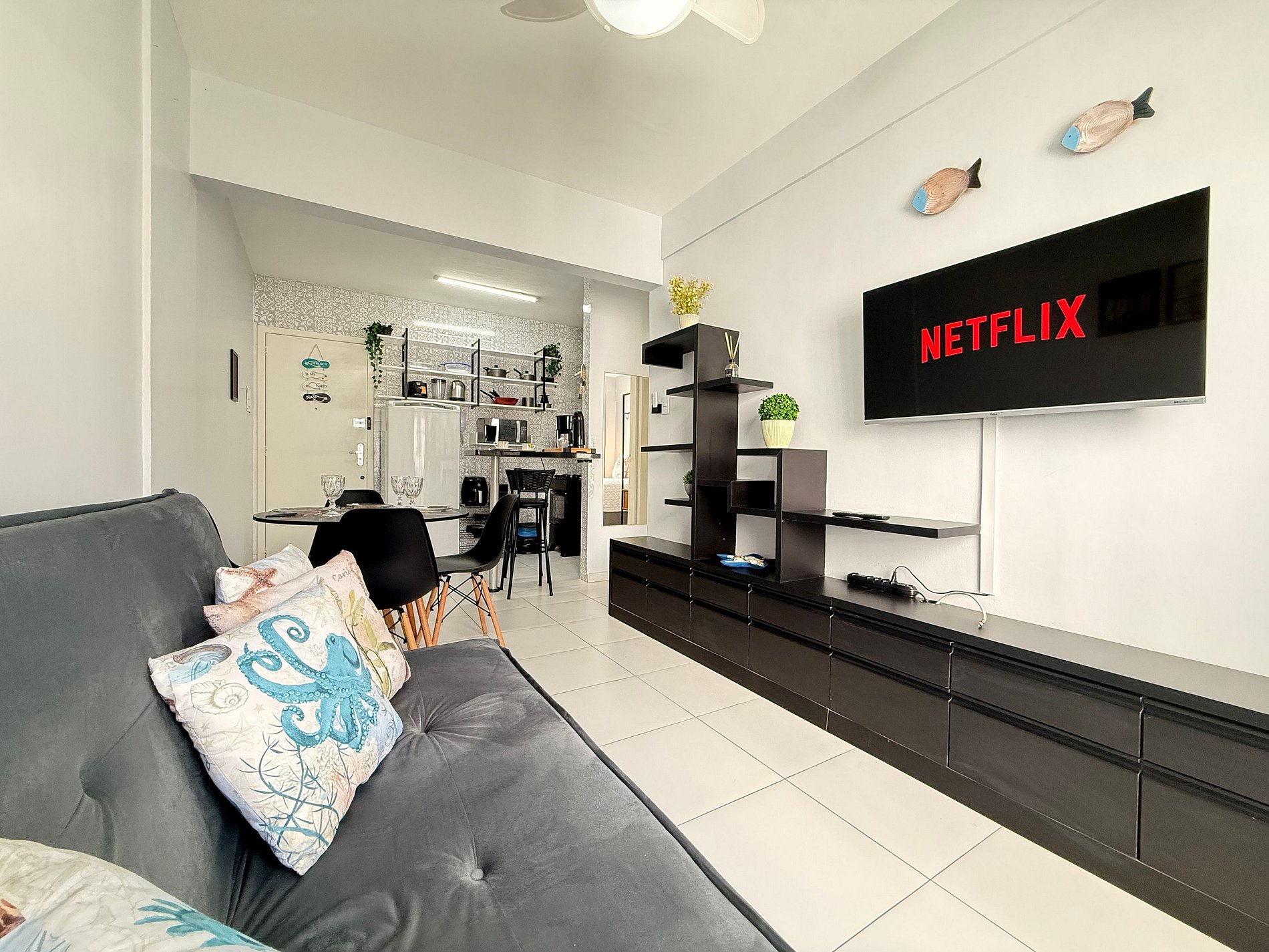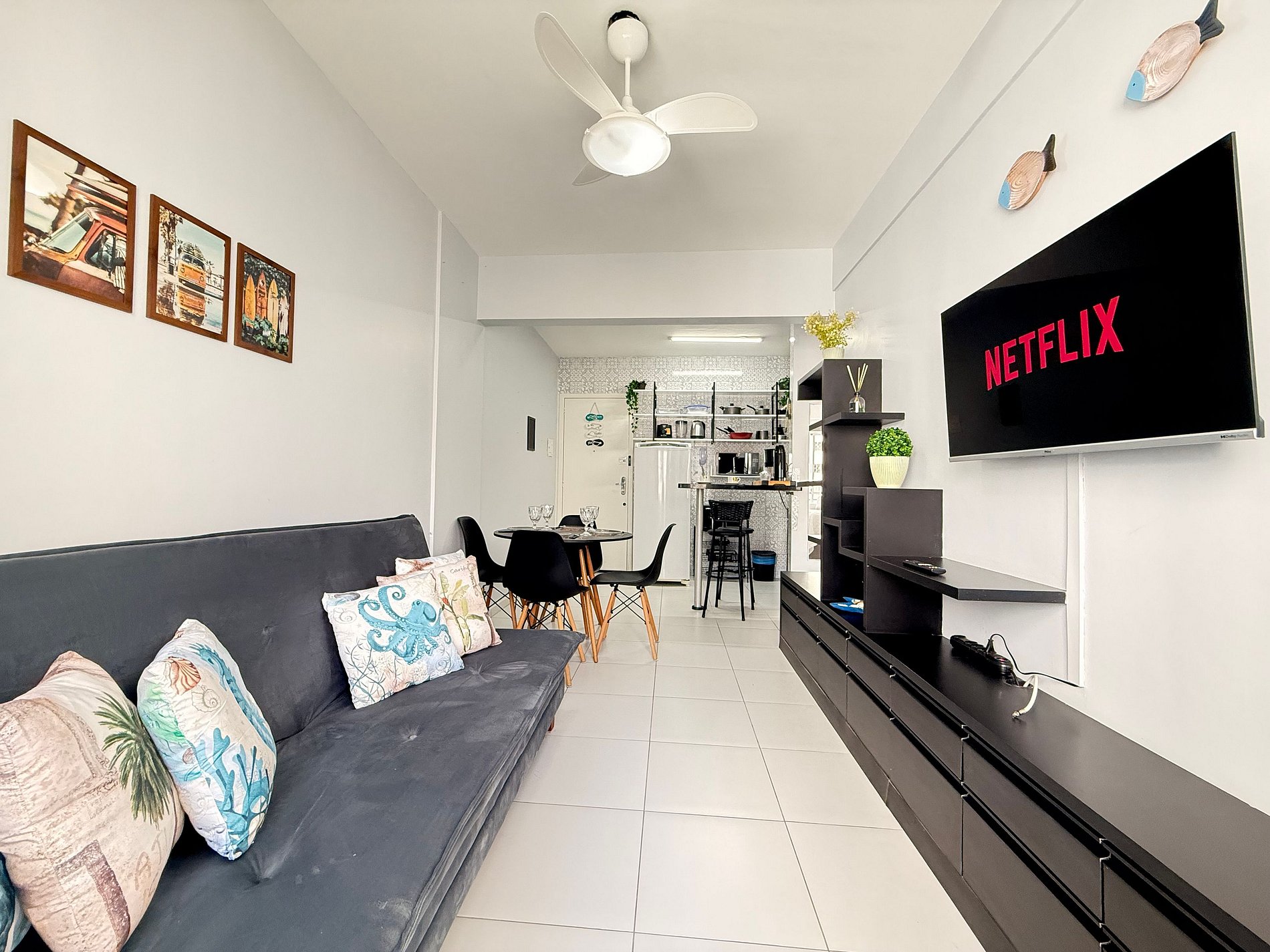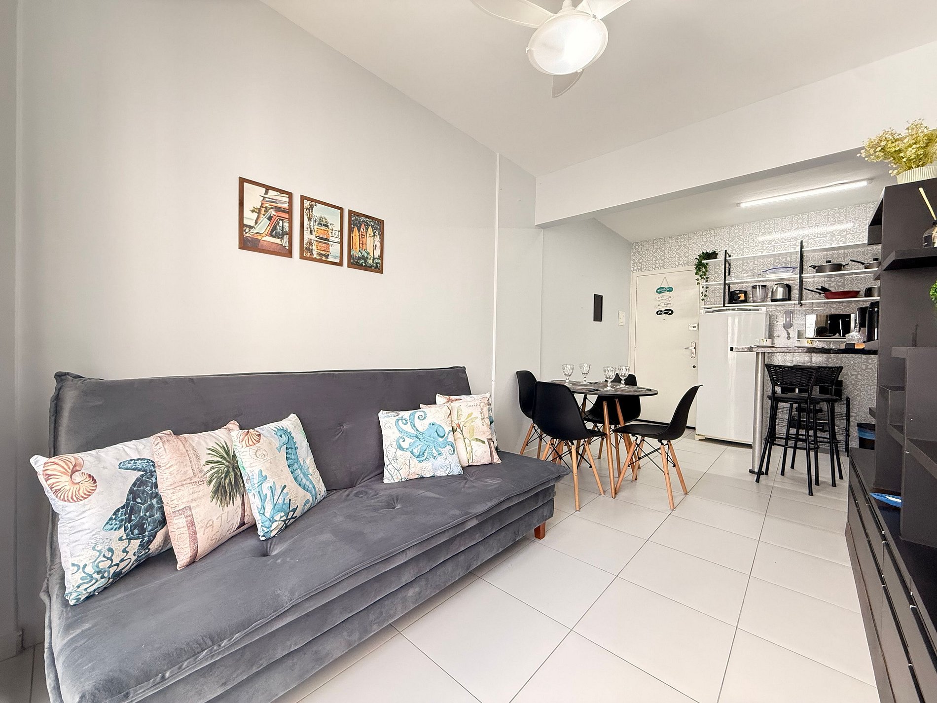 - Sala integrada à cozinha, com ventilador de teto e ambiente bem arejado.
