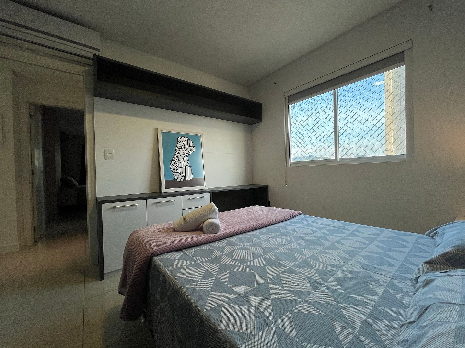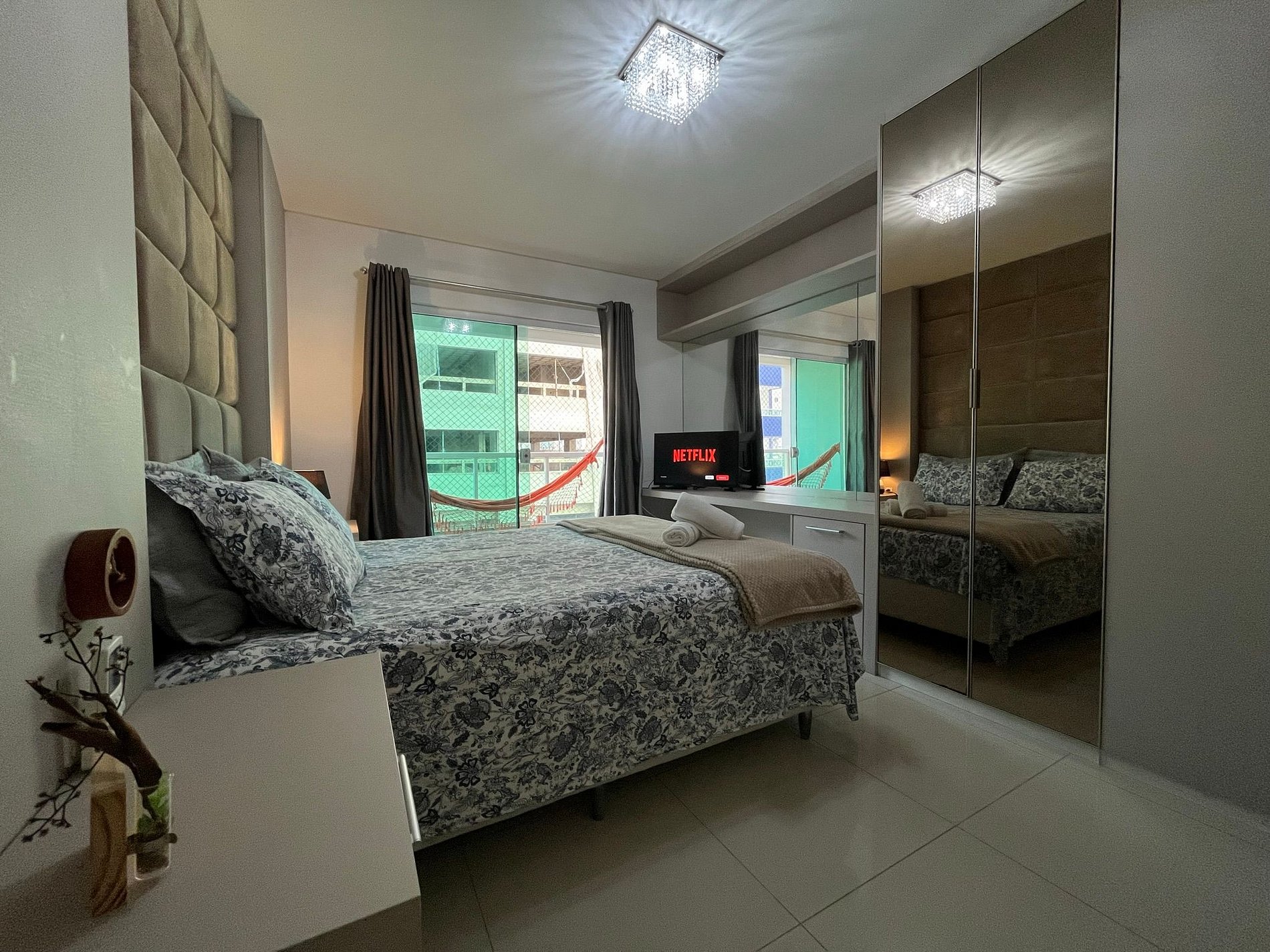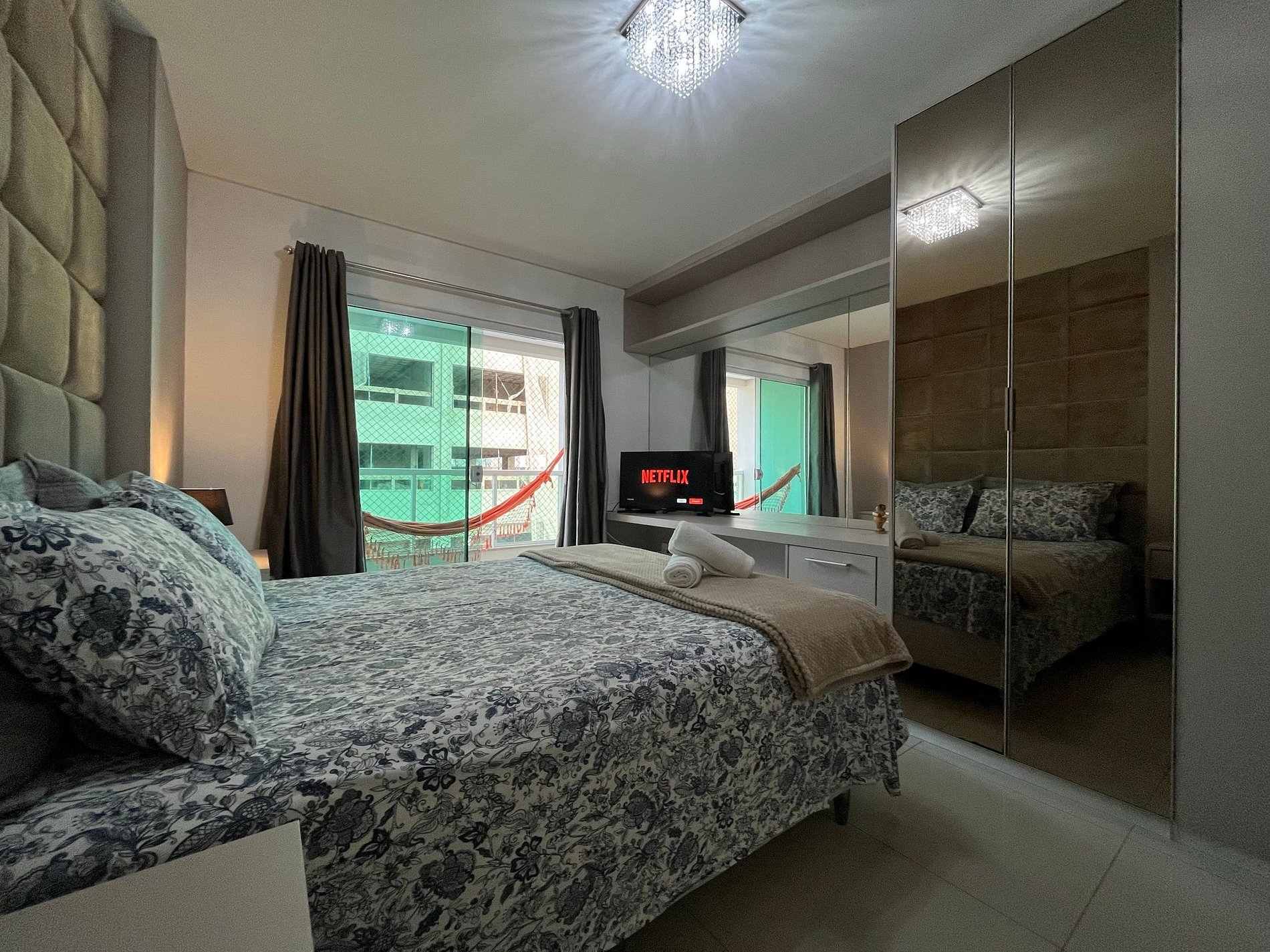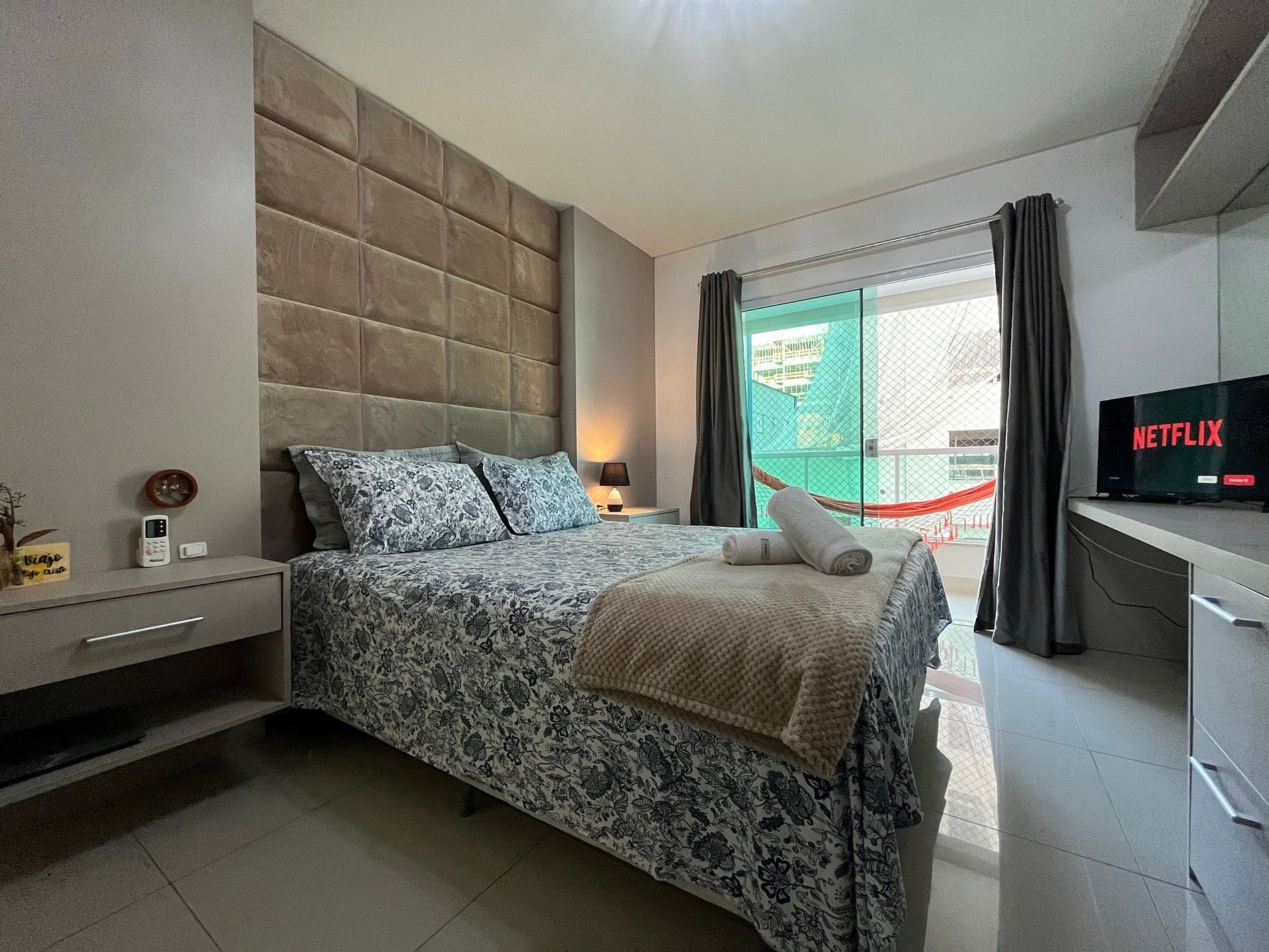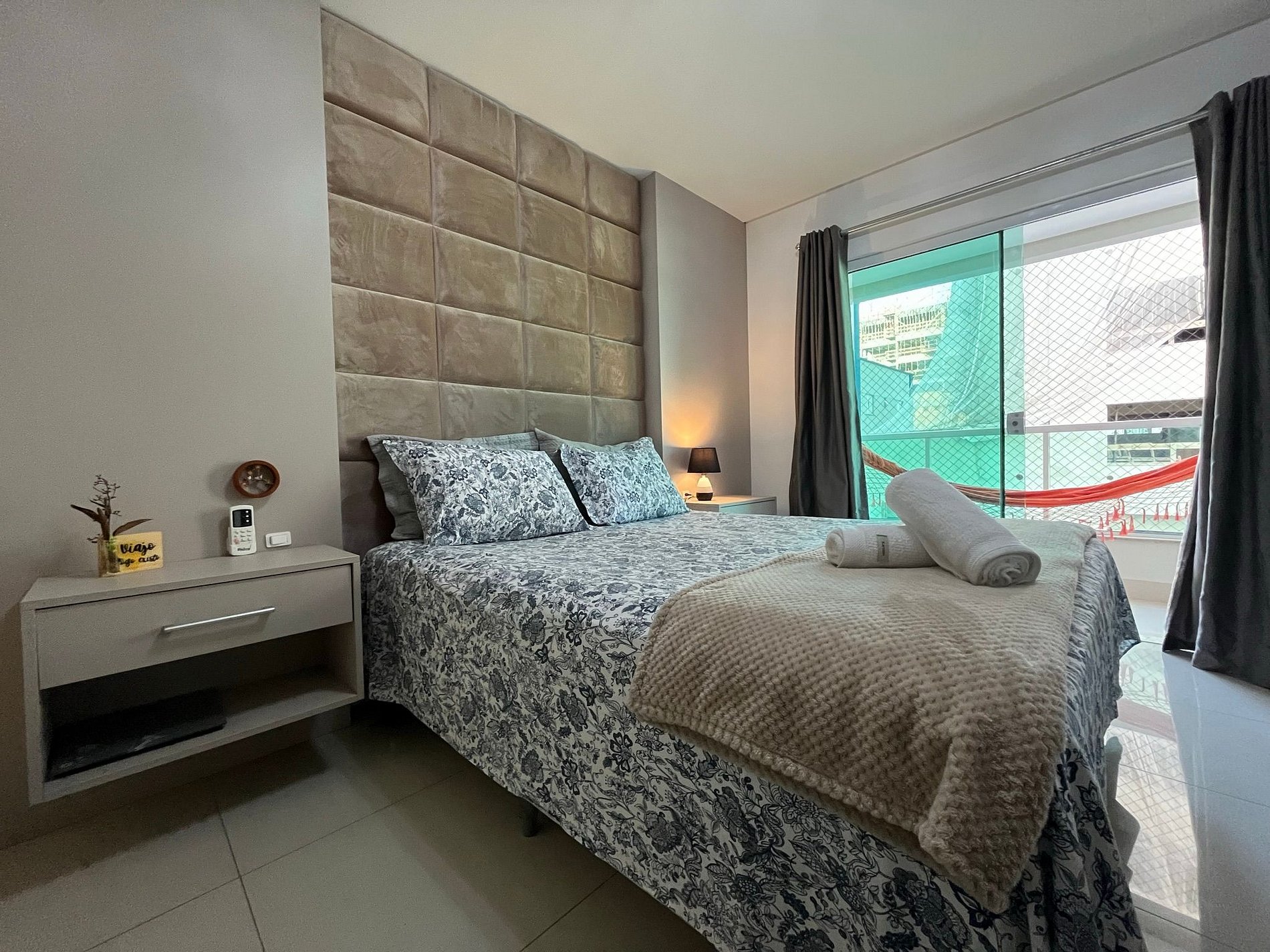- QUARTO 1: Cama de casal Queen Size com ar condicionado split, sacada privativa com rede, guarda roupas