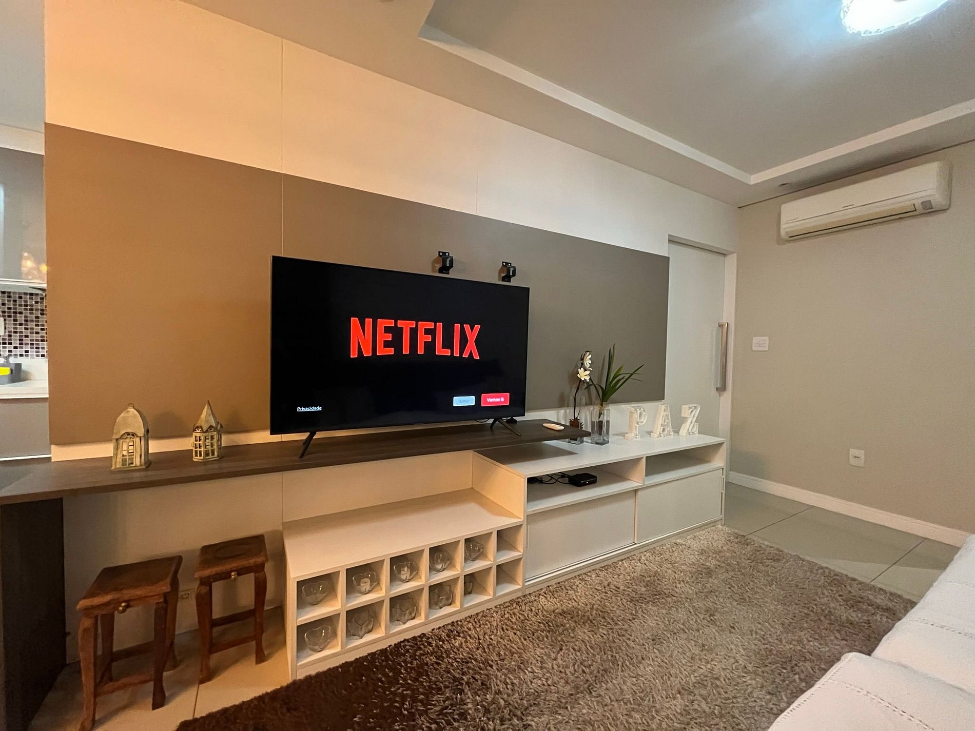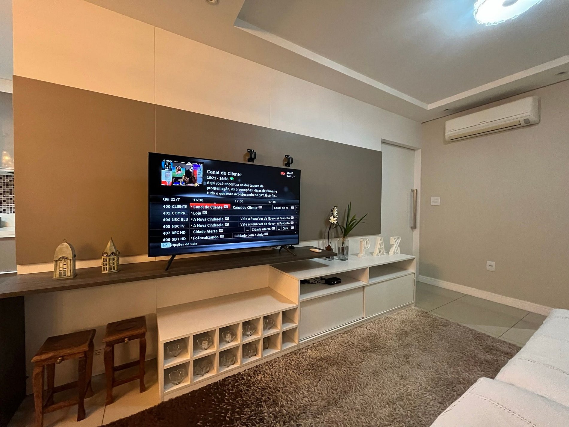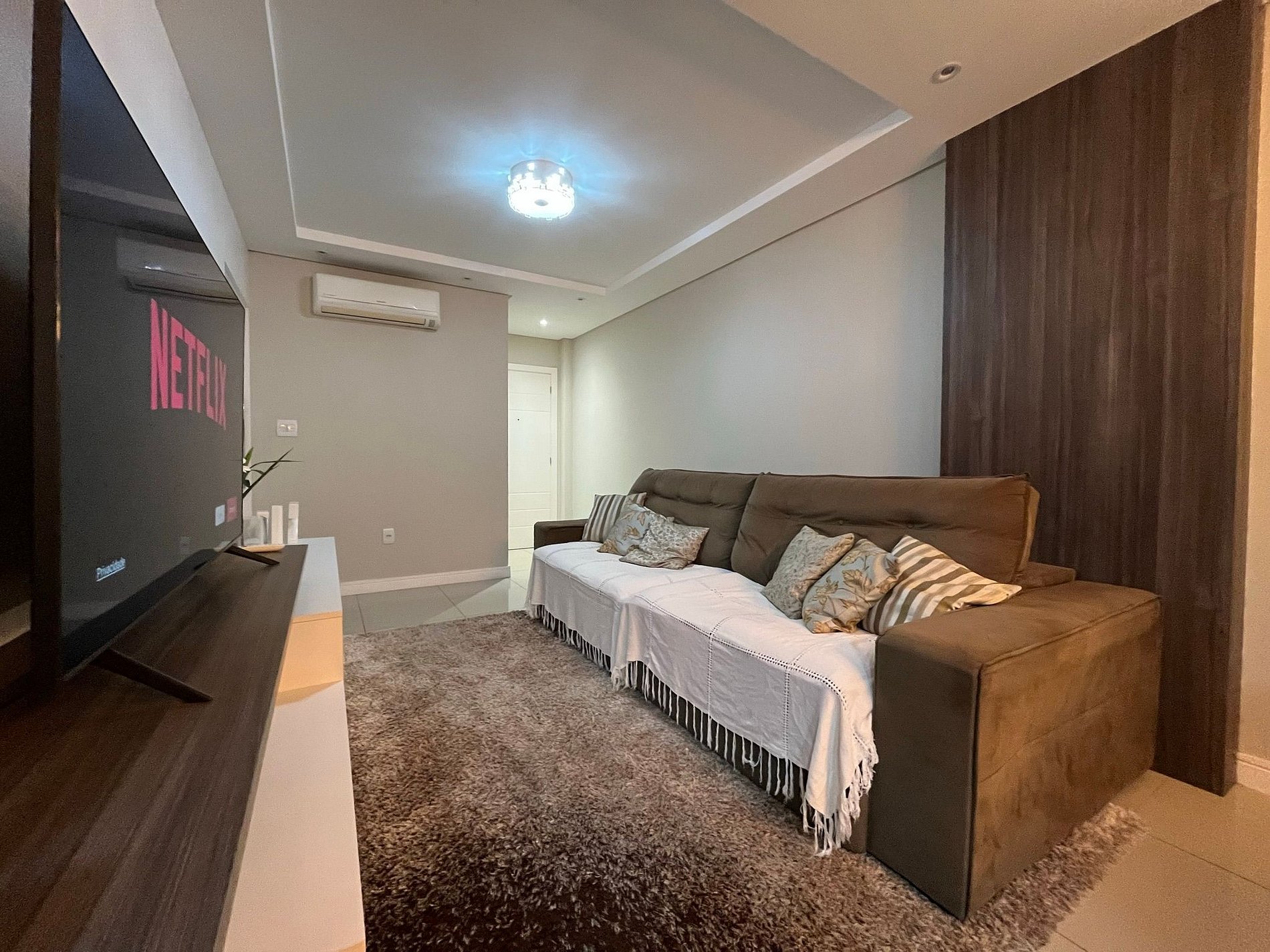 - Sala com sofá grande e confortável com assento retrátil e ar condicionado split