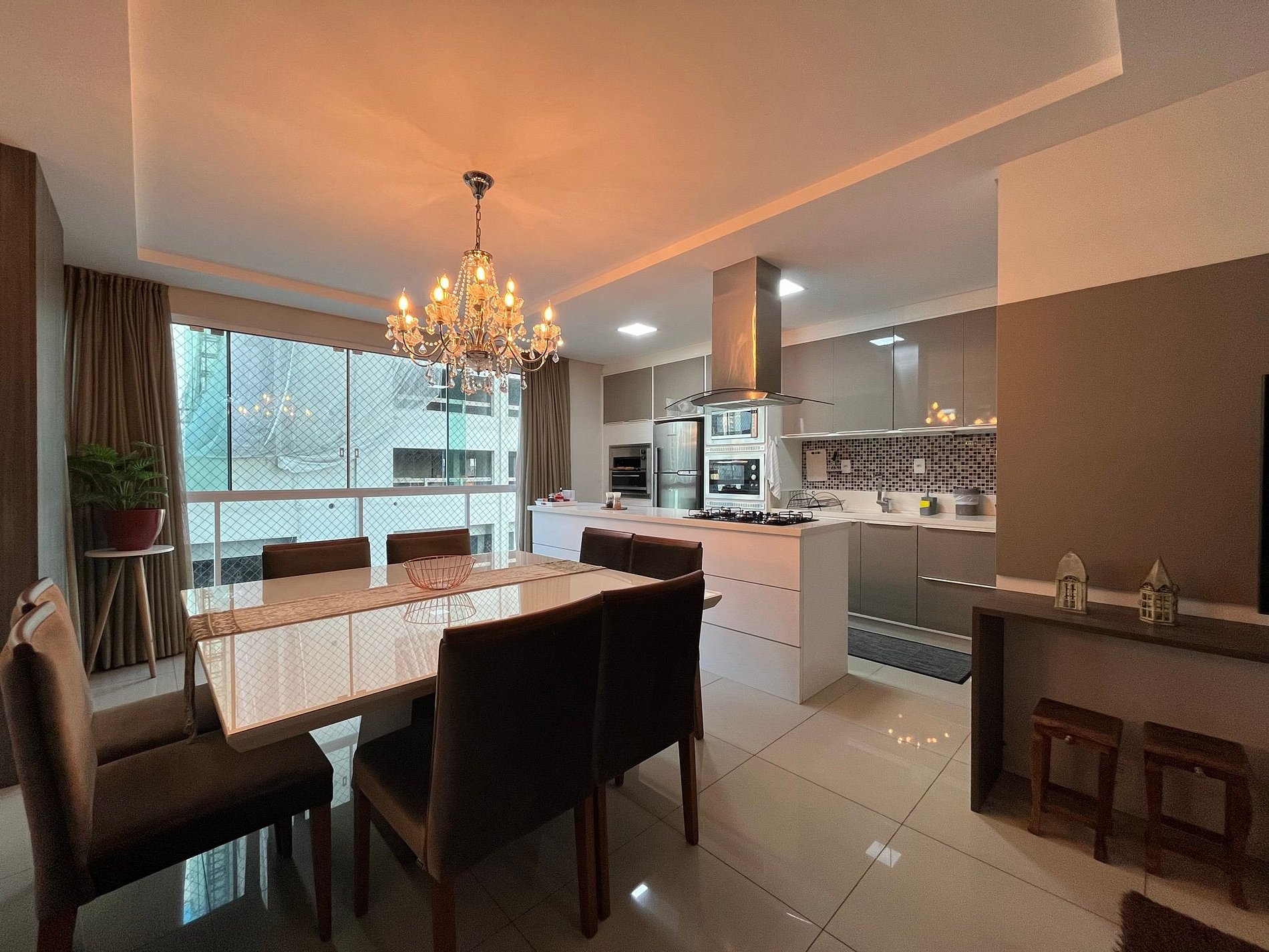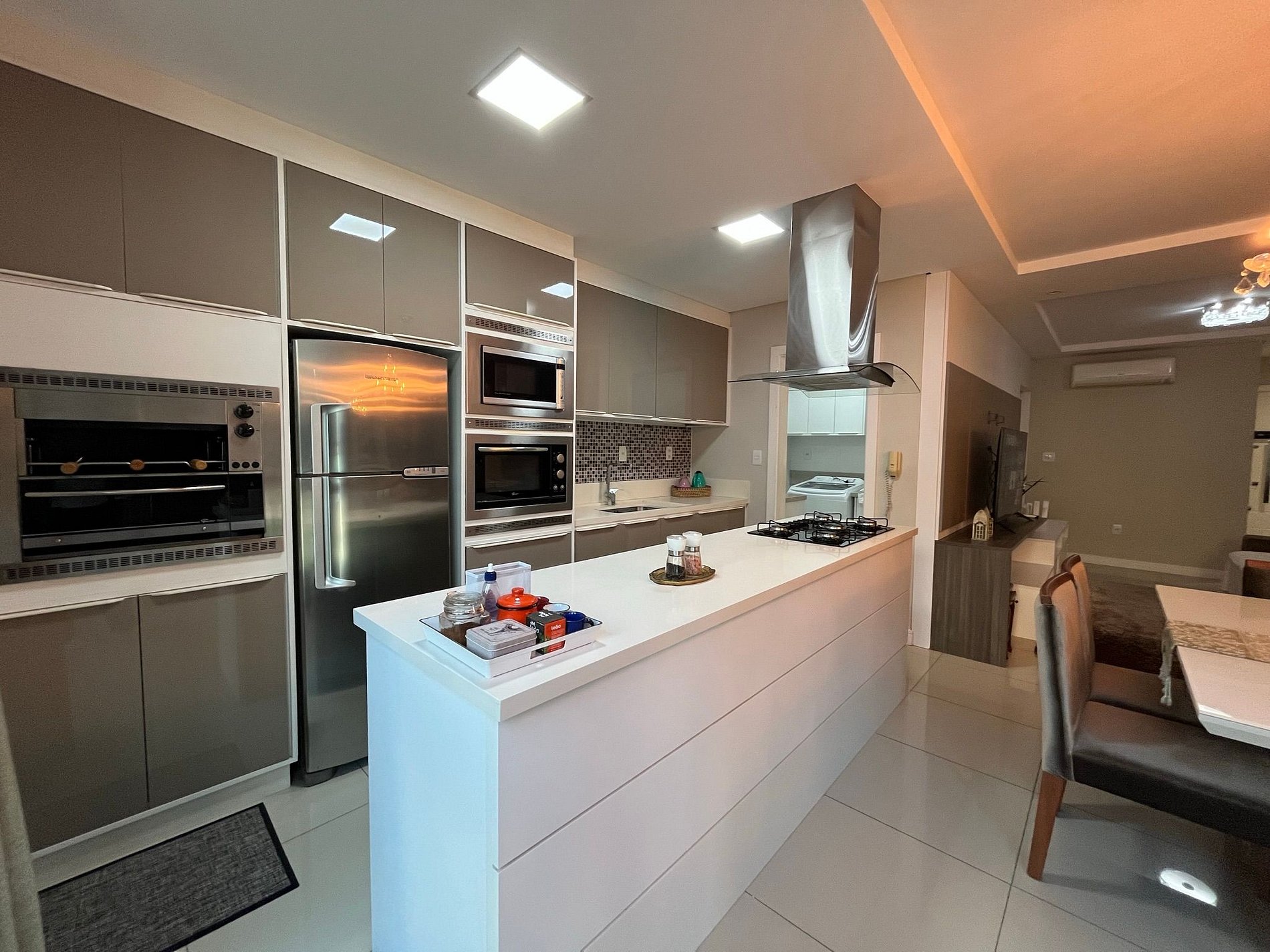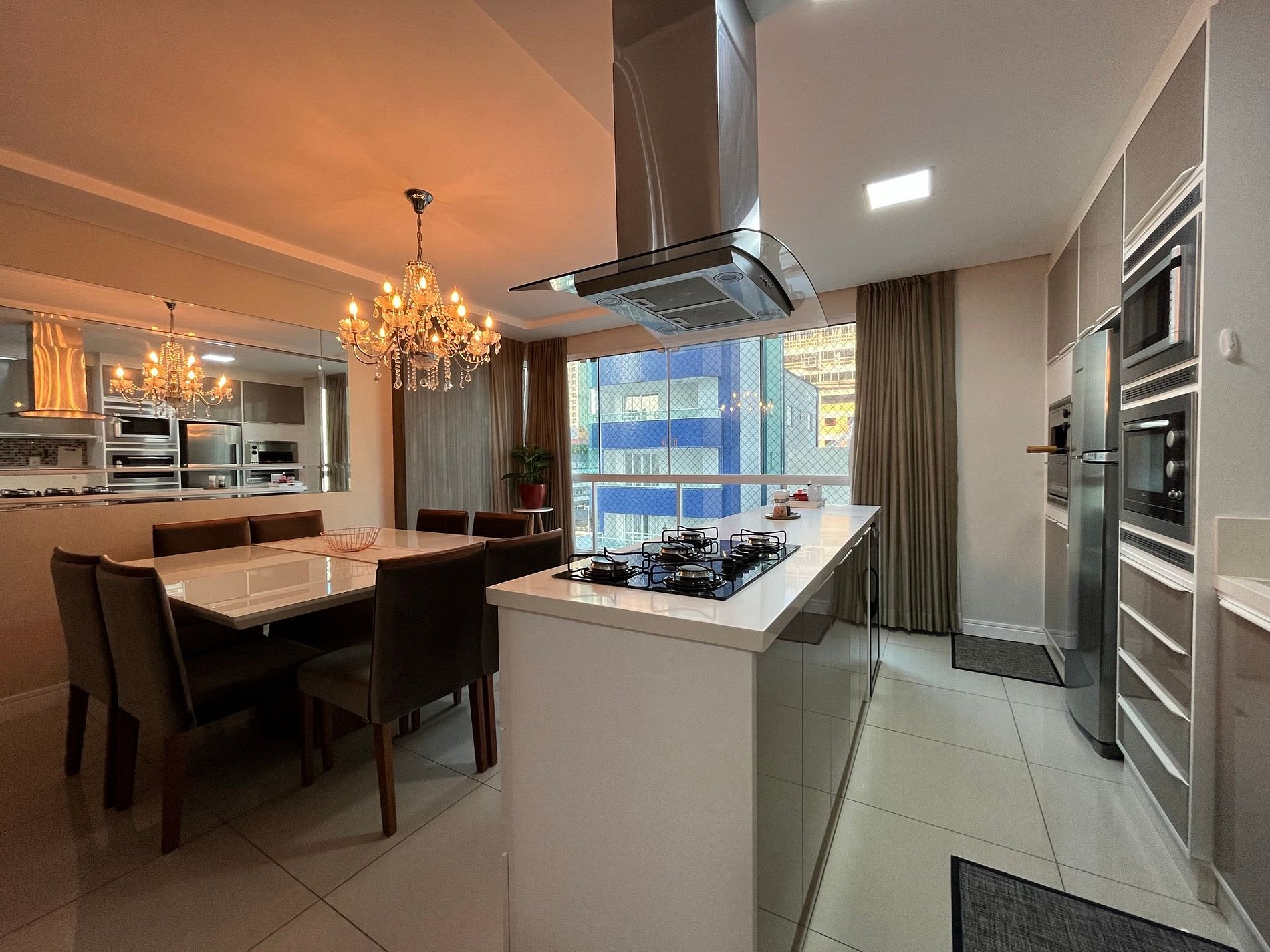 - Mesa de jantar quadra com 8 cadeira integrada a uma cozinha americana super completa