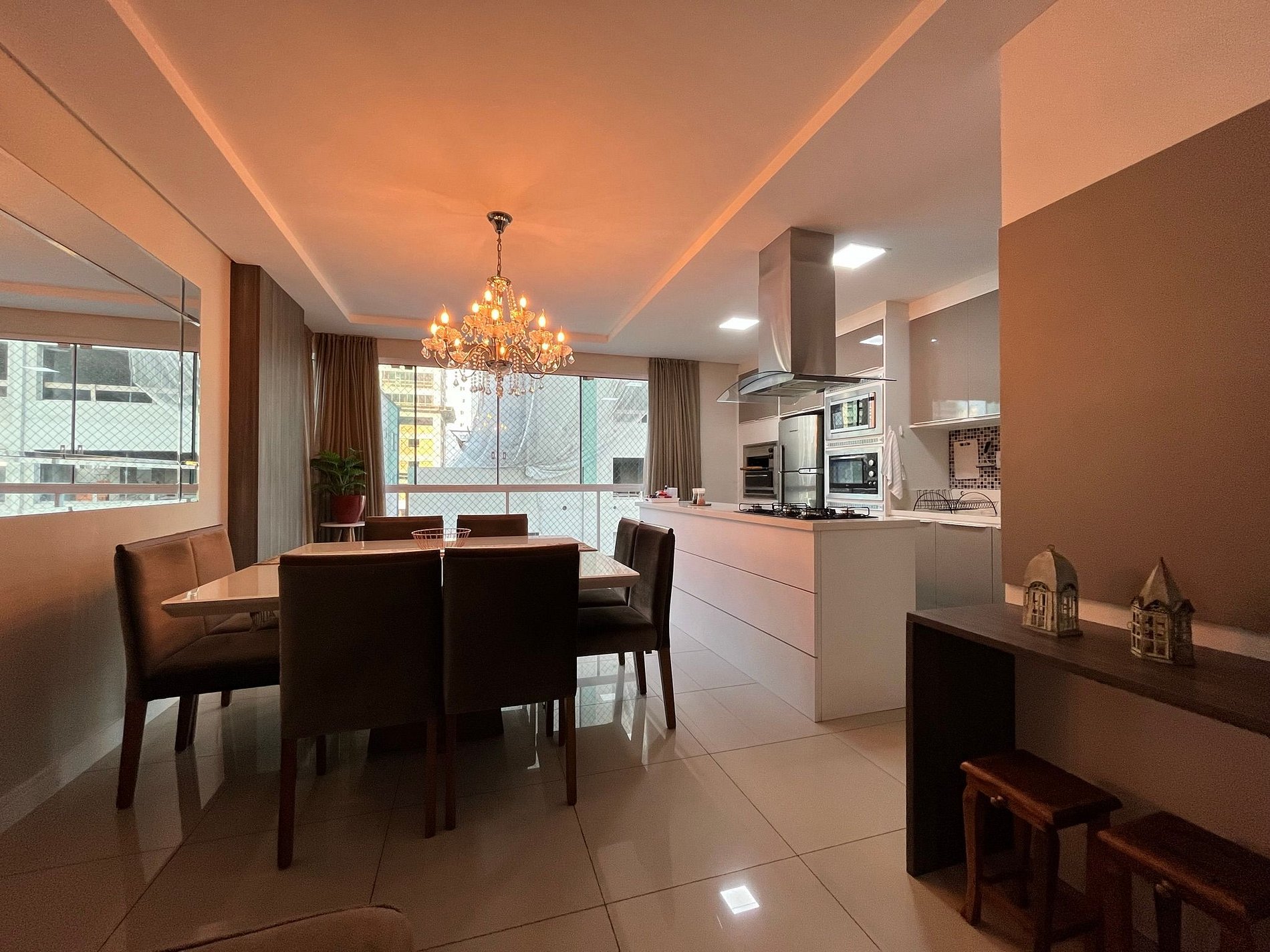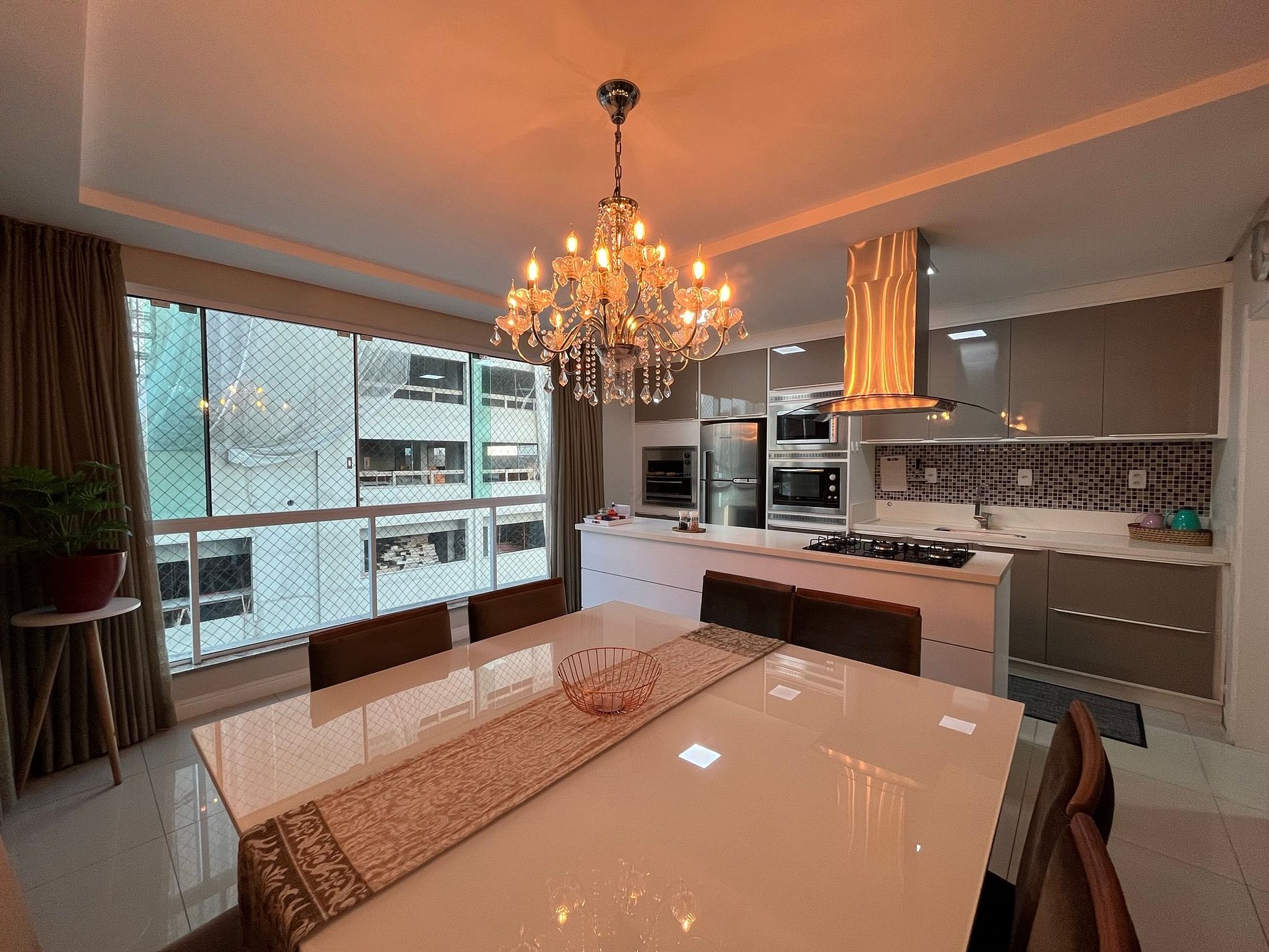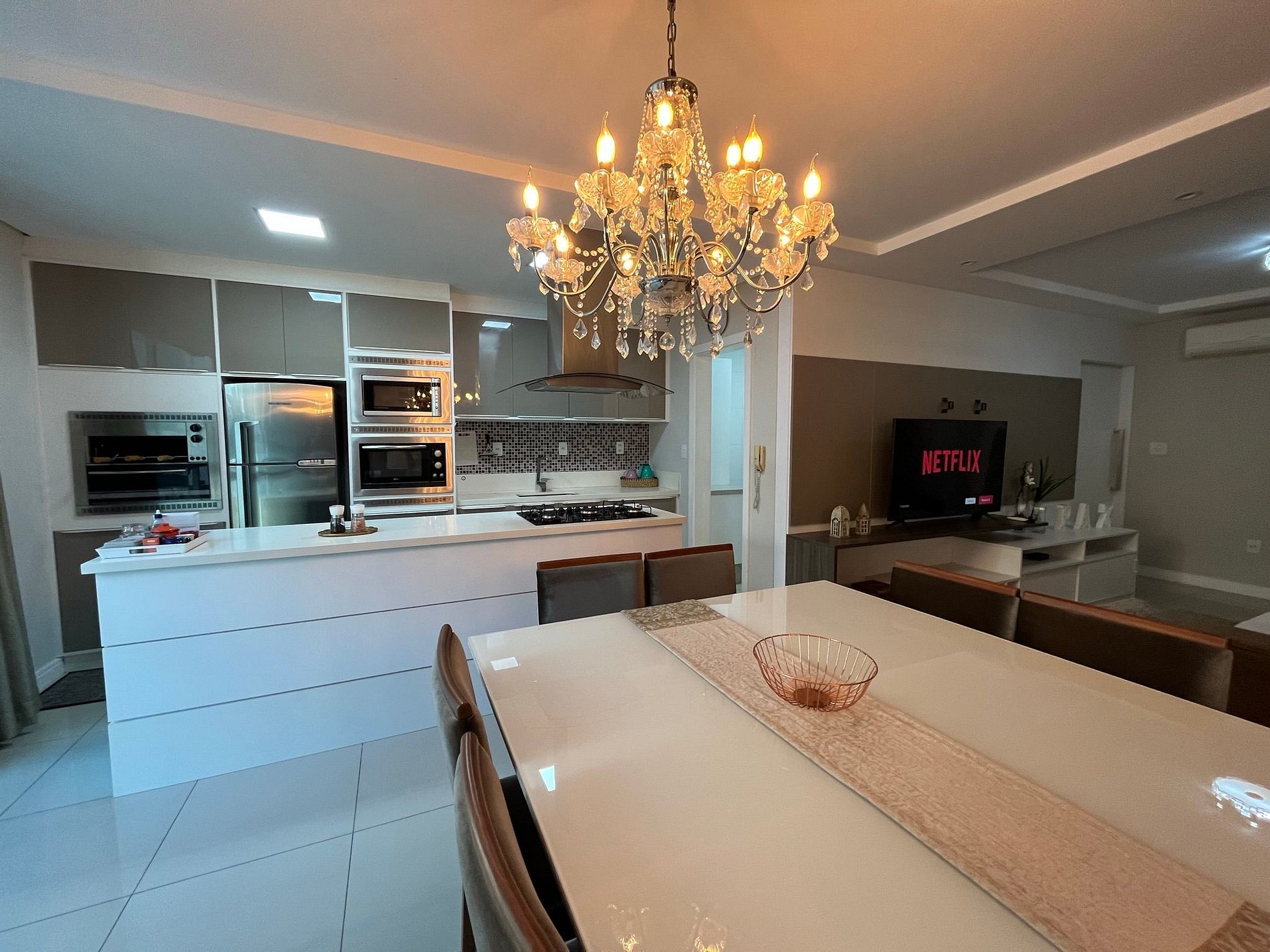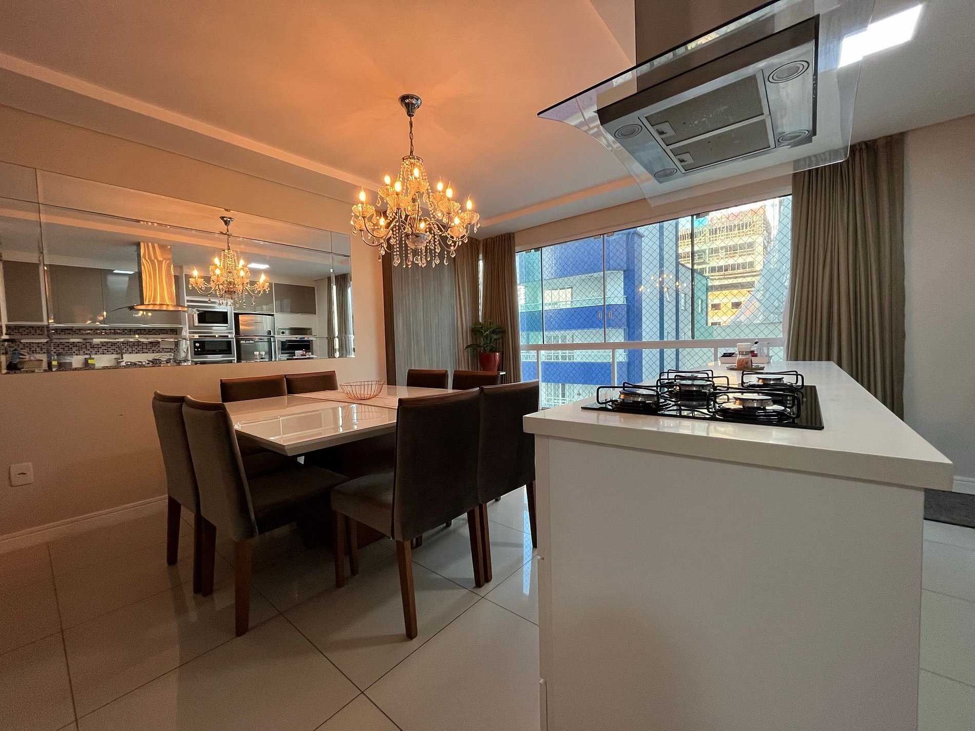 - Mesa de jantar quadra com 8 cadeira integrada a uma cozinha americana super completa