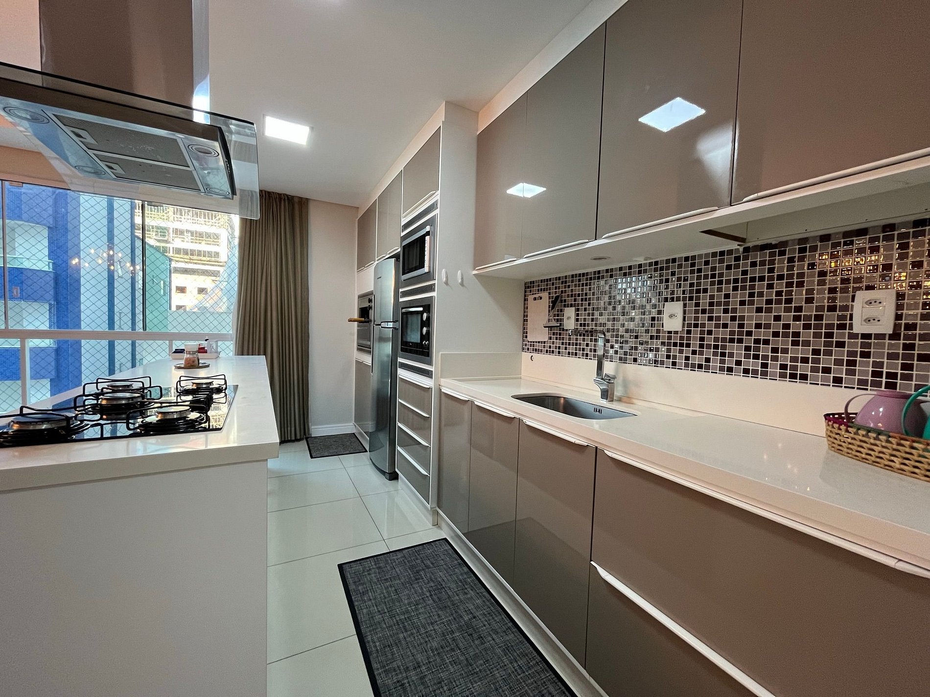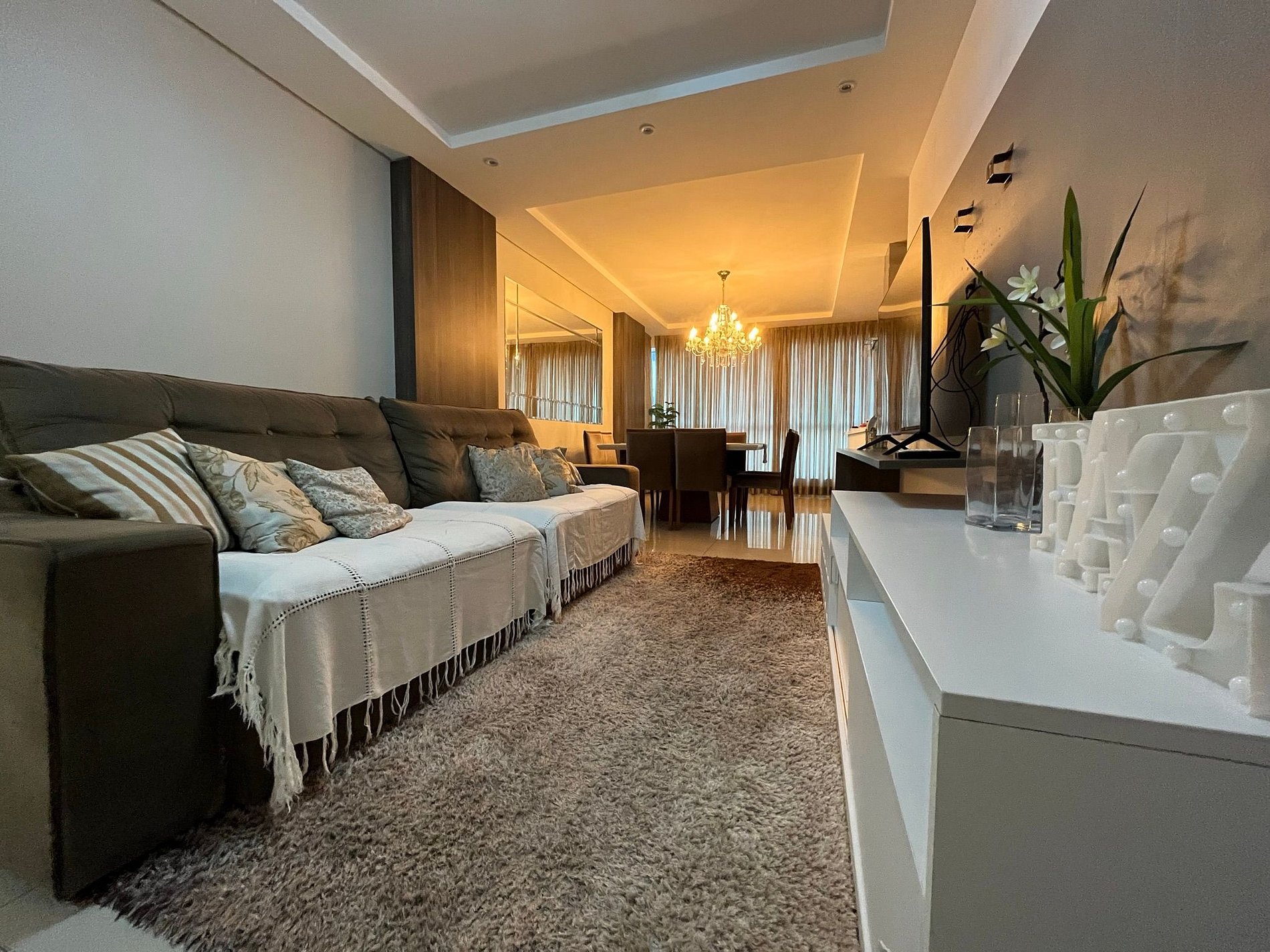 Lindo e confortável apartamento com mobília nova e moderna, composto por 3 quartos sendo uma suíte, todos com ar condicionado split, sala com TV Smart 55" com canais SKY, mesa de jantar quadrada com 8 cadeiras, cozinha estilo americano super completa com churrasqueira elétrica, cervejeira, geladeira duplex. Apto possui um terraço exclusivo do apto, ensolarado e com vista ampla. São duas vagas de garagem, Internet Fibra Óptica 150MB, excelente para Home Office.