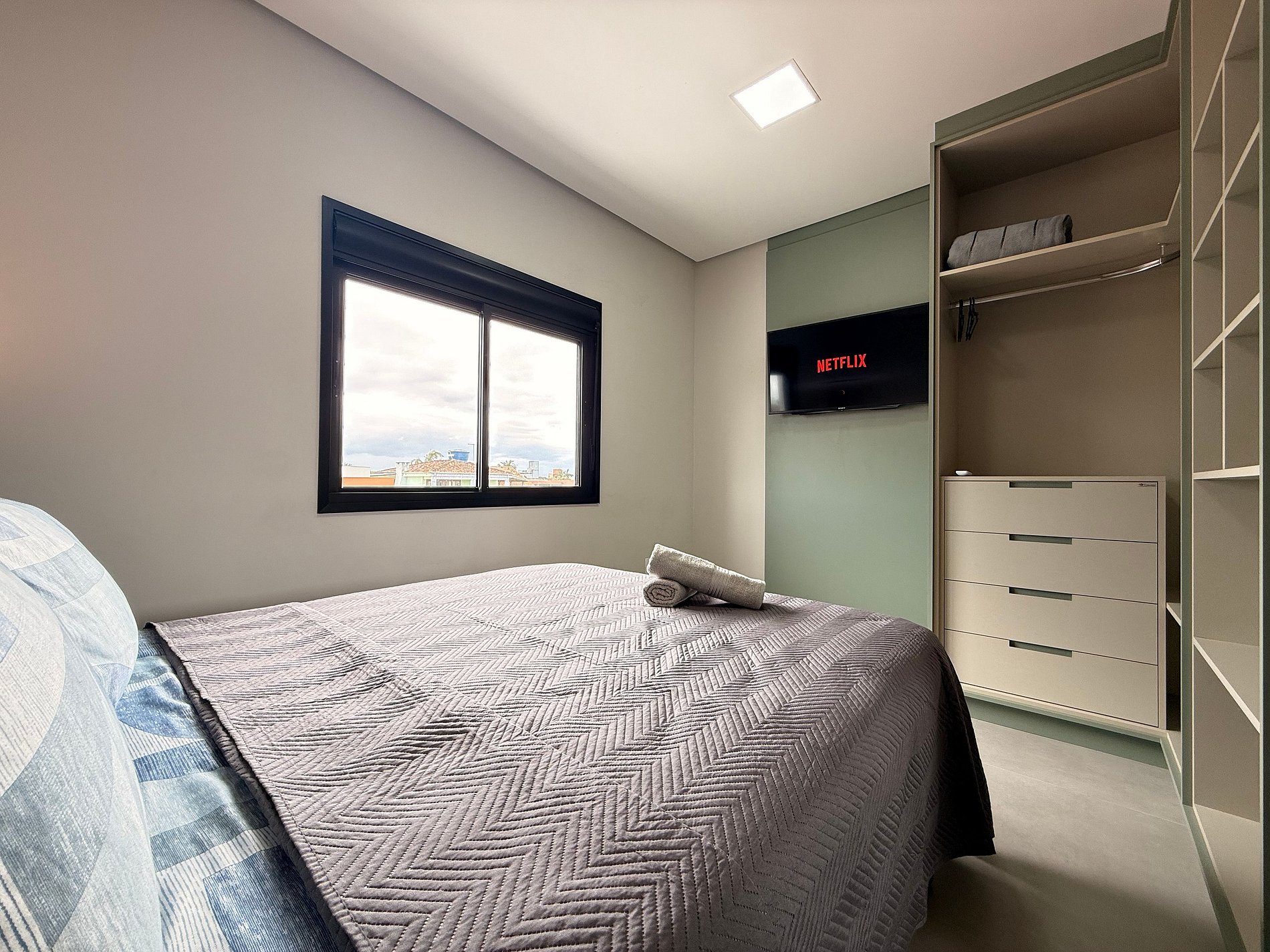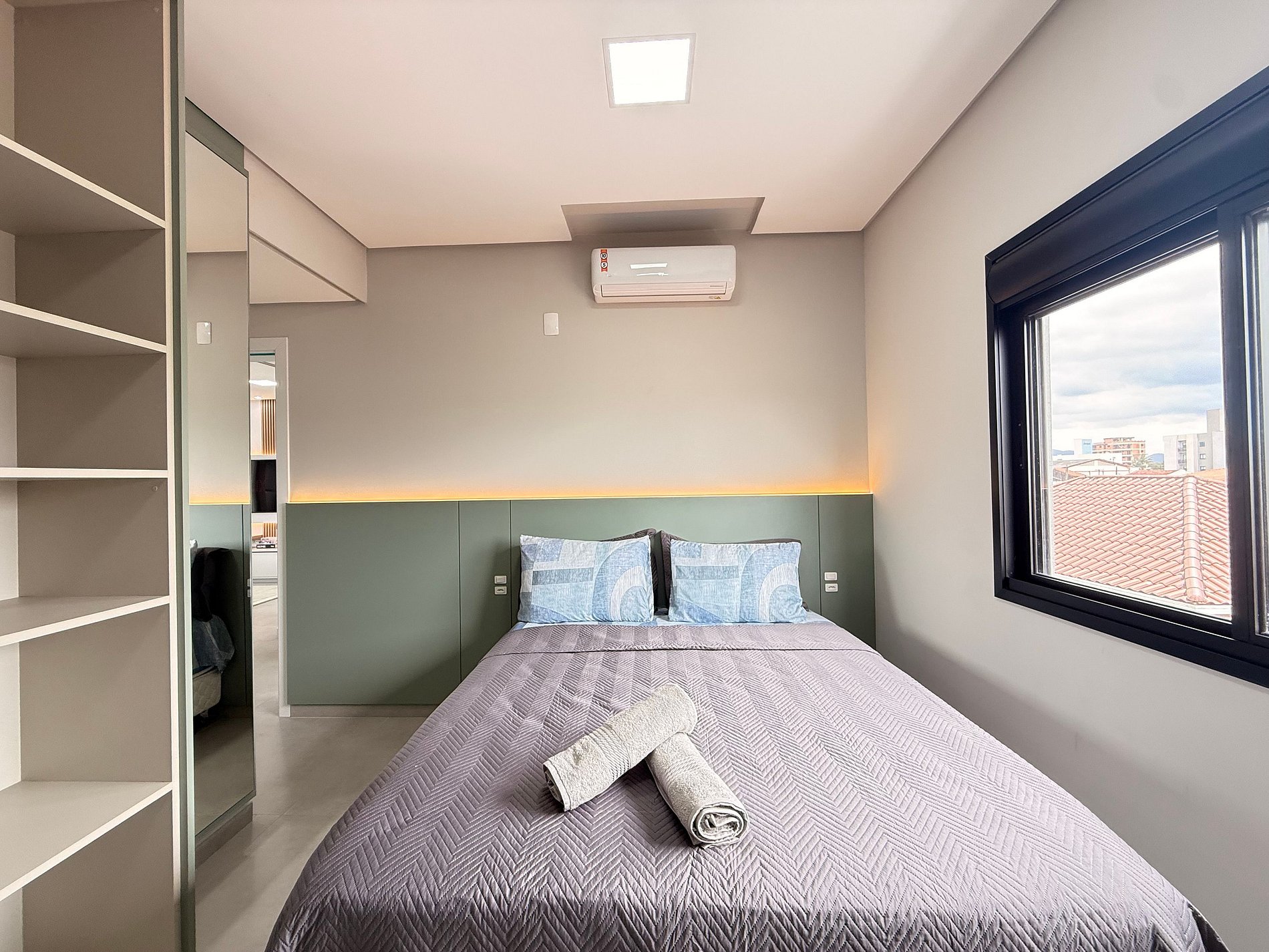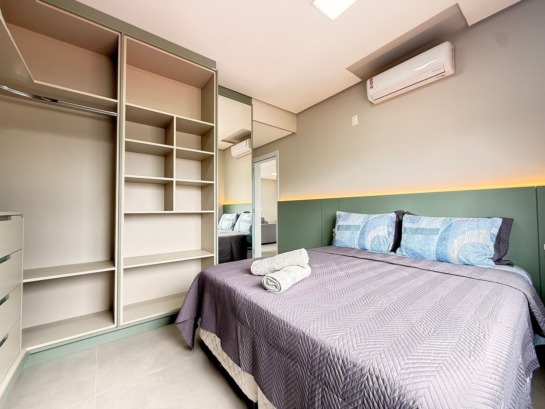 - Suíte: Cama Queen Size, guarda-roupa grande, cortinas blackout e ar-condicionado split.