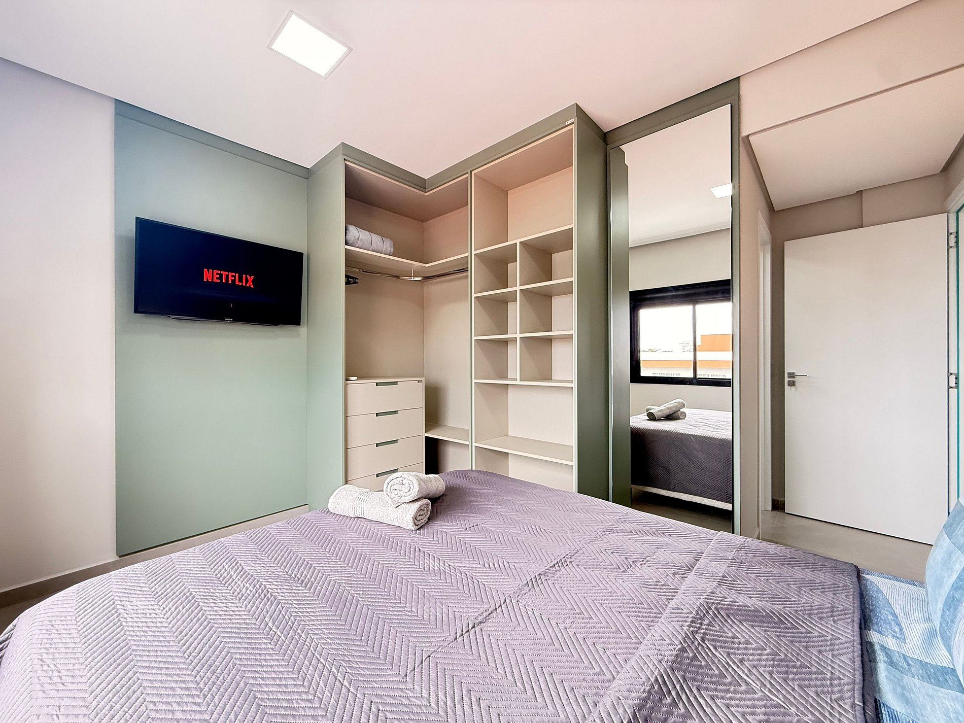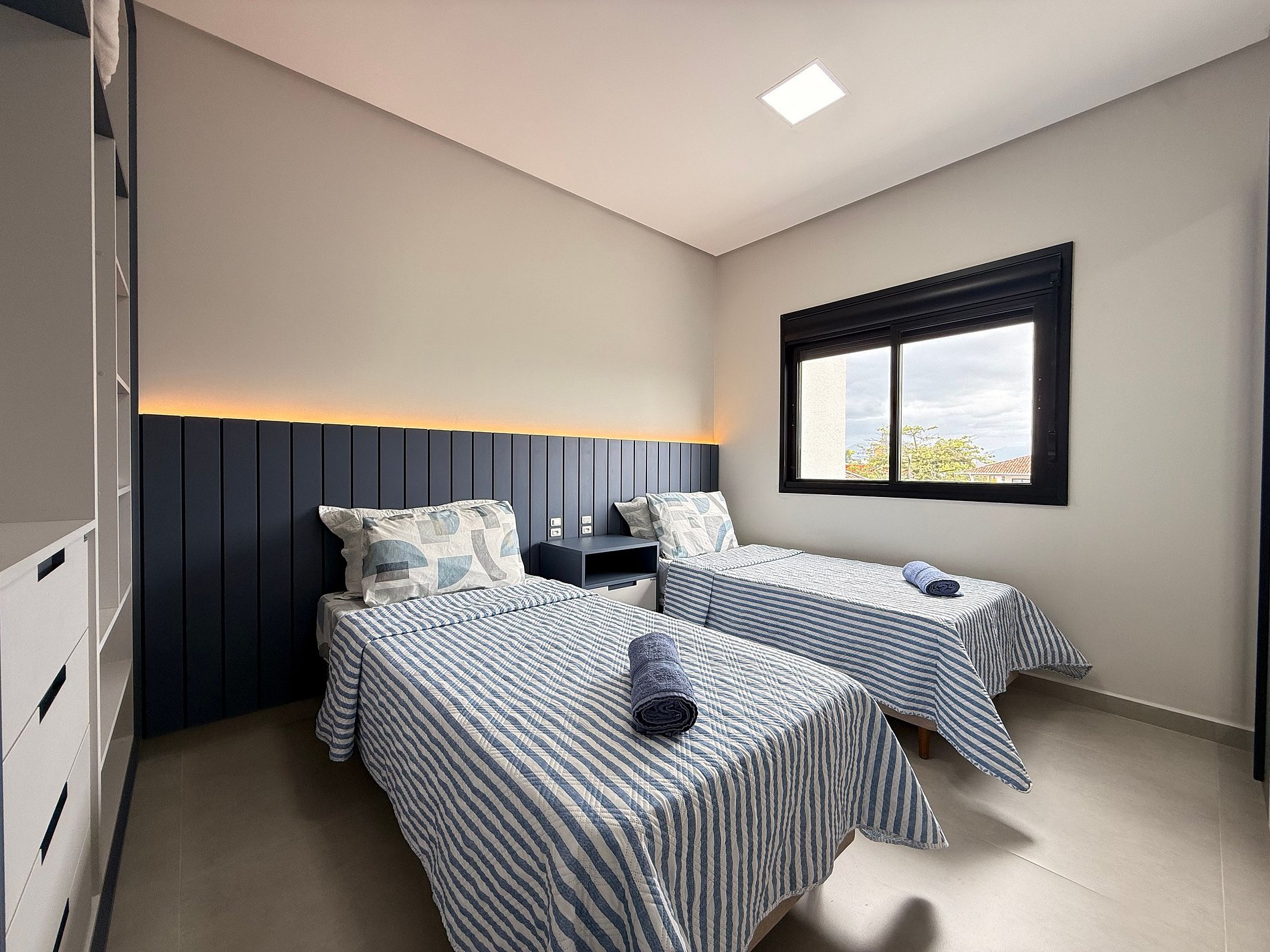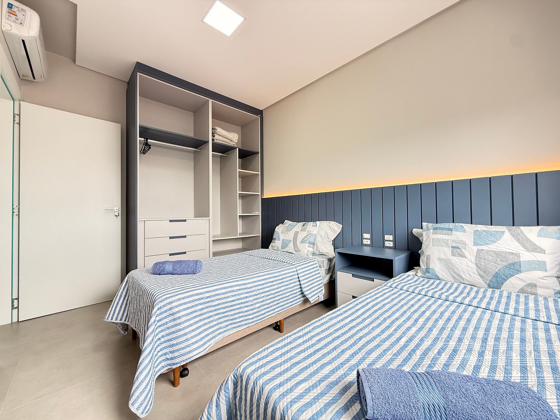 - Suíte: Cama Queen Size, guarda-roupa grande, cortinas blackout e ar-condicionado split.