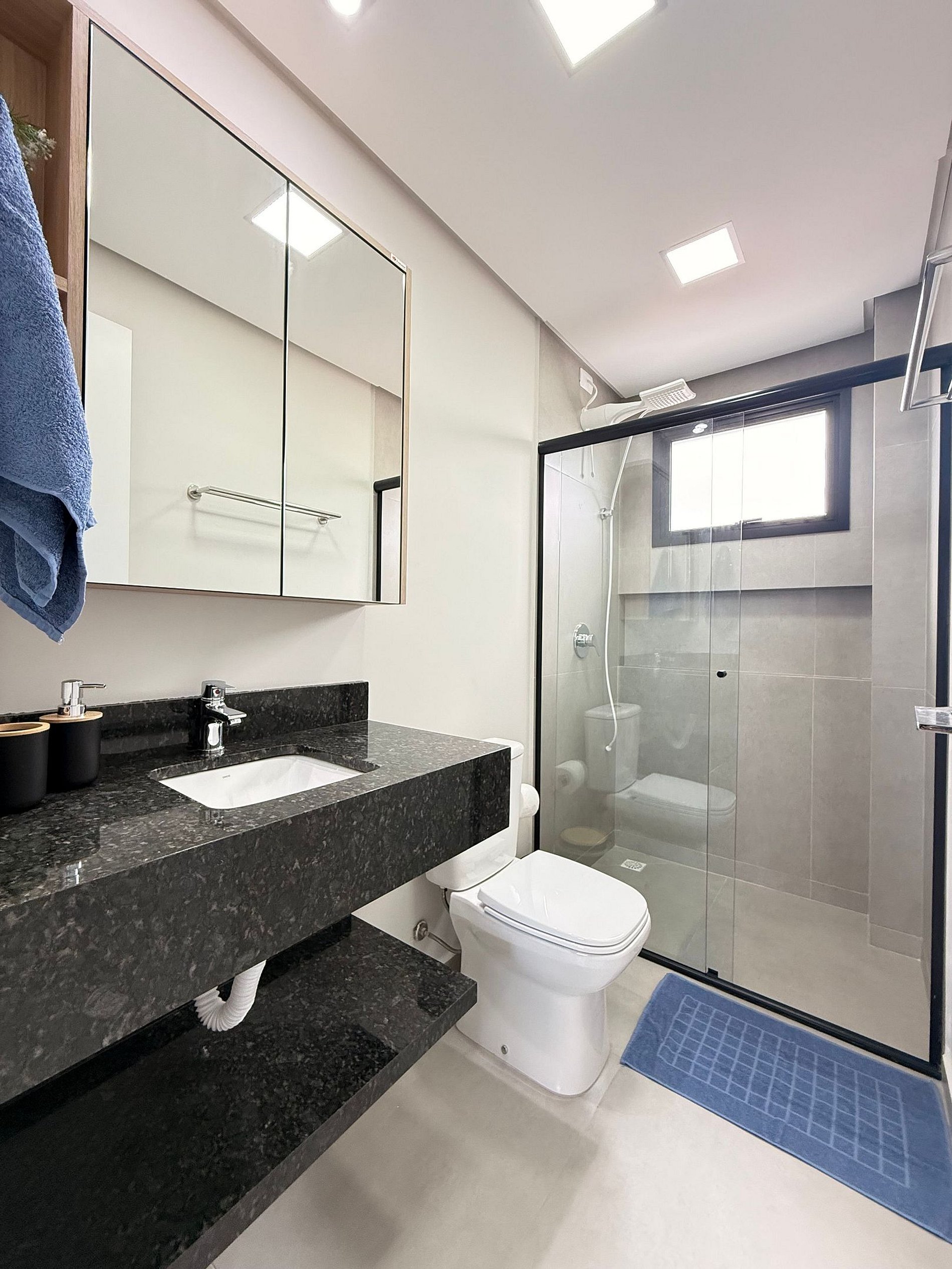 Banheiro social completo com chuveiro eletrônico.