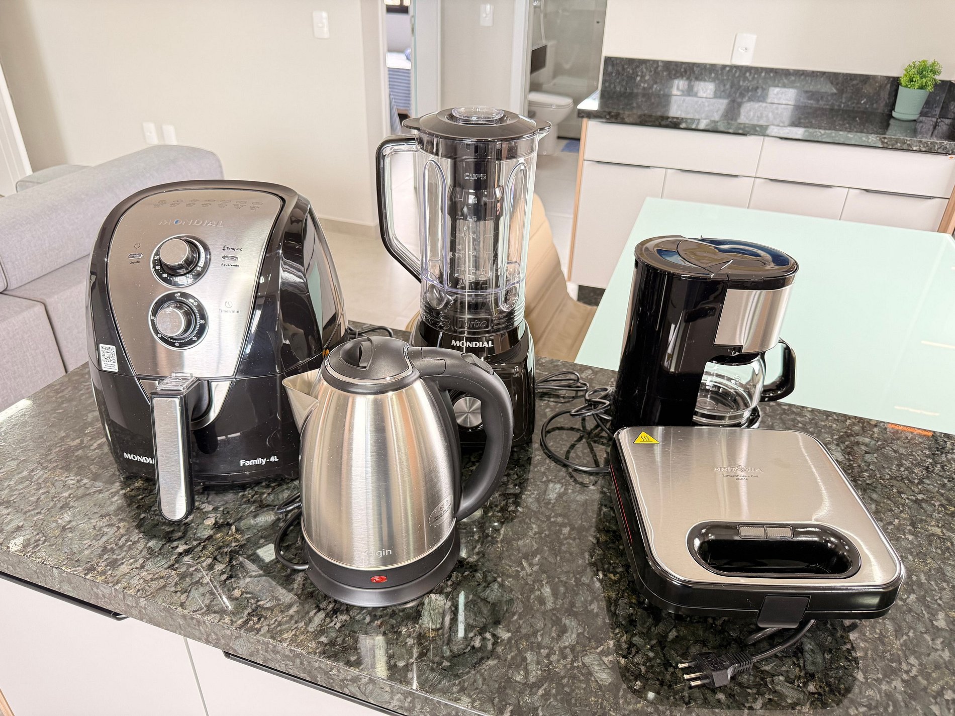 - Geladeira duplex nova, micro-ondas, fogão, airfryer, sanduicheira e utensílios completos e filtro de água potável.