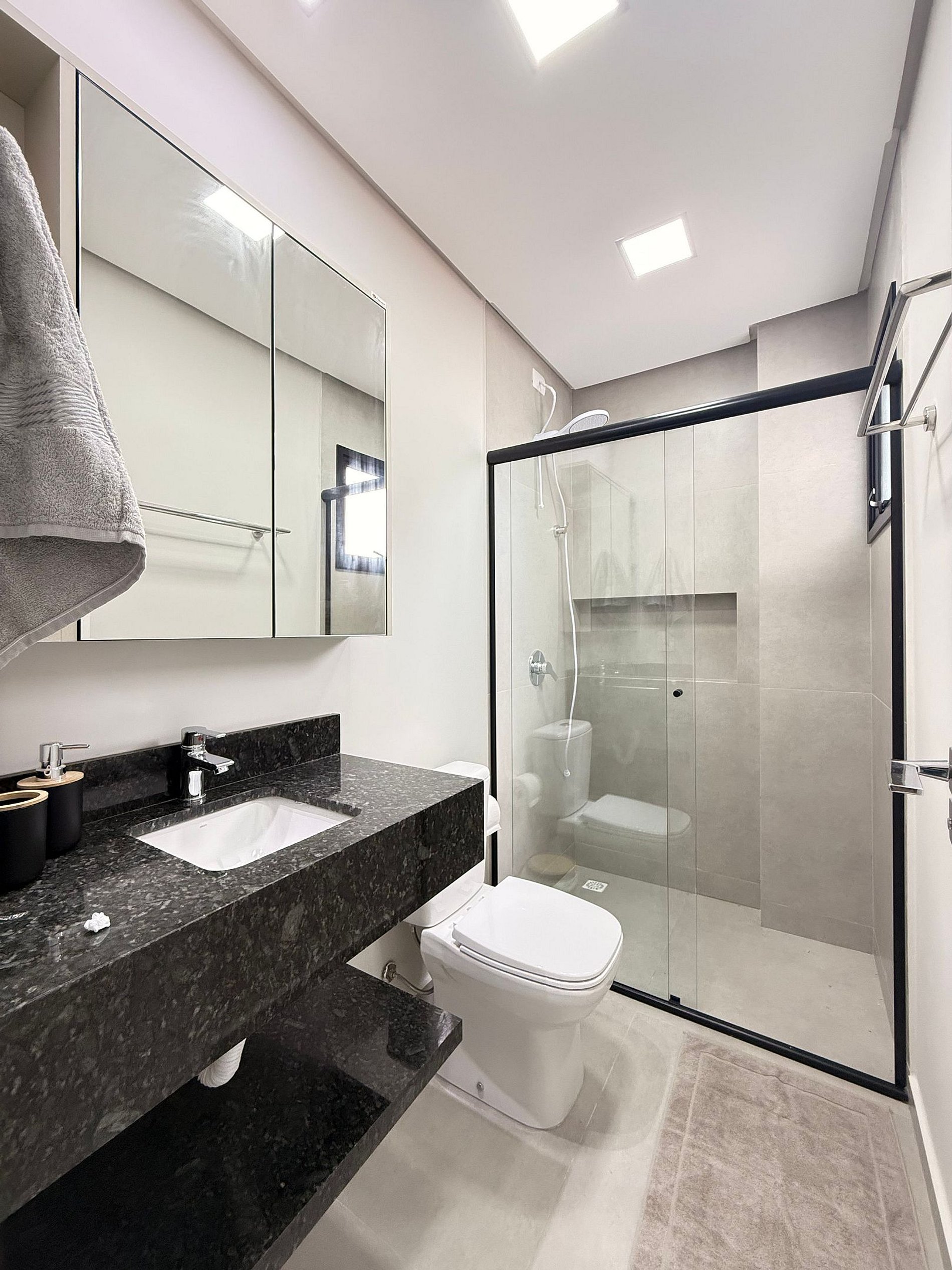 Banheiro social completo com chuveiro eletrônico.