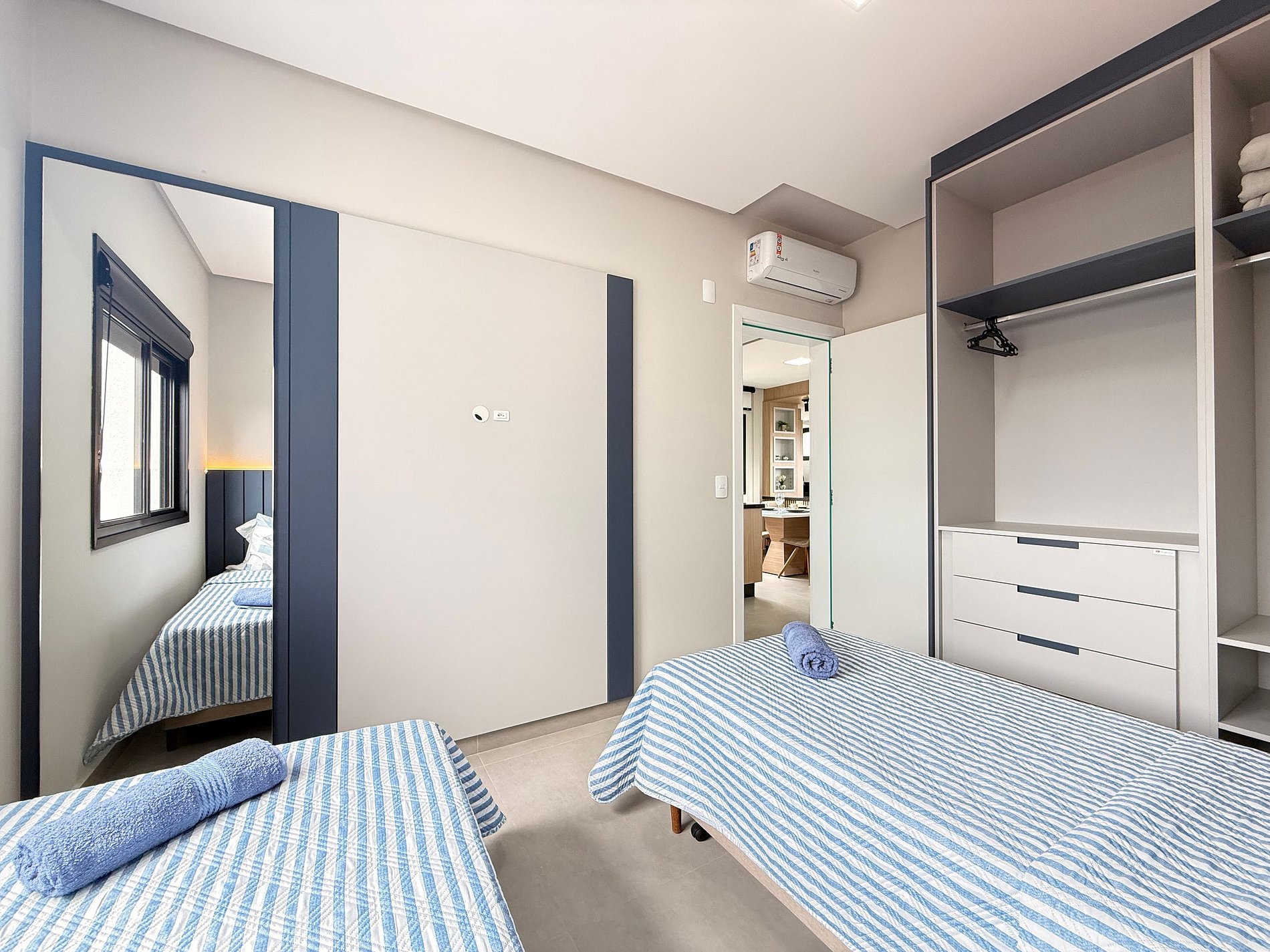 - Suíte: Cama Queen Size, guarda-roupa grande, cortinas blackout e ar-condicionado split.