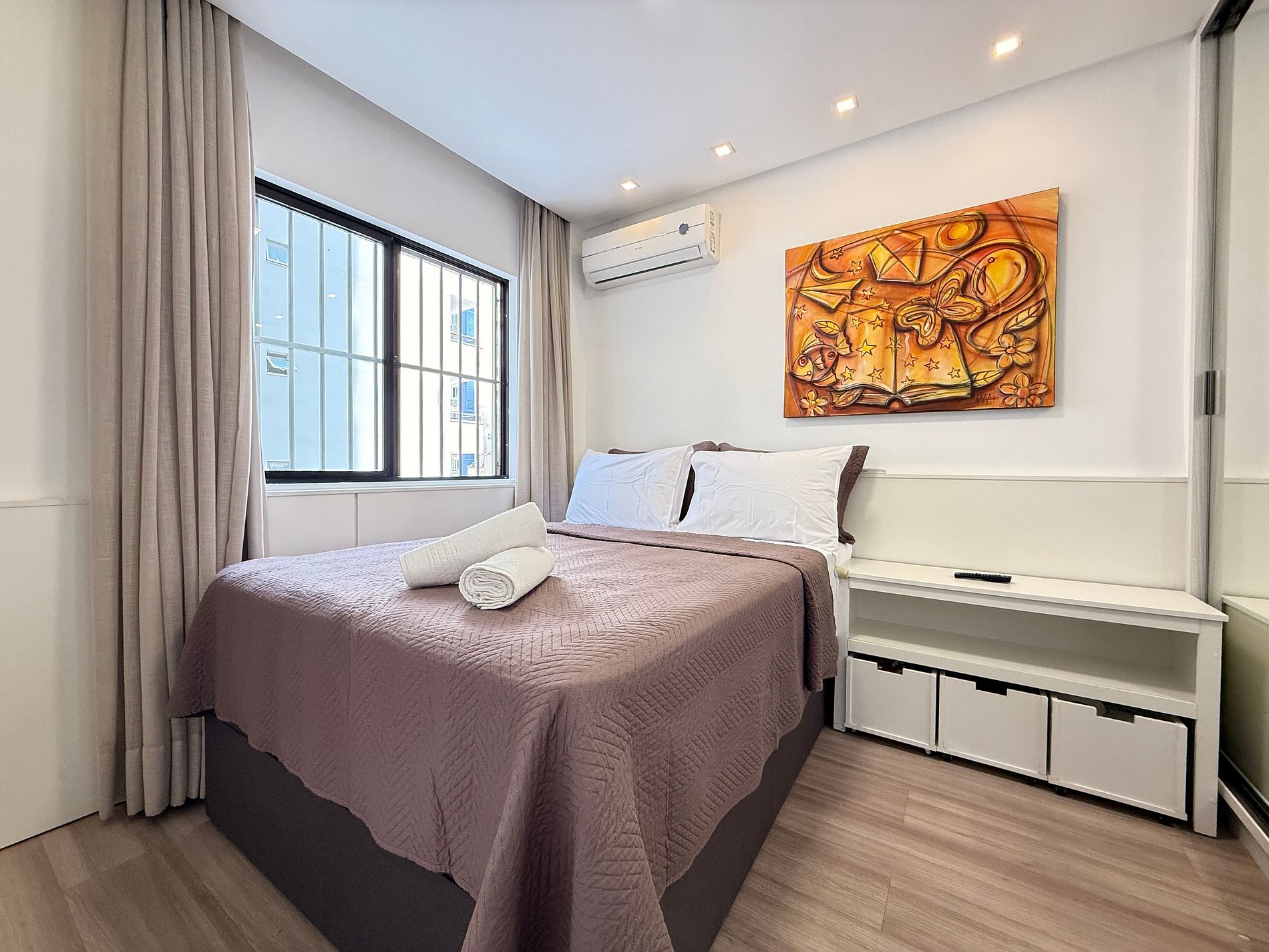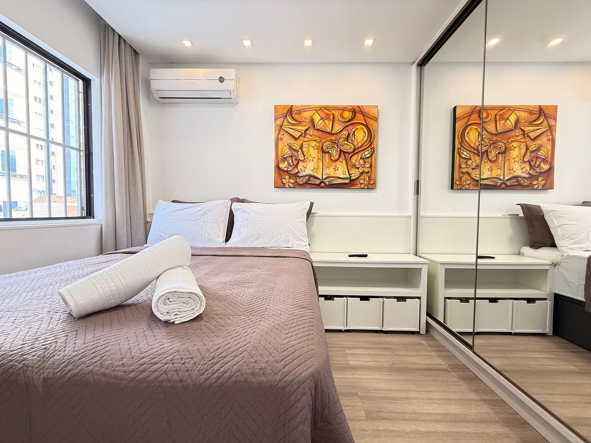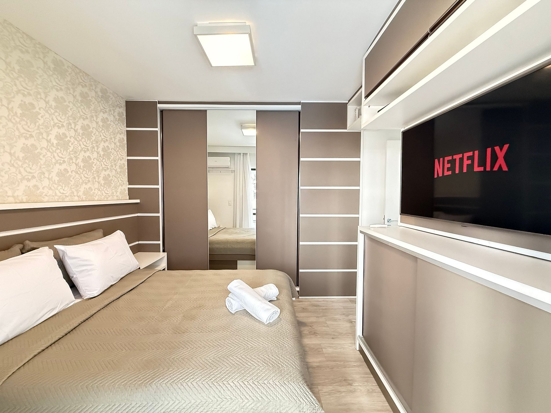 - Todos os quartos possuem camas de casal novas, cortinas blackout, ar-condicionado split e TVs Smart.