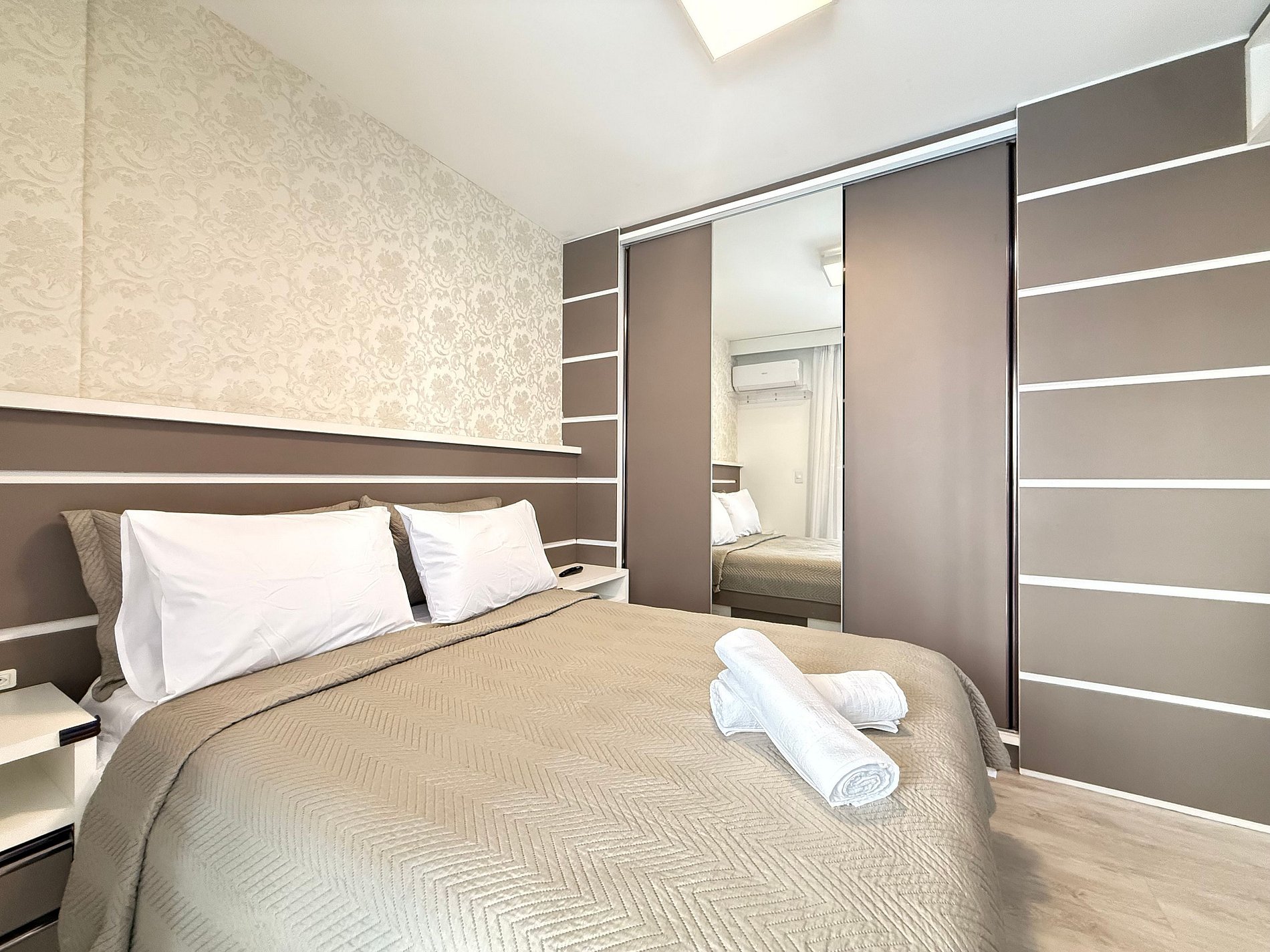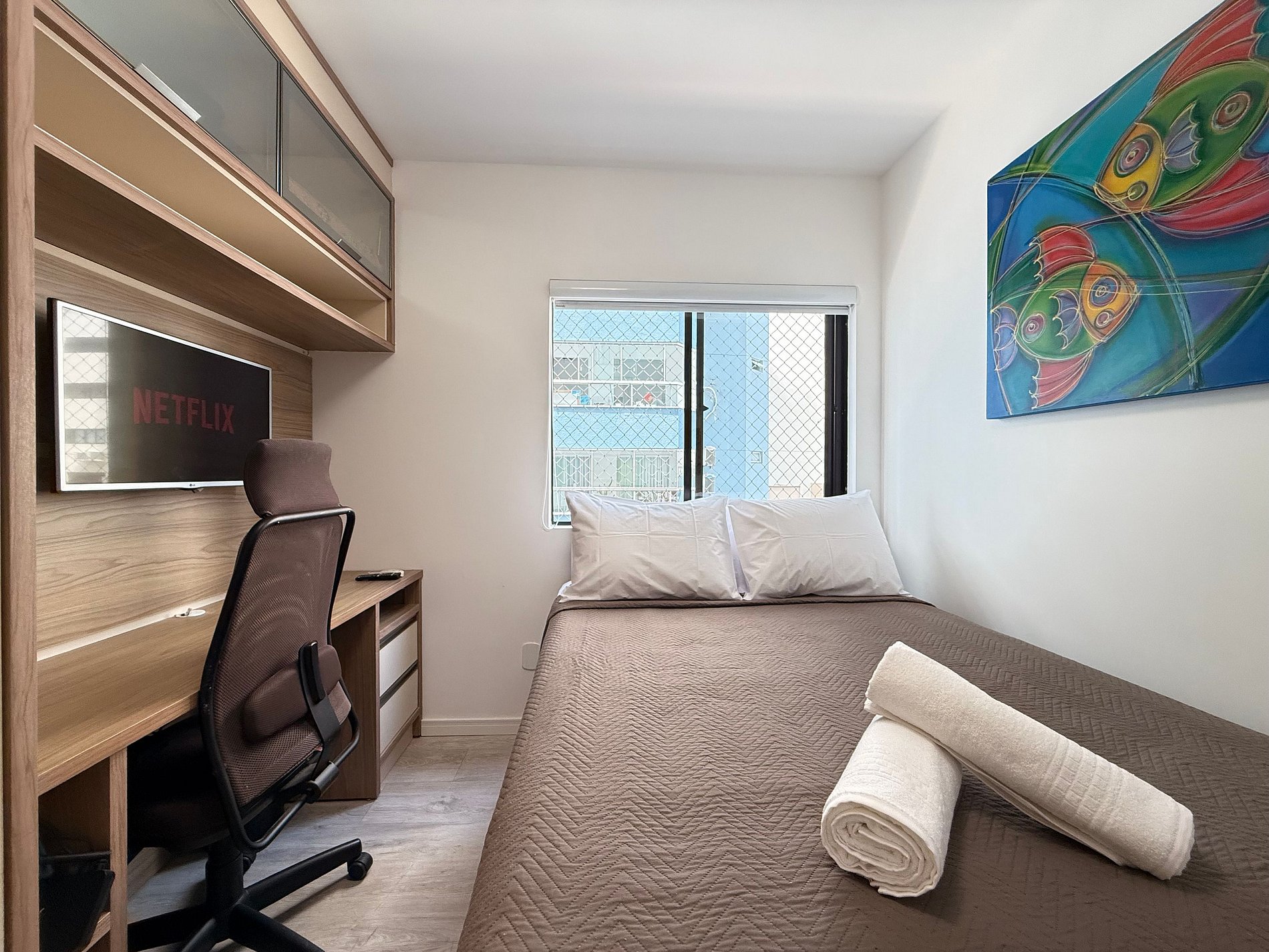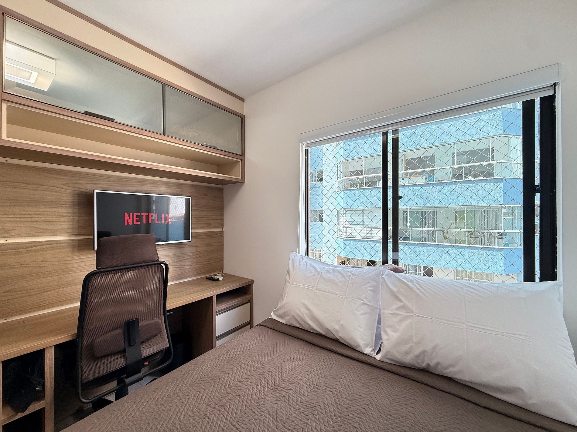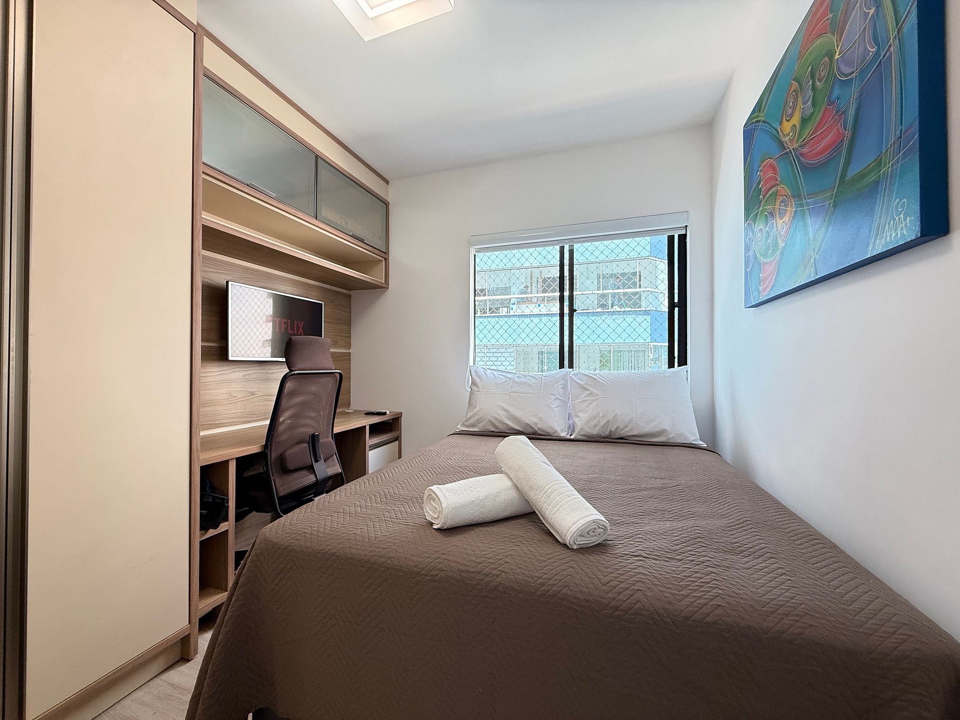 - Todos os quartos possuem camas de casal novas, cortinas blackout, ar-condicionado split e TVs Smart.