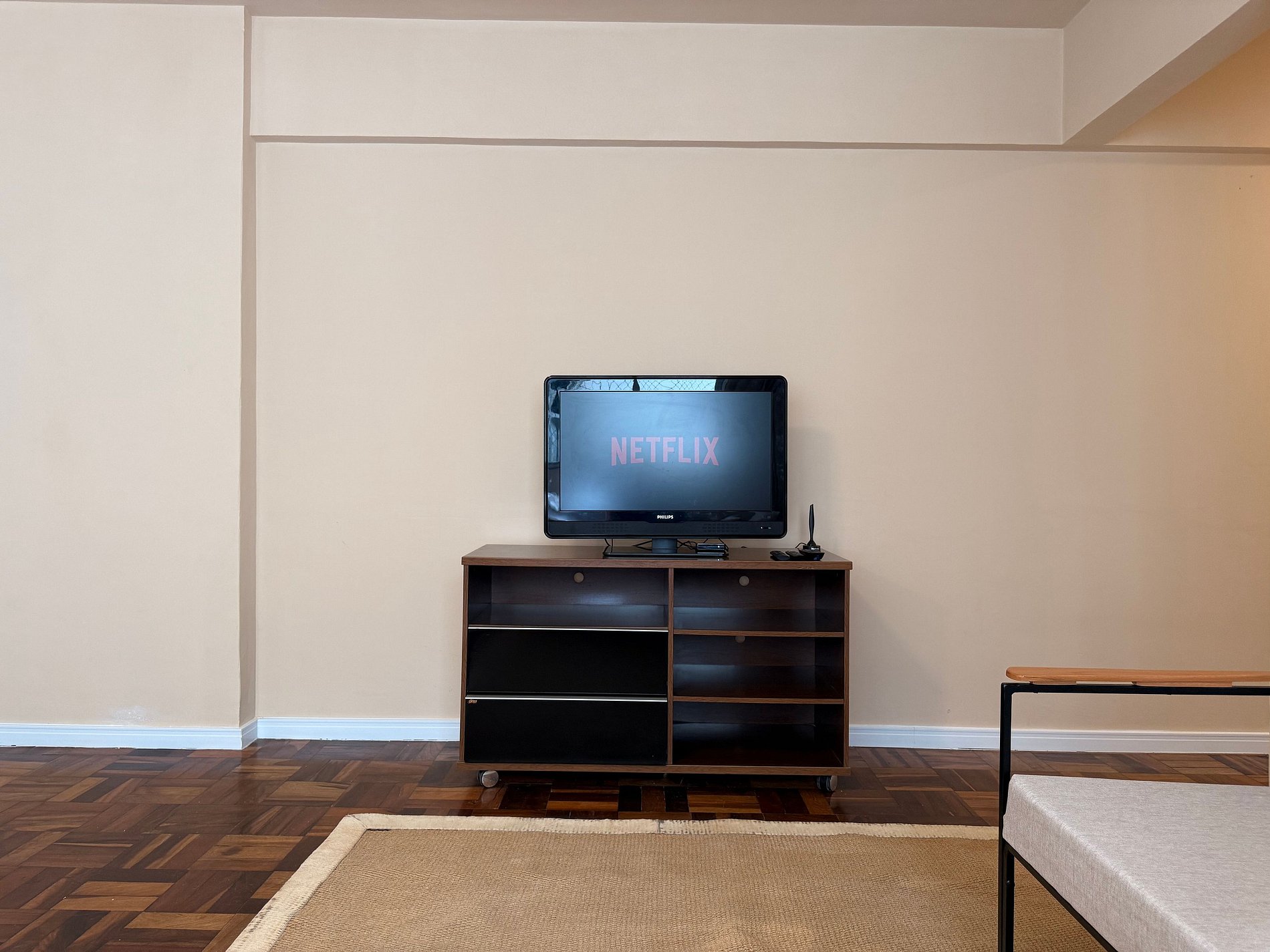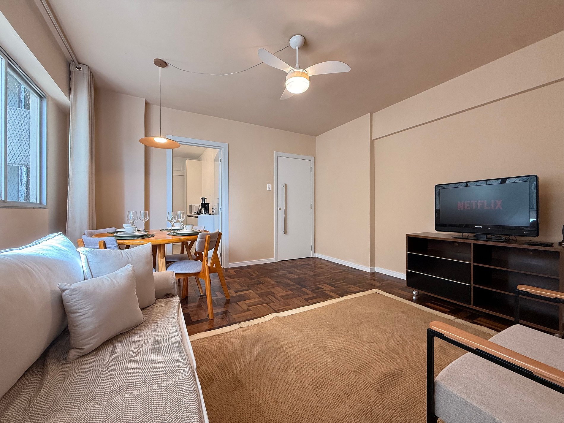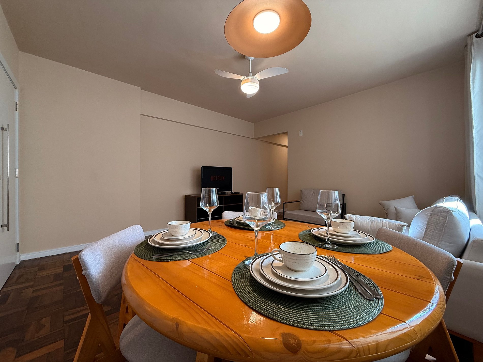 - Sala ampla com TV Smart, sofá novo e confortável, além de mesa de jantar para 4 pessoas.