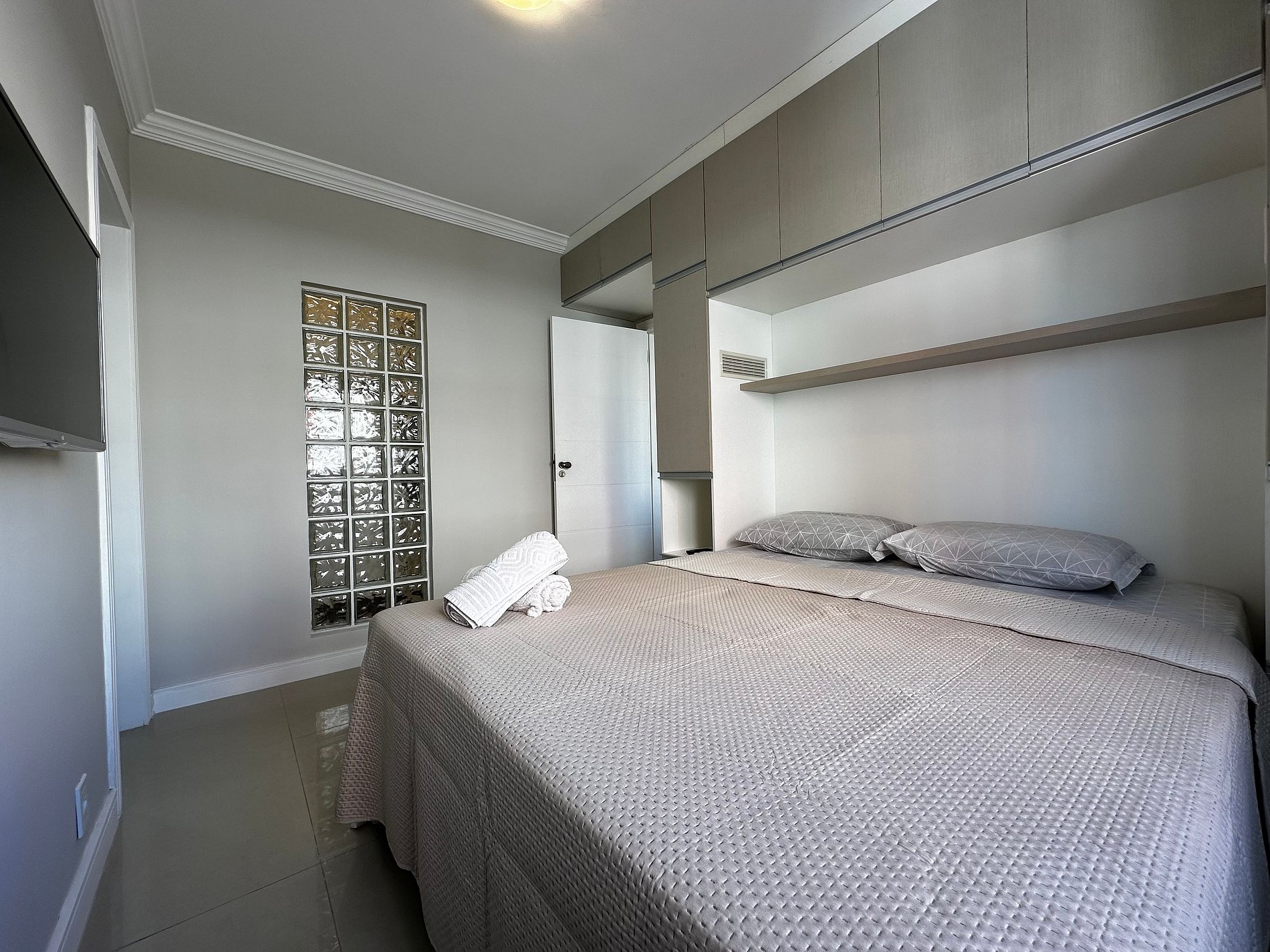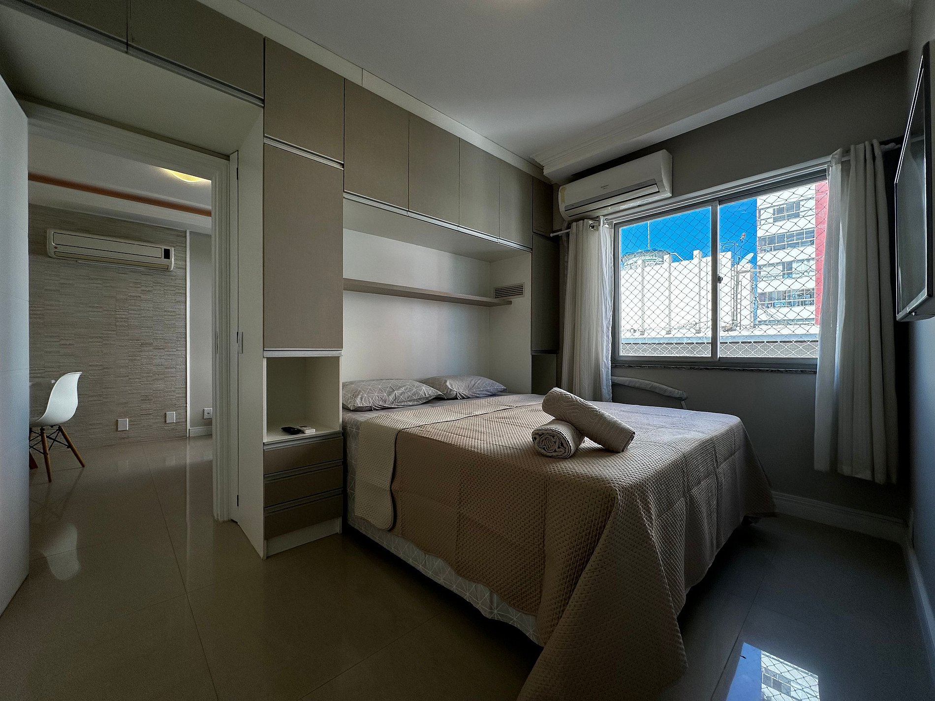 - QUARTO: Cama box Casal Queen Size, ar condicionado split, cortinas com blackout, TV 32" Smart e guarda roupas
