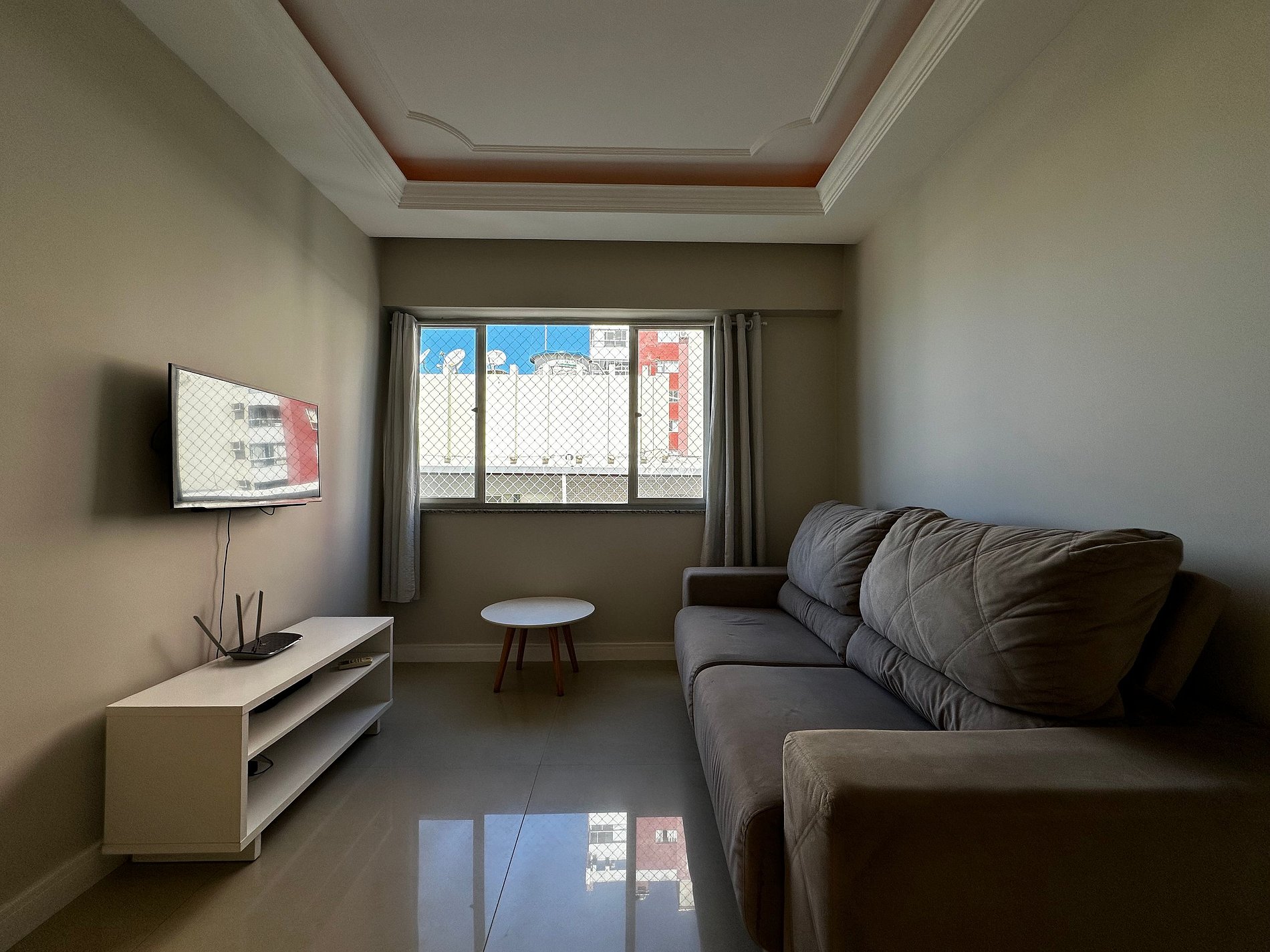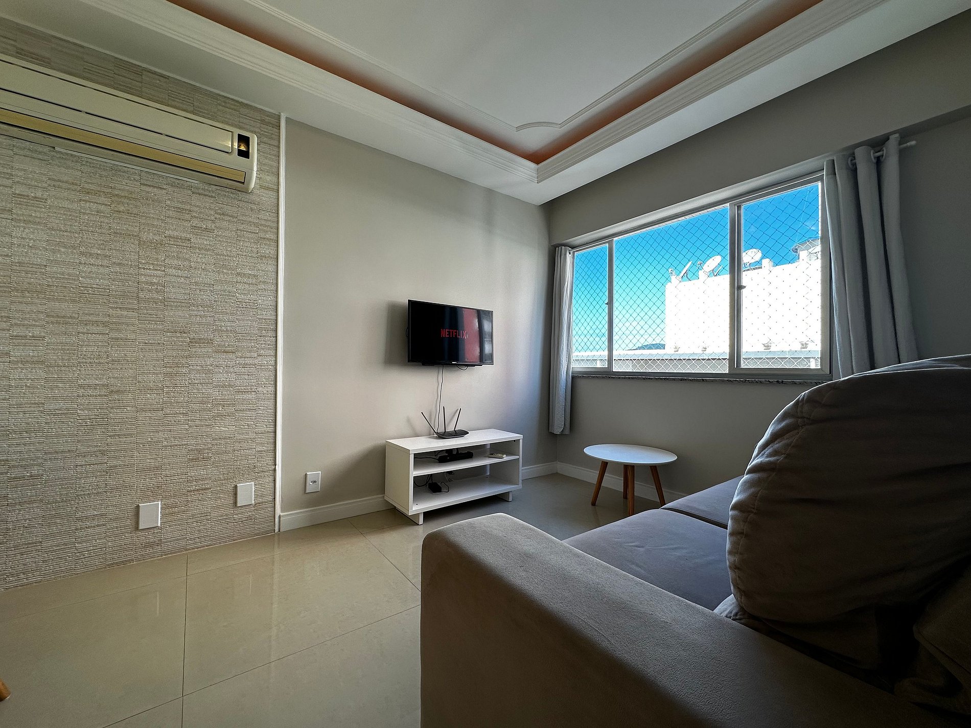 - Sala com TV 32" Smart com app como Netflix, Globoplay, Amazon Prime (necessário conectar com a conta própria) e canais abertos