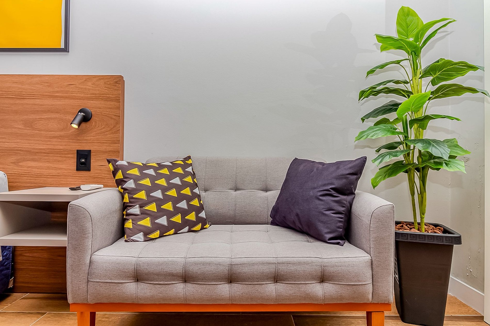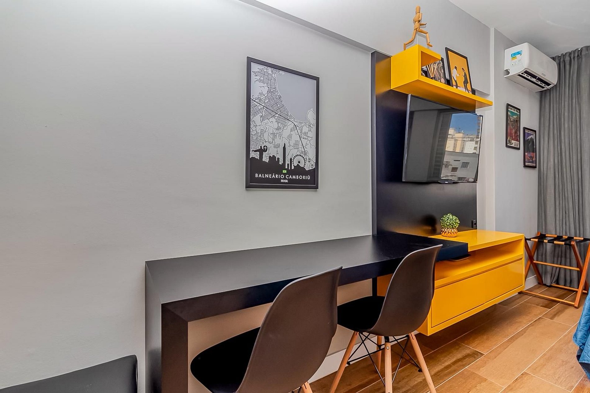 - Área de estar com TV Smart, pronta para você conectar suas contas da Netflix, Globoplay ou Amazon Prime.