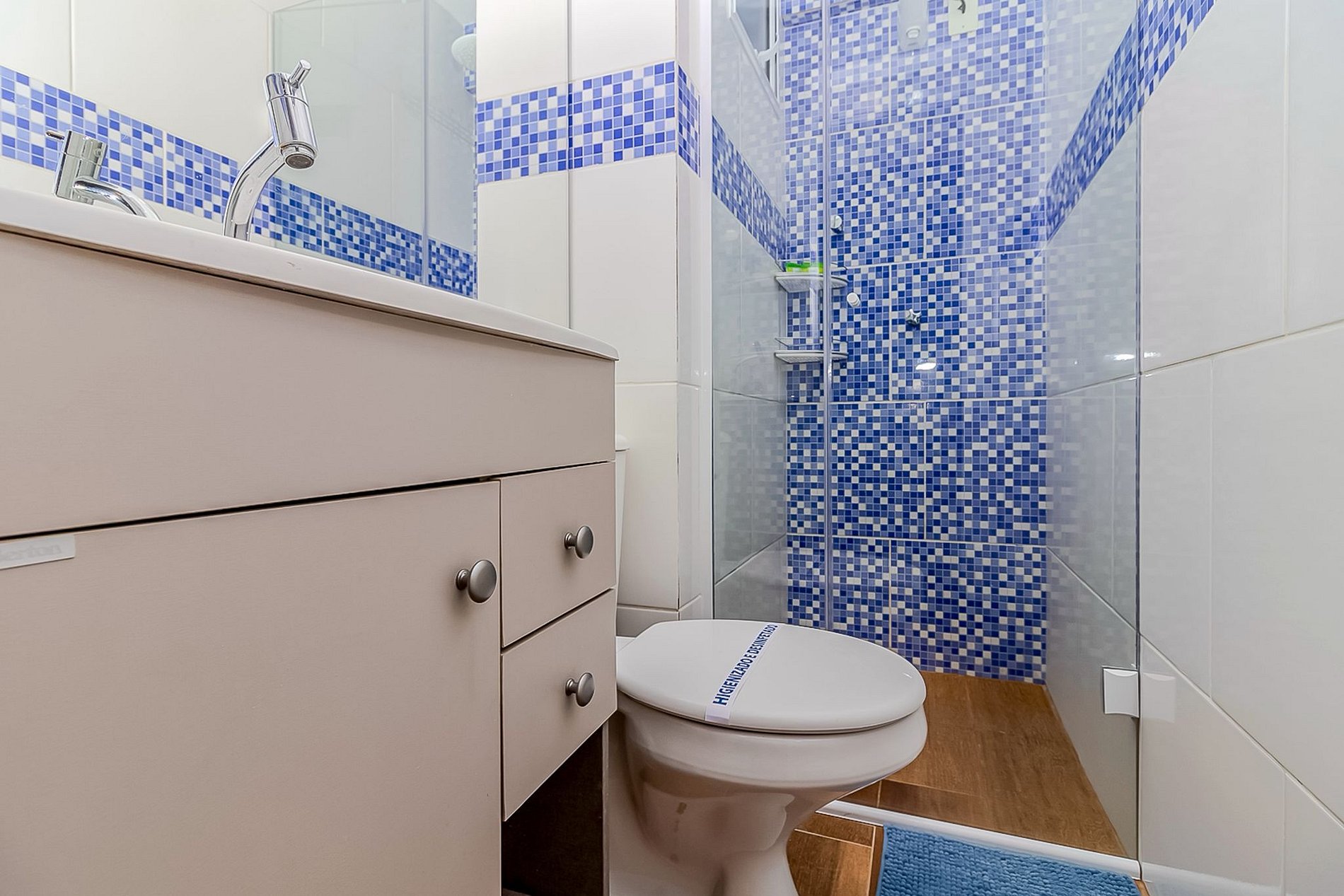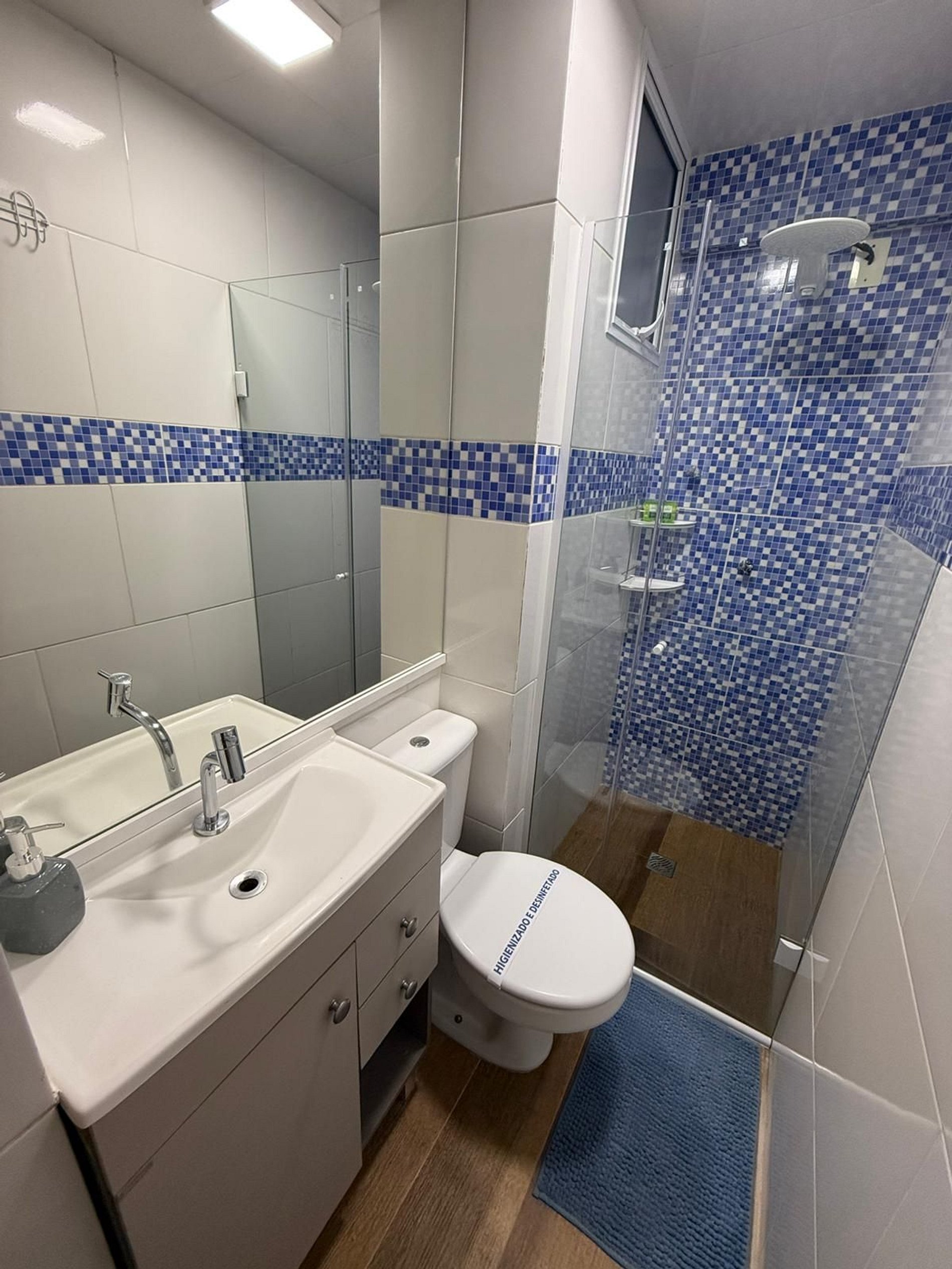 - Banheiro moderno, completo e com chuveiro de excelente pressão para relaxar após um dia de praia.