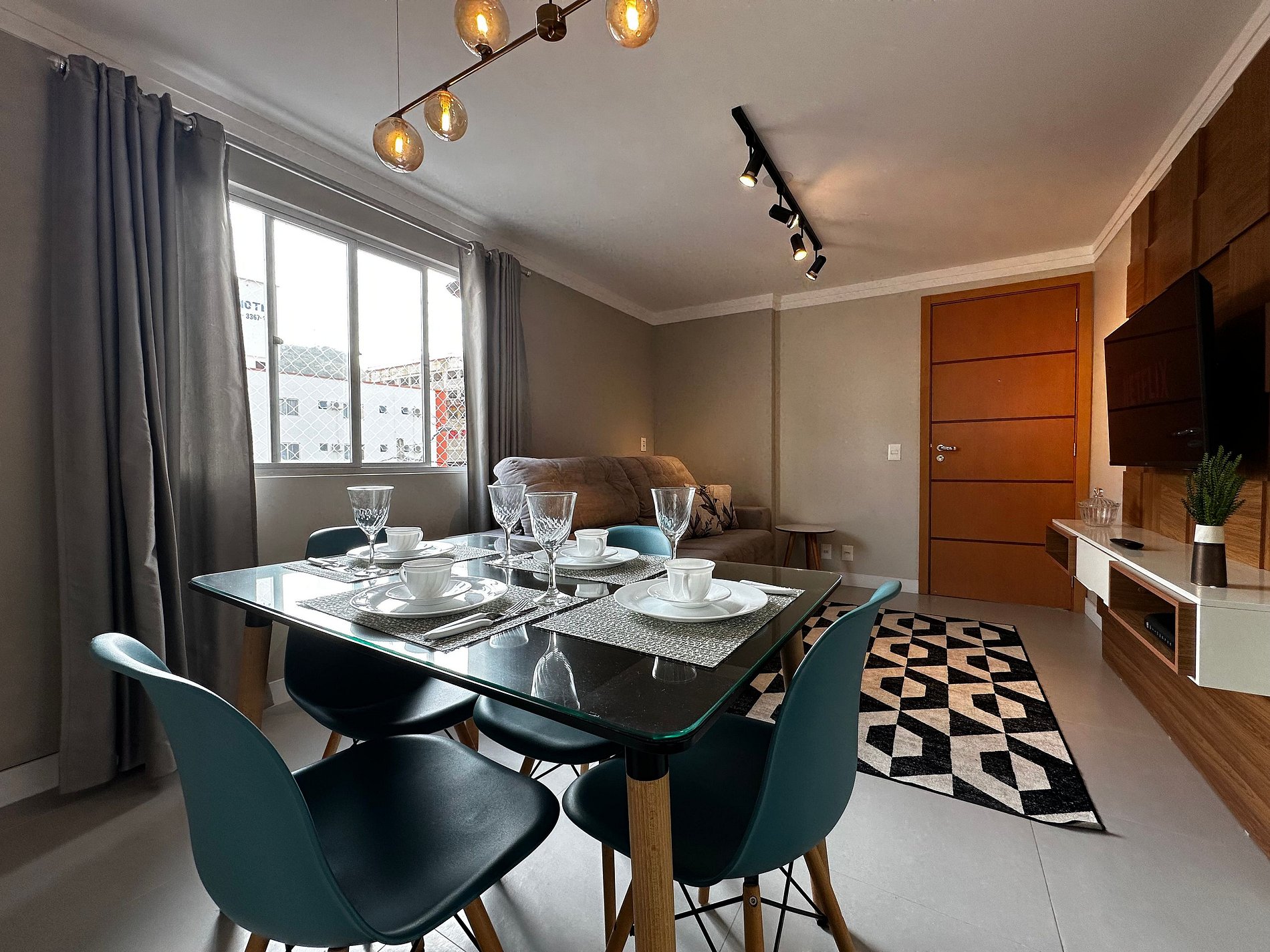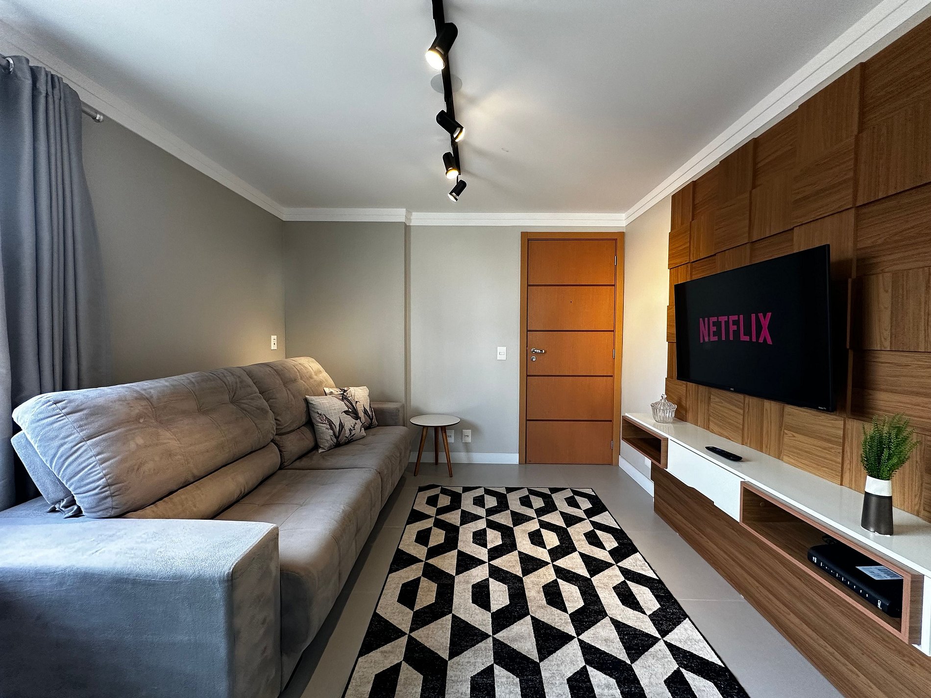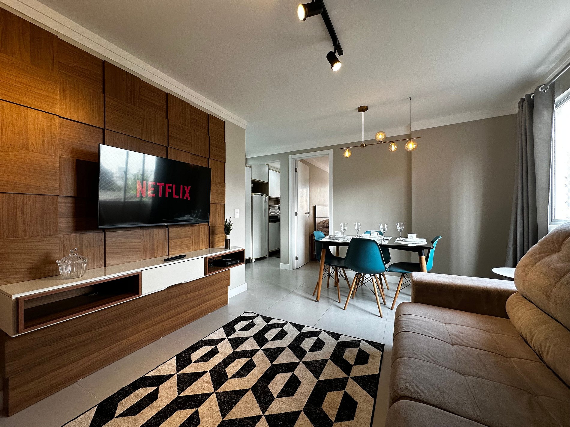 - Sala com TV 43" Smart com app como Netflix, Globoplay, Amazon Prime (necessário conectar com a conta própria) e canais abertos