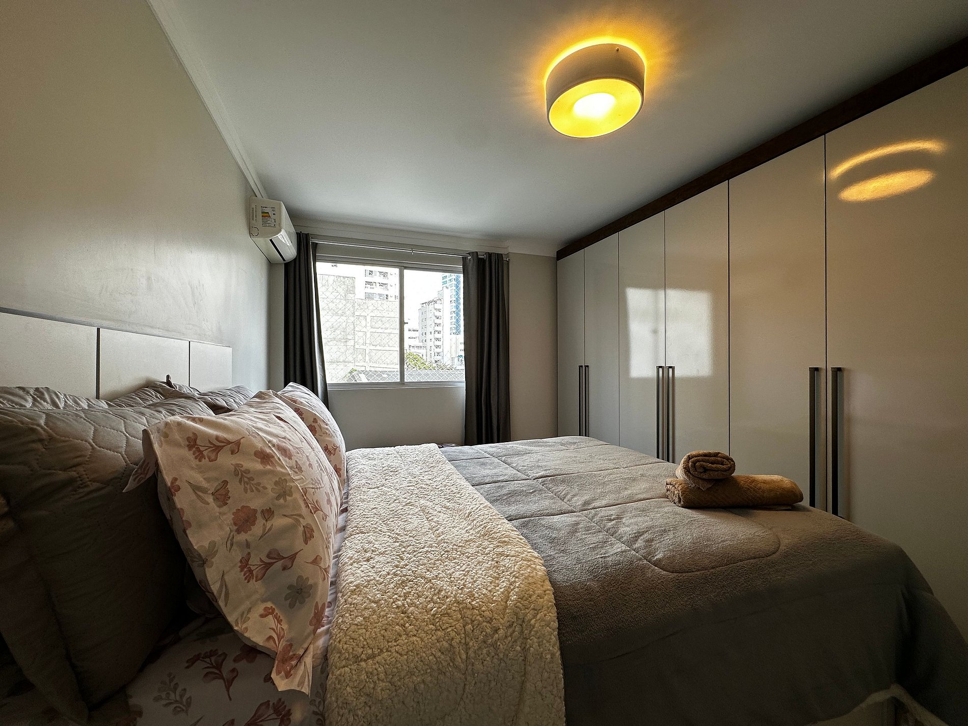 - QUARTO: Cama com colchão de molas ensacadas tamanho padrão, ar condicionado split e guarda roupas grande