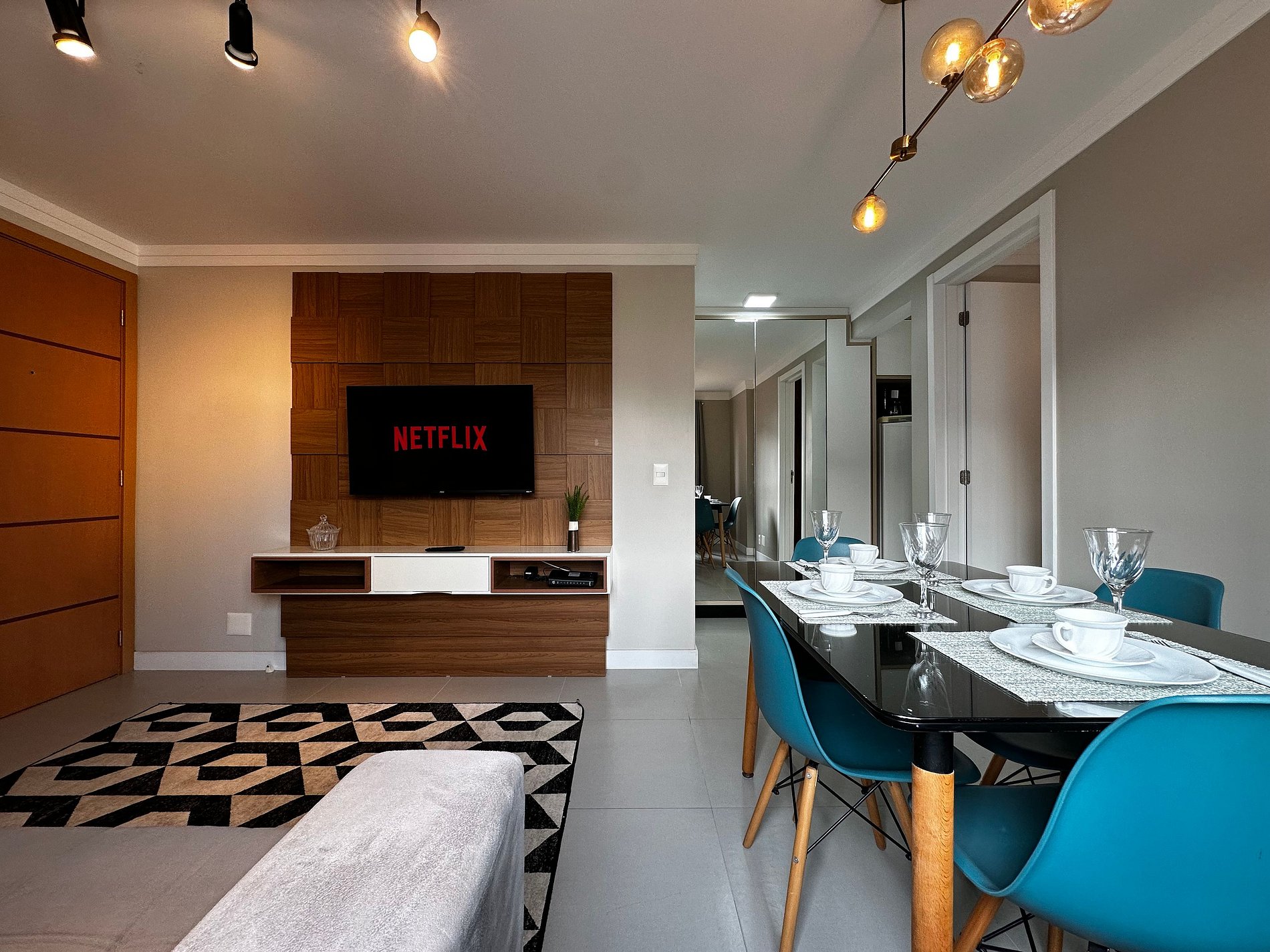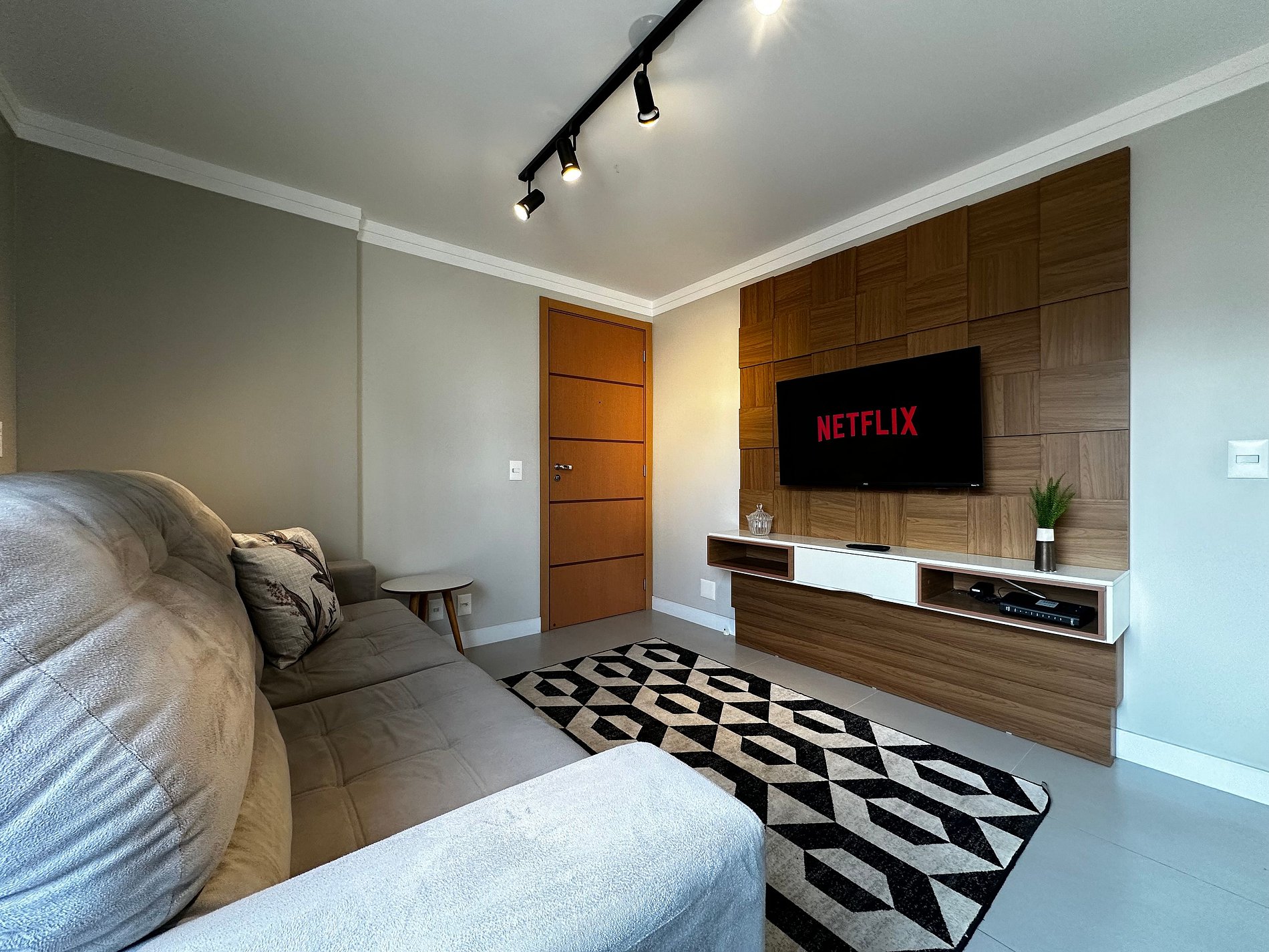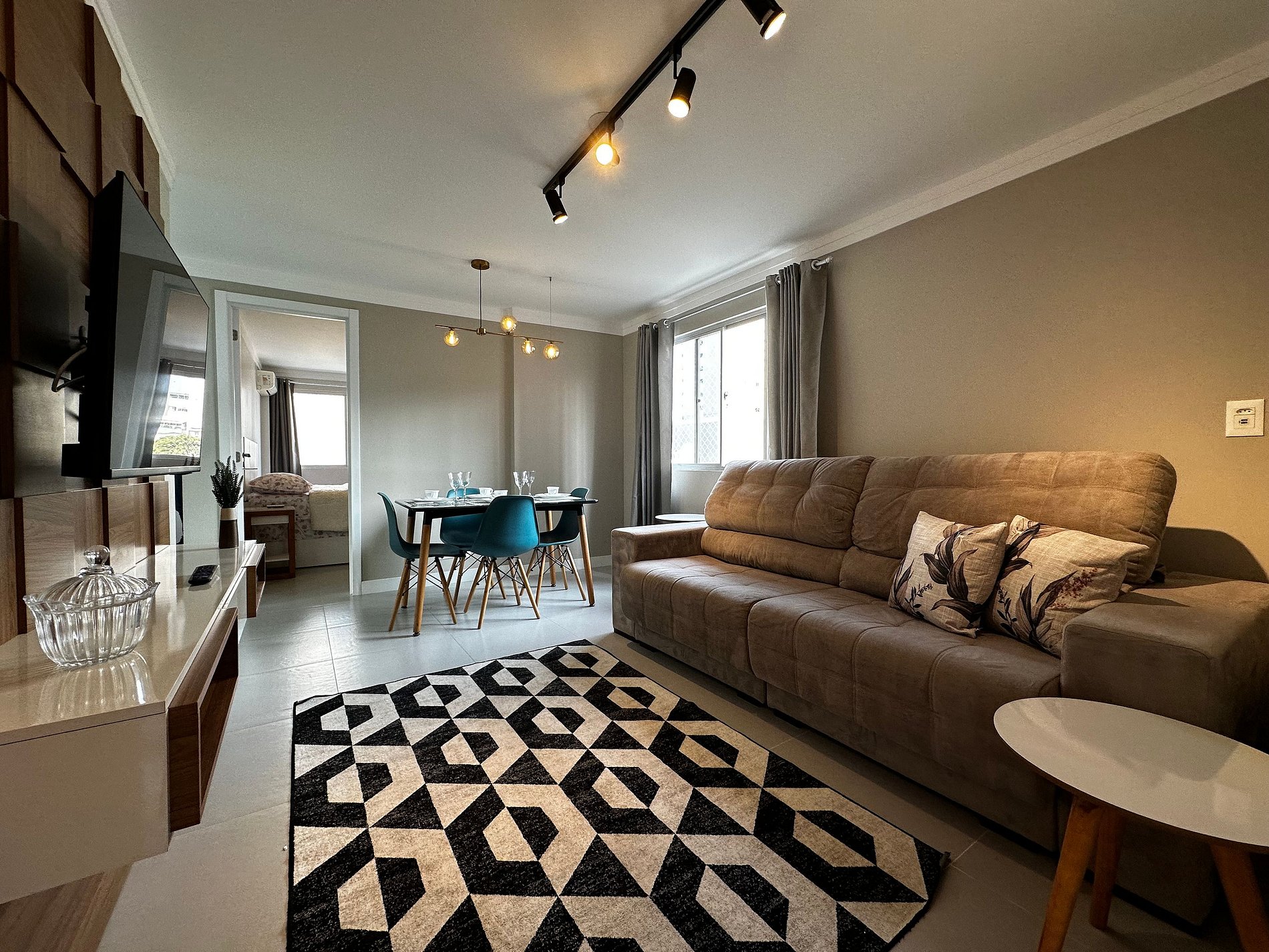 - Sala com TV 43" Smart com app como Netflix, Globoplay, Amazon Prime (necessário conectar com a conta própria) e canais abertos