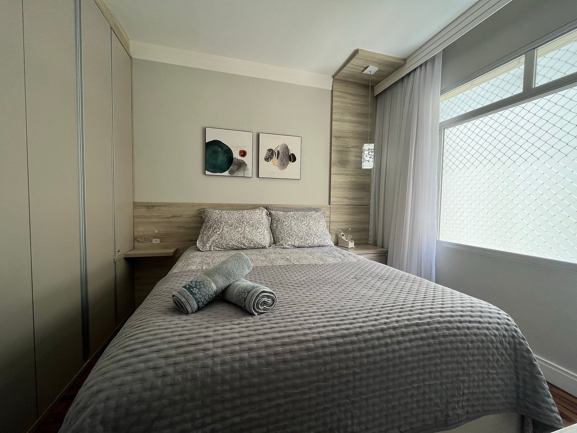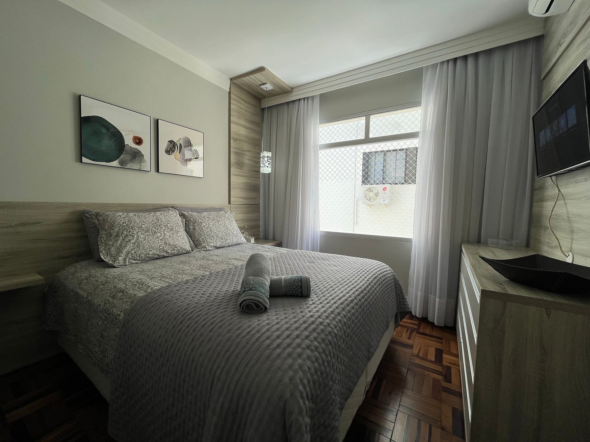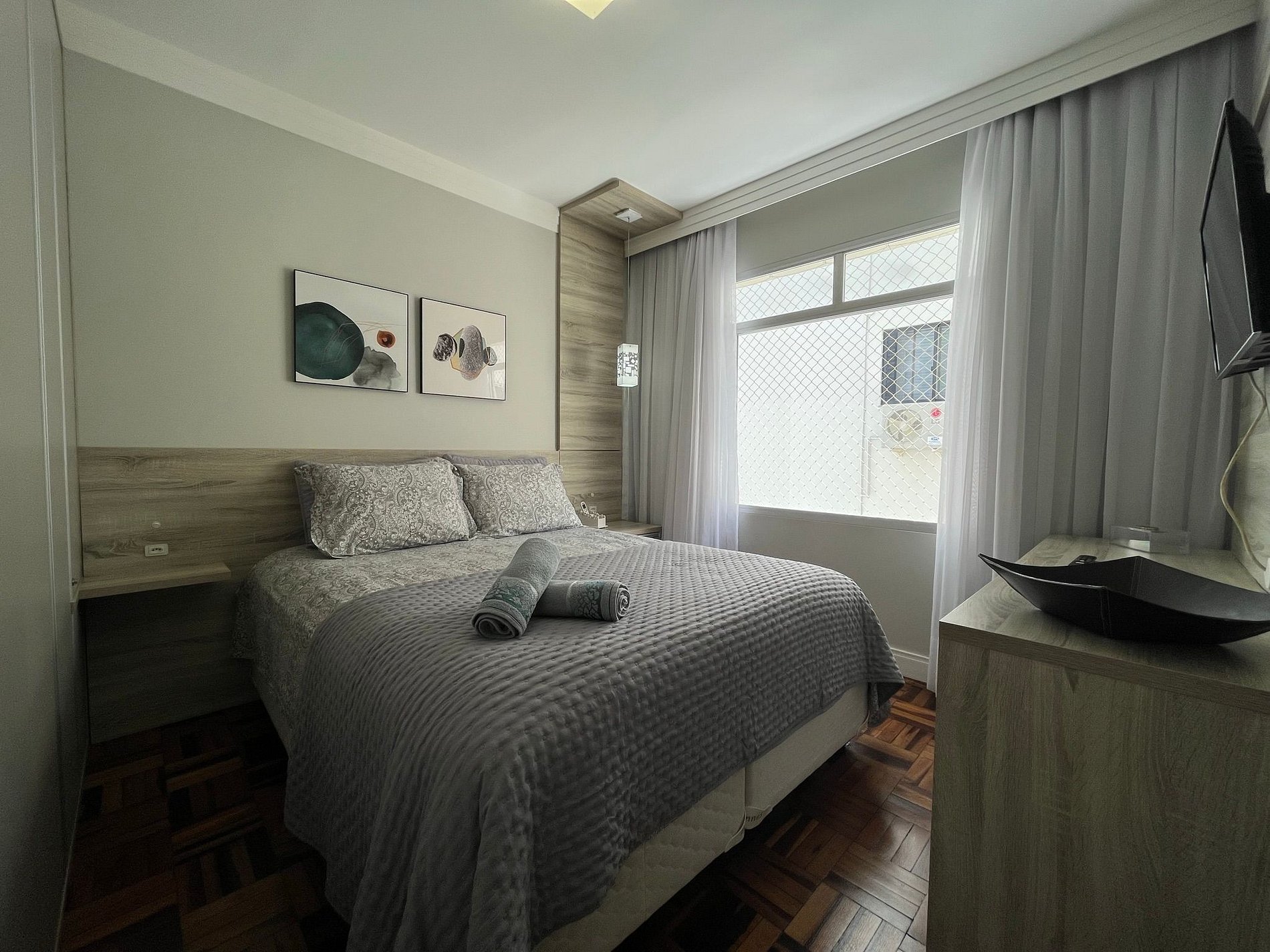 - QUARTO com cama casal box Queen Size e cortinas blackout e TV Smart