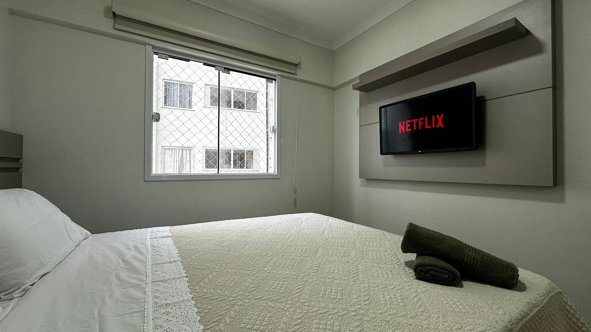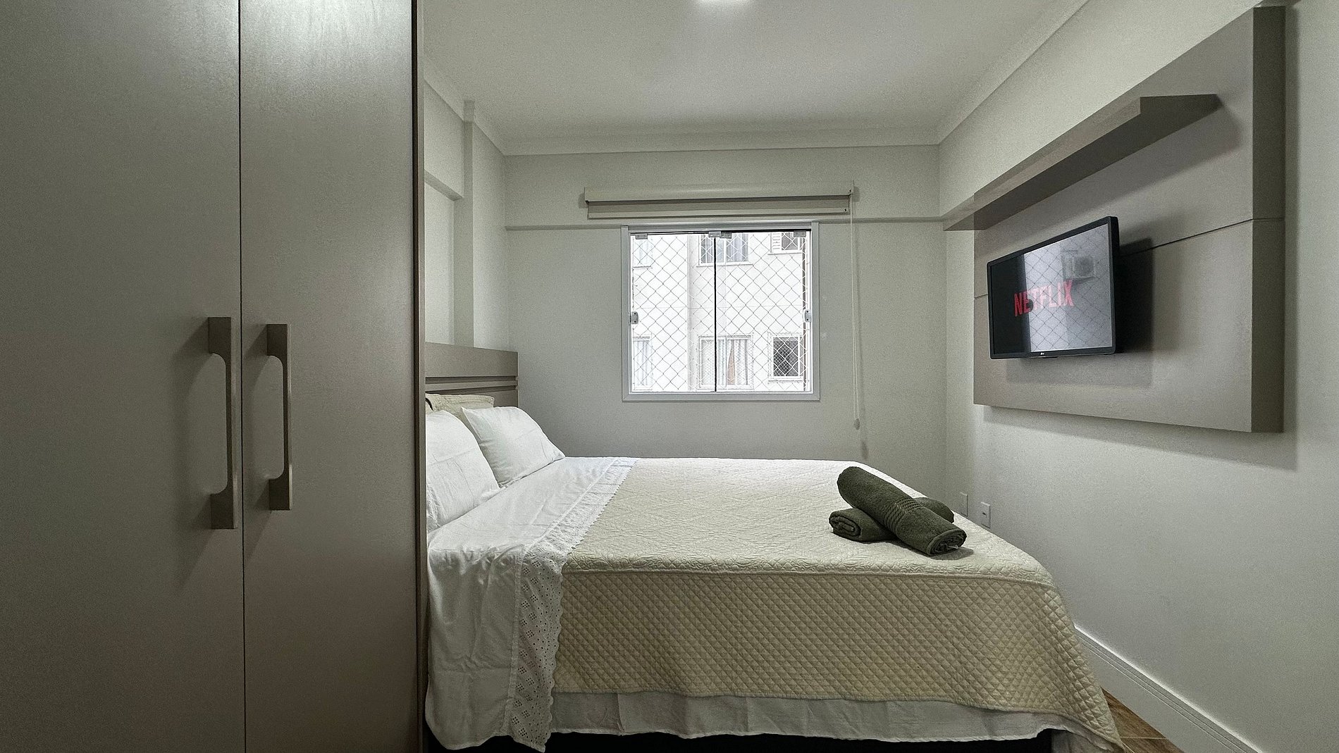 - SUÍTE: Cama box casal Queen Size, TV Smart, somente aplicativos streaming, guarda roupa