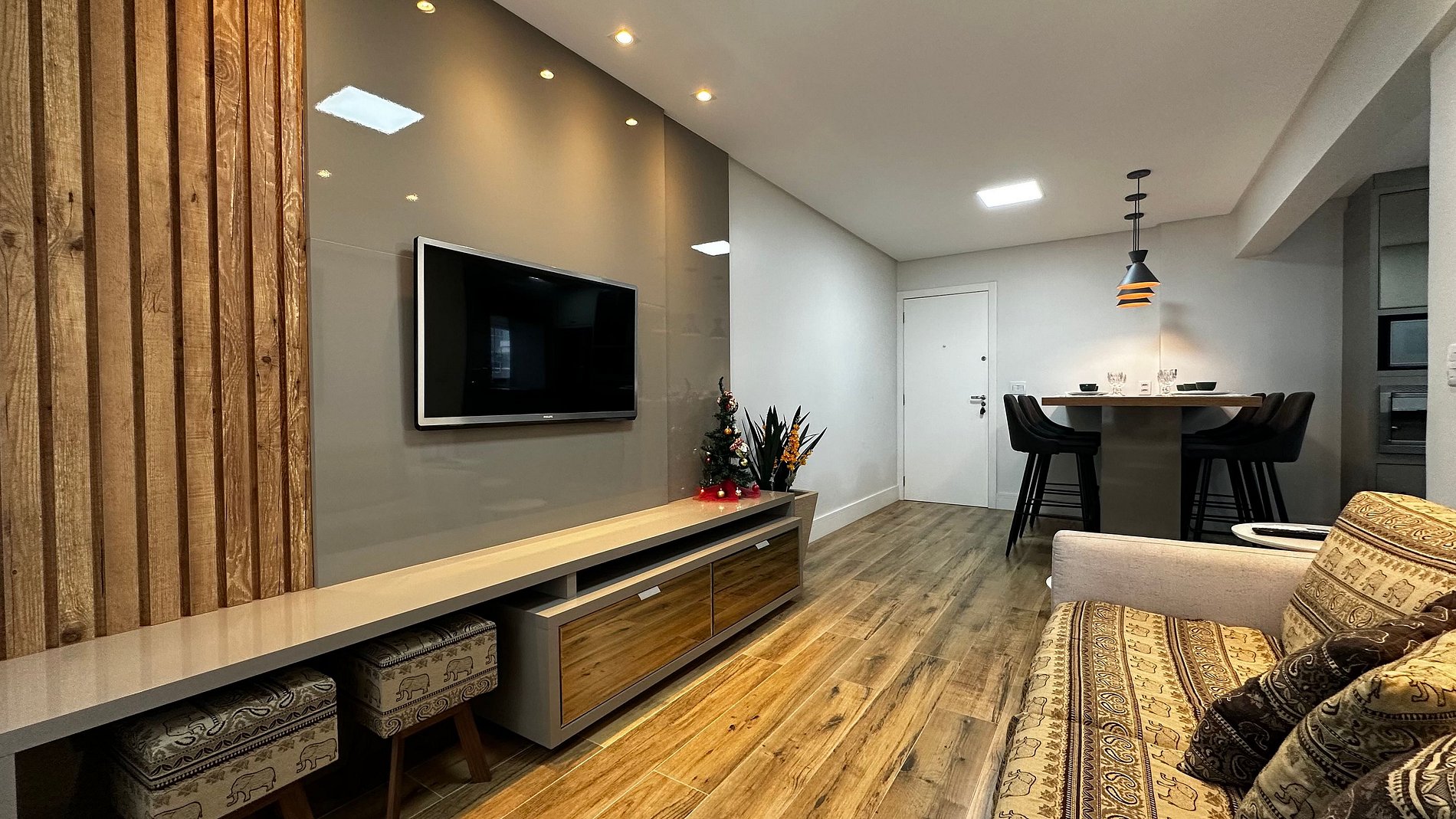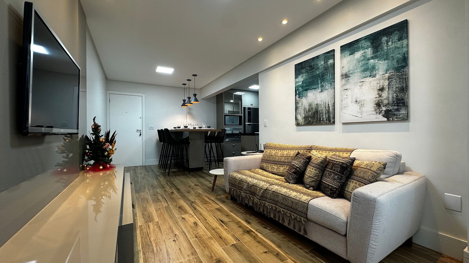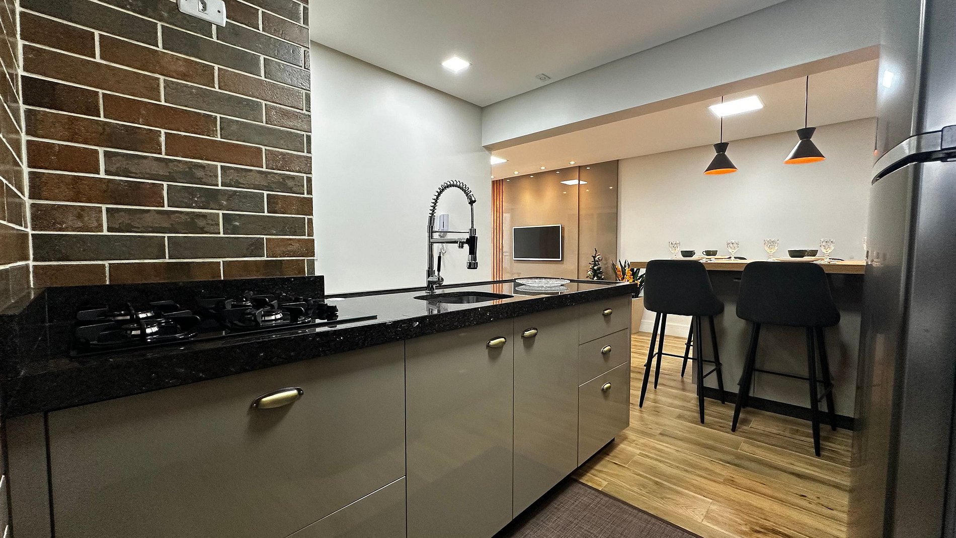 - Mesa de jantar alta com 6 cadeiras integrada a cozinha com bancada americana e sala, trazendo amplitude e integração entre os hóspedes