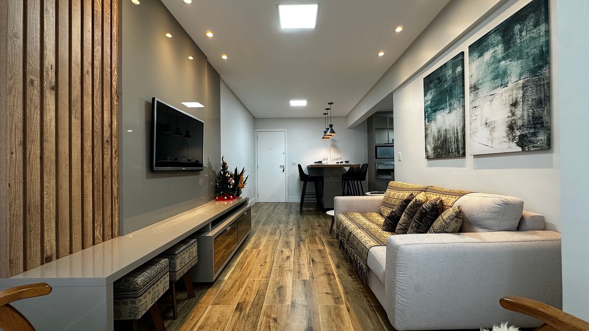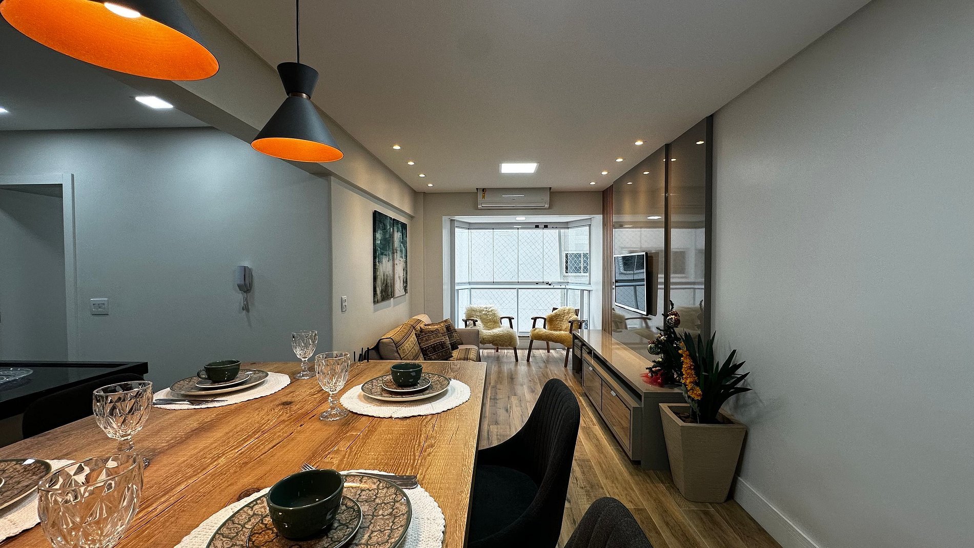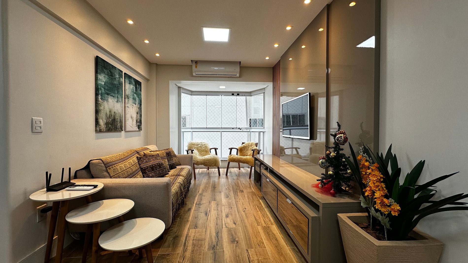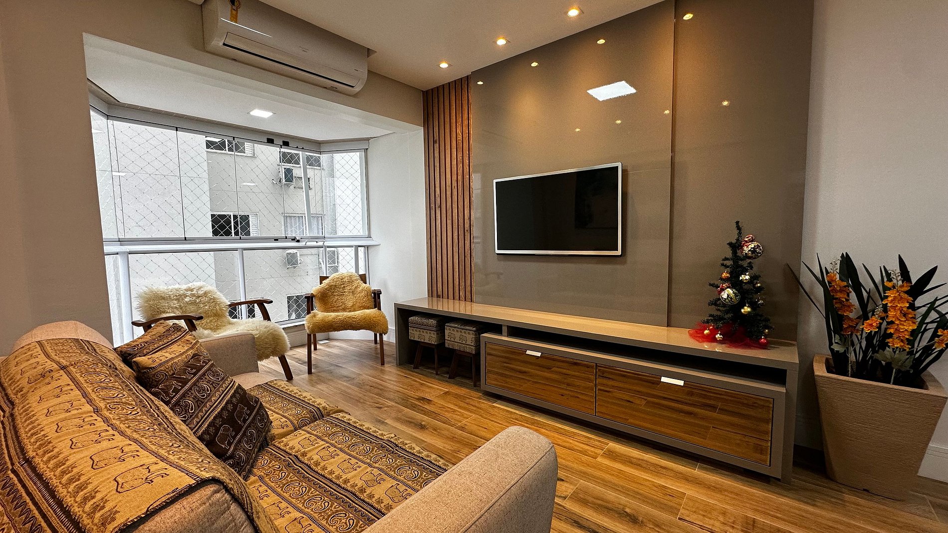- Sala com sofá grande + duas poltronas, ar condicionado split e TV 47" polegadas