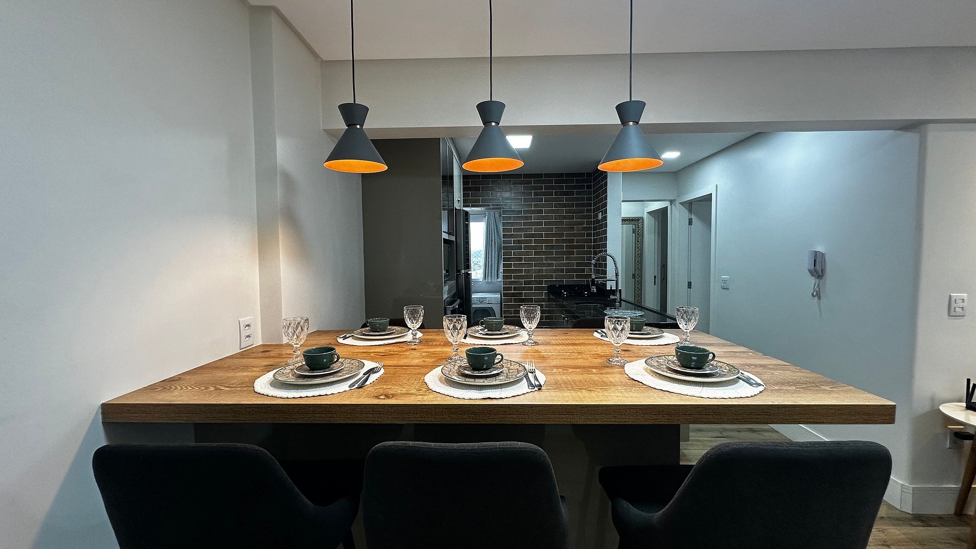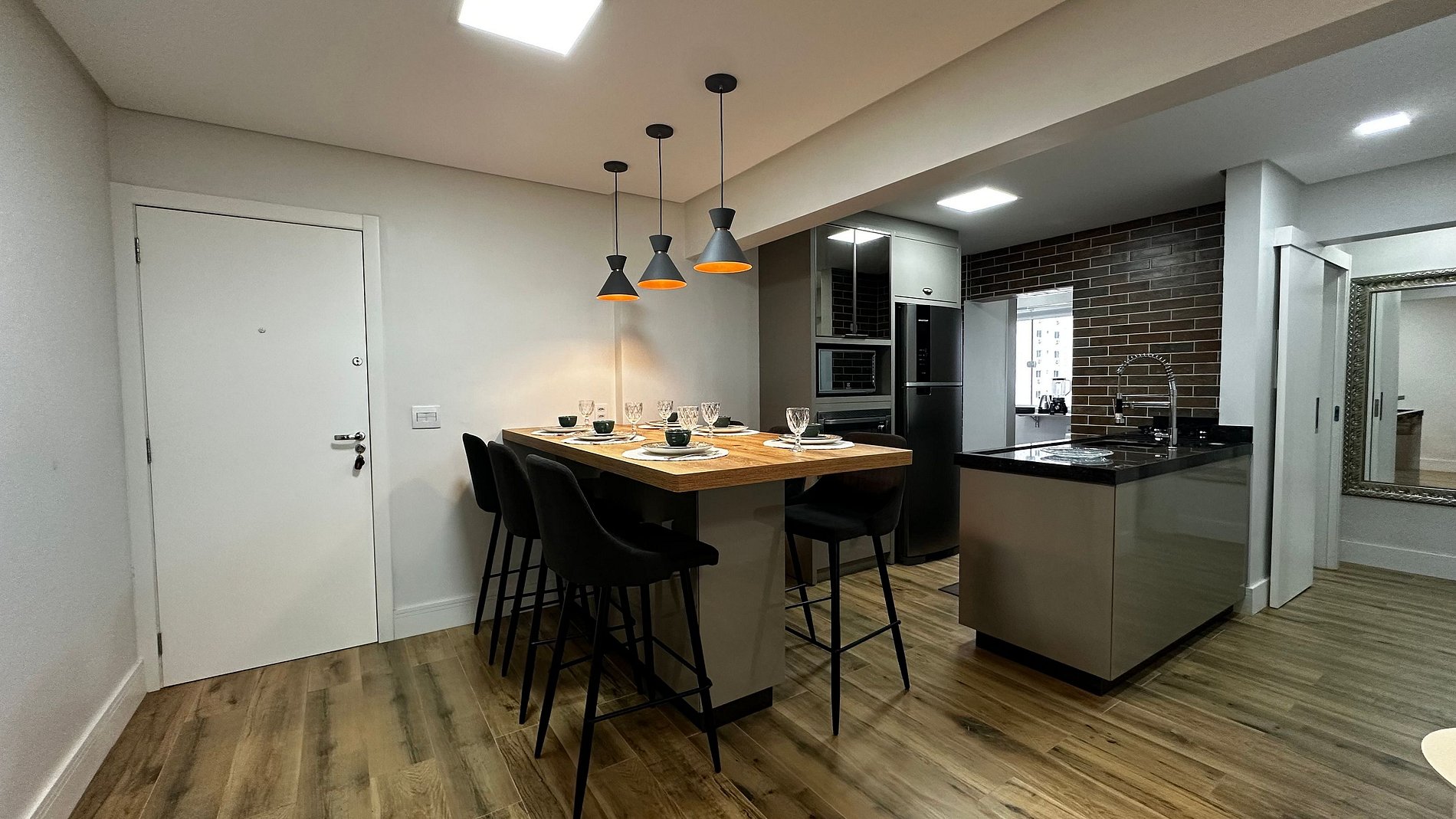 - Mesa de jantar alta com 6 cadeiras integrada a cozinha com bancada americana e sala, trazendo amplitude e integração entre os hóspedes