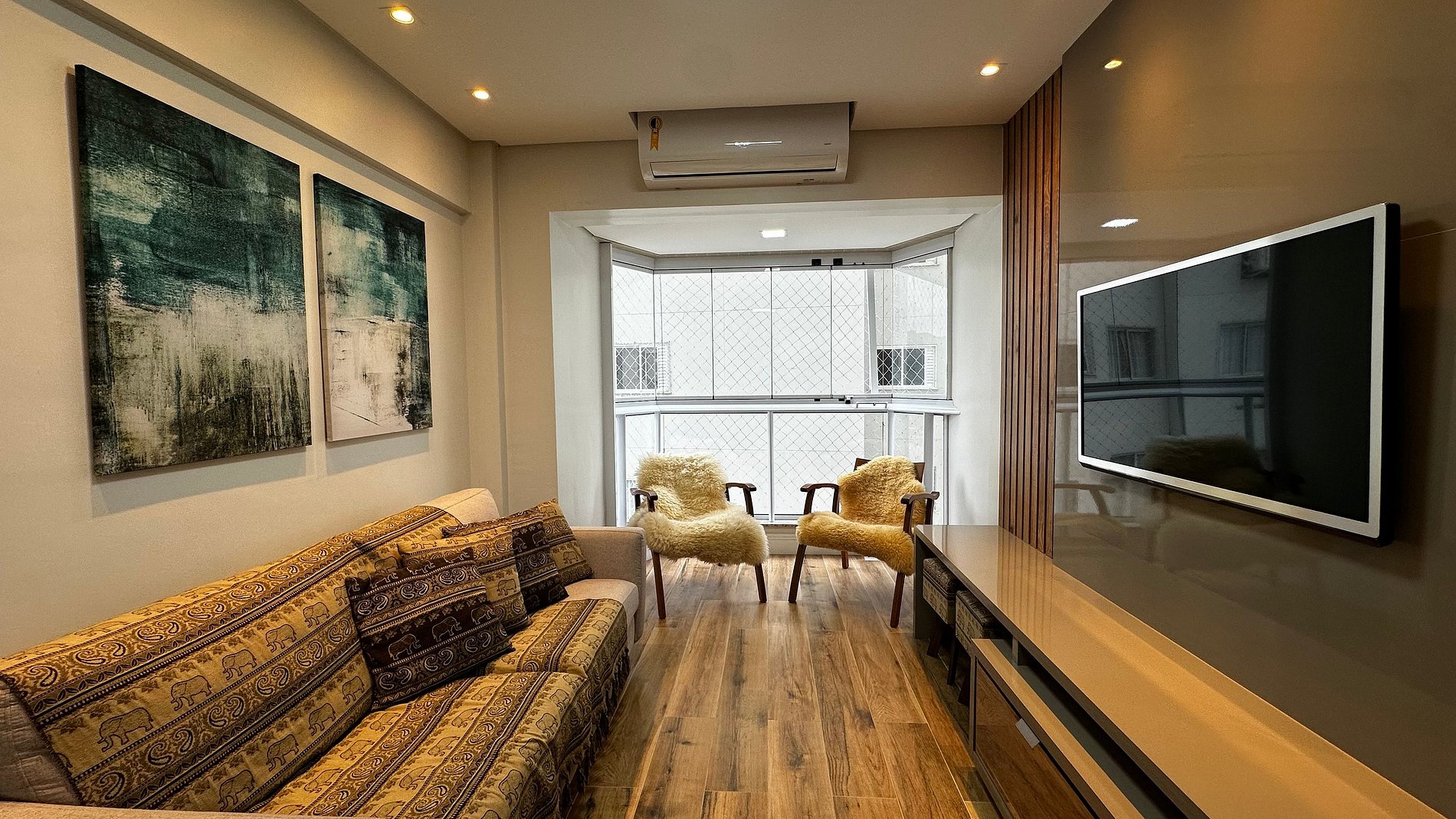 - Sala com sofá grande + duas poltronas, ar condicionado split e TV 47" polegadas