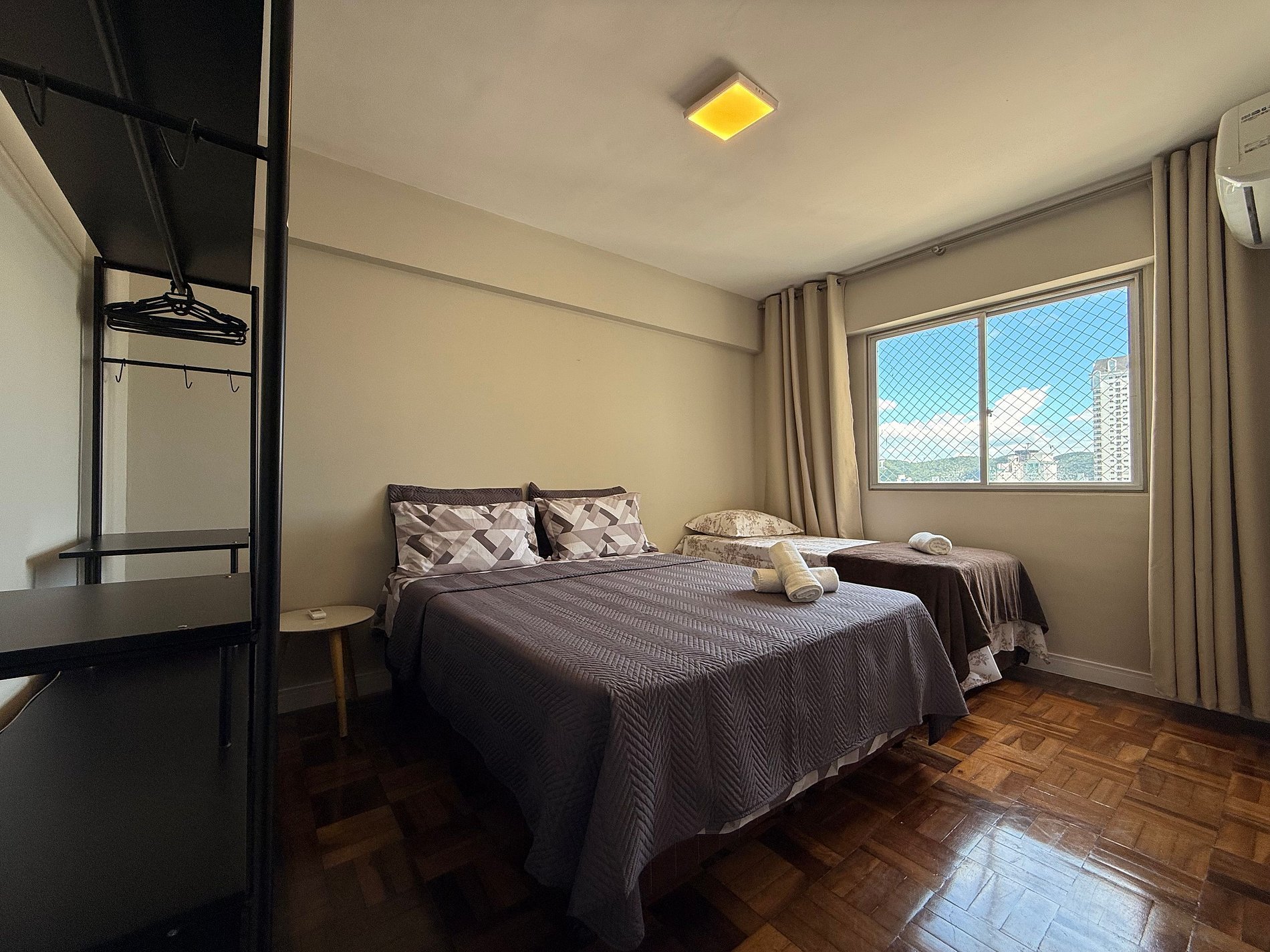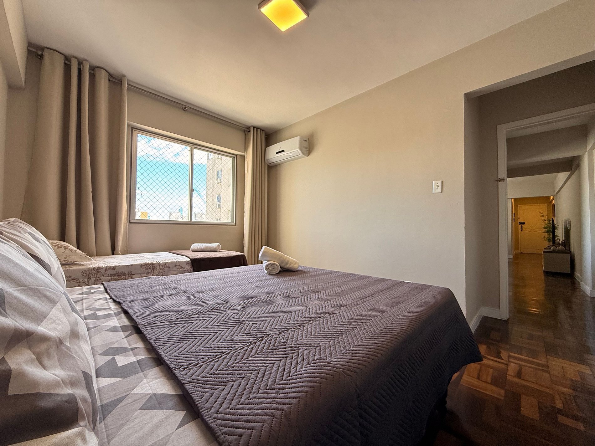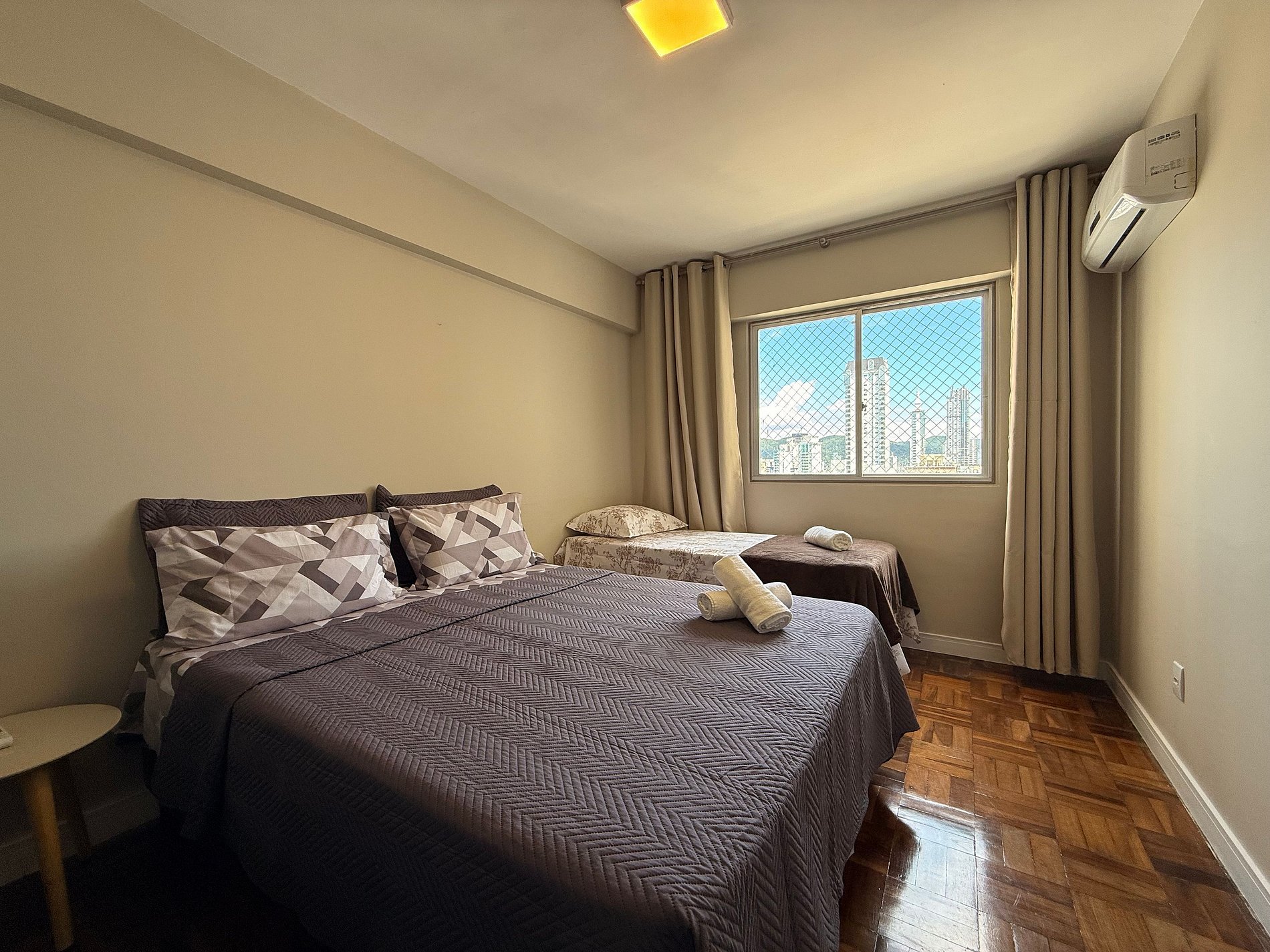 - Composto por 2 quartos, ambos com ar condicionado novo split e blackout