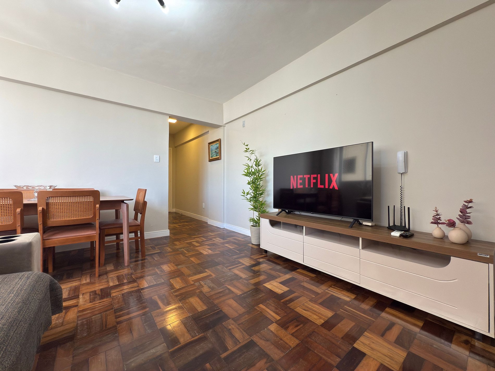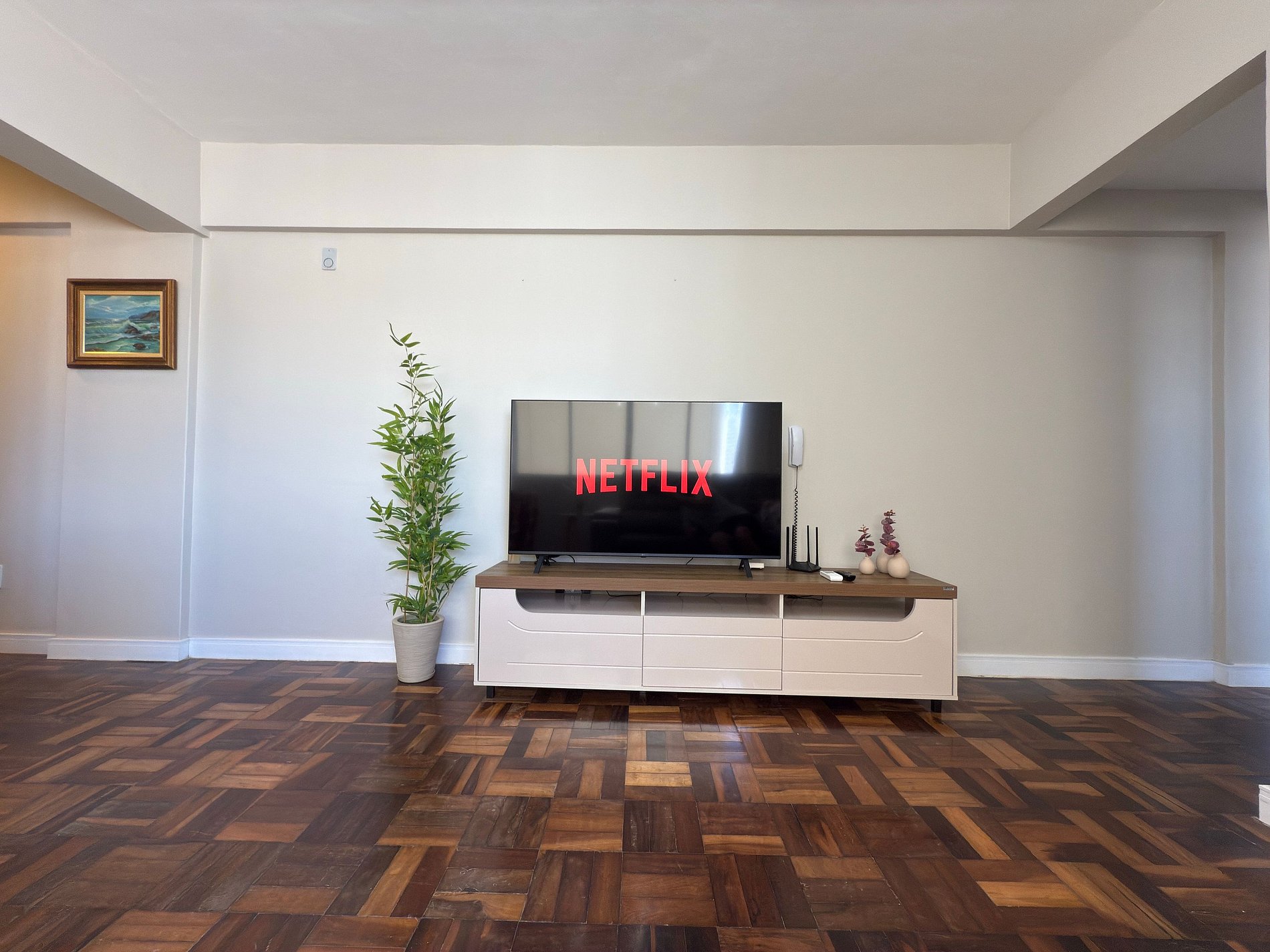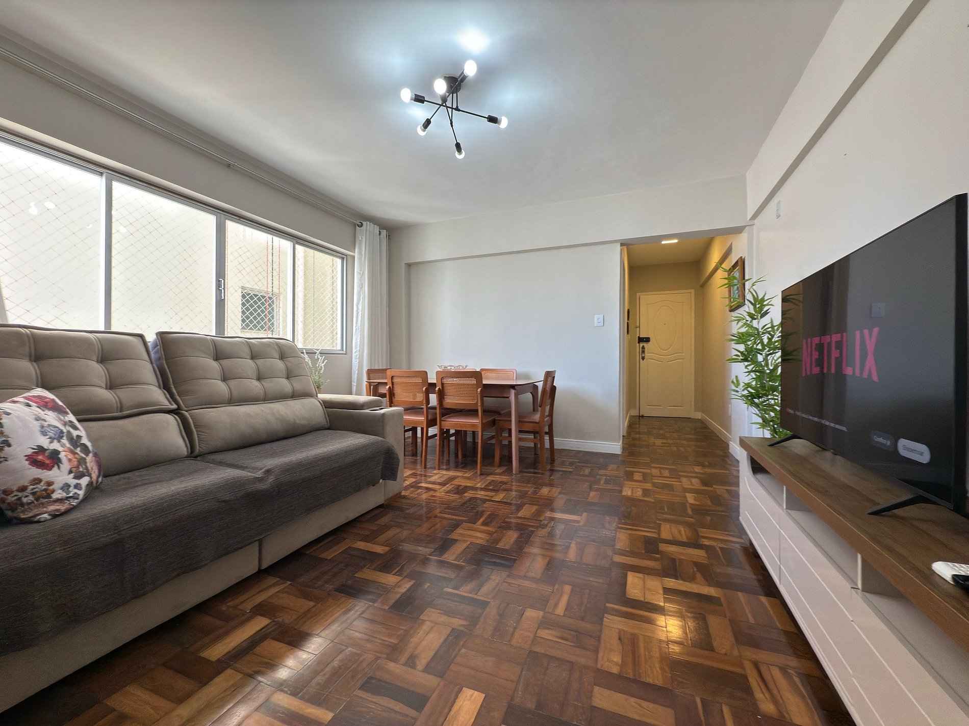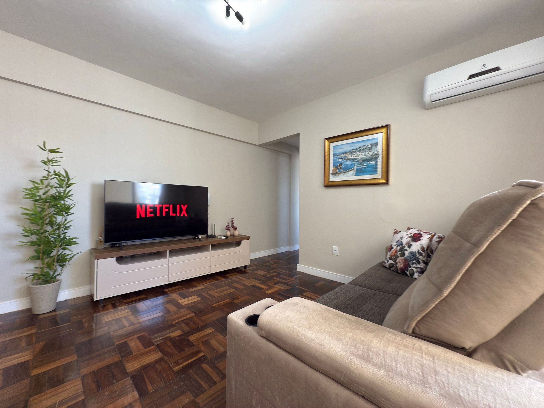 - Sala com ar condicionado, sofá grande, TV Smart 50" polegadas app streaming (necessário conectar própria conta)