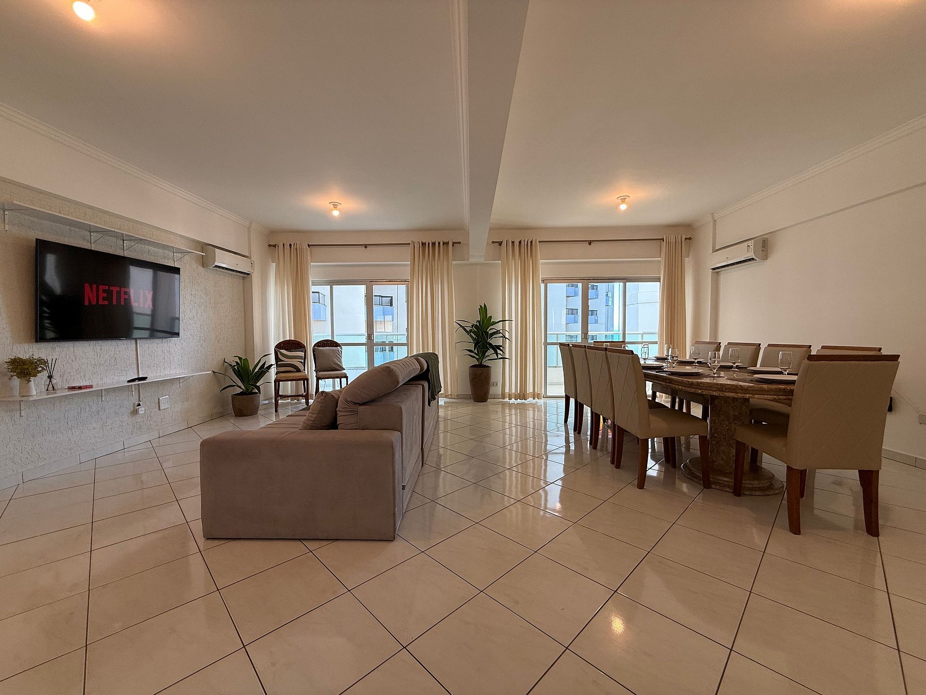 Excelente apartamento localizado na praia central de Balneário Camboriú, acomoda até 16 hóspedes, algo extremamente raro de encontrar devido a limitação de hóspedes por apartamentos imposto pelos condomínios. Eram dois apartamentos que formaram um só, trazendo muito conforto entre seus 5 quartos, sendo 3 deles suítes completas. Sala ampla com mesa jantar 10 lugares e sofá de 3 metros para assistir uma tela de 65" polegadas! Sacada com vista para o mar, 2 vagas de garagem e internet rápida.