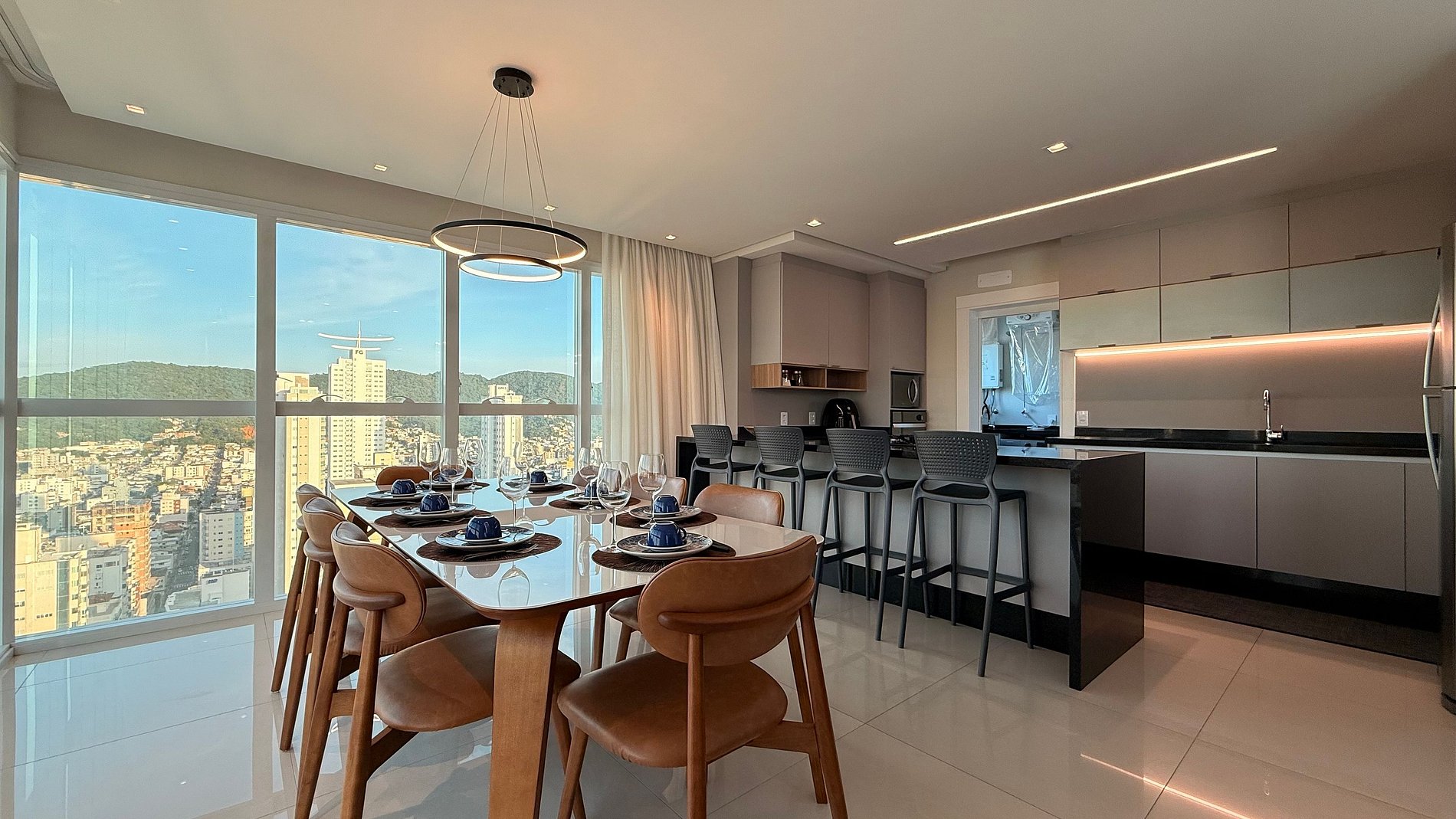 - Ambiente todo integrado sala, mesa jantar e cozinha com bancada em ilha e com ar condicionado climatizando todo ambiente