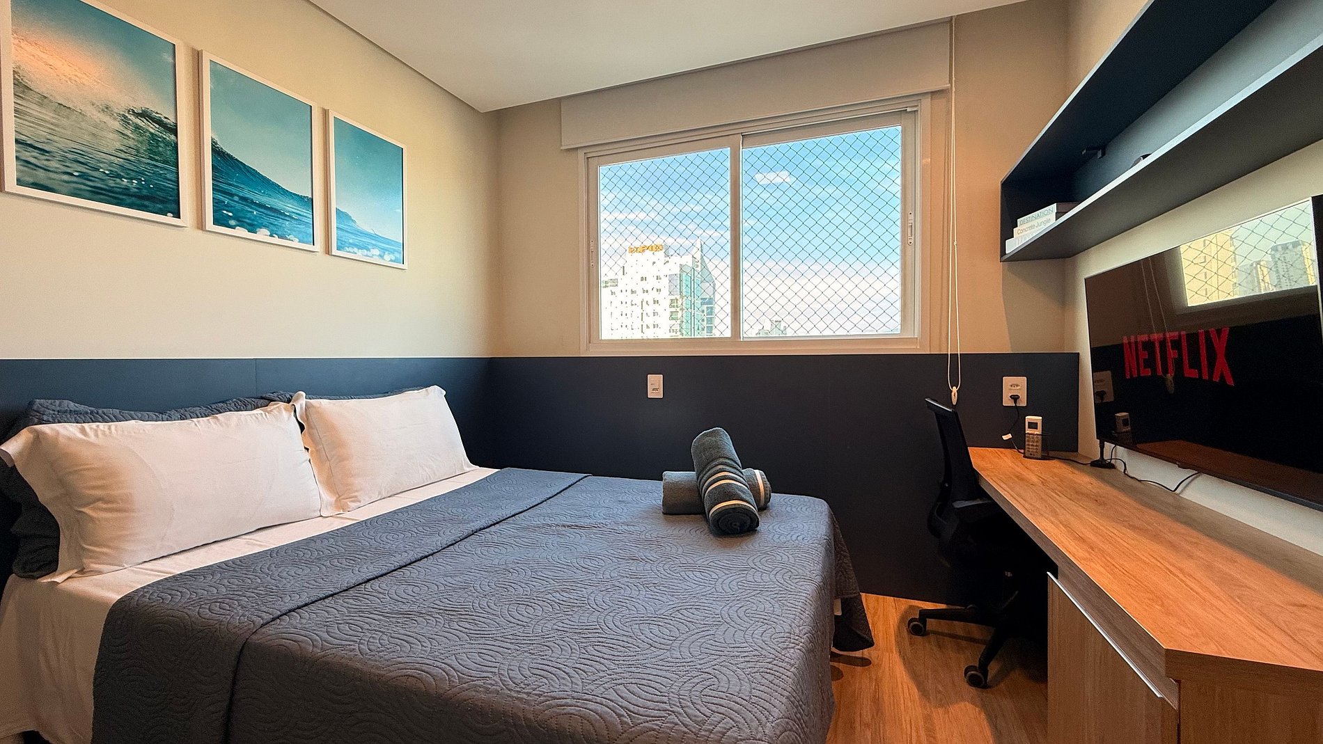 - DEMI-SUÍTE 2: Cama Casal Box com guarda roupa, TV 43" Smart e janela com vista para o mar e cidade