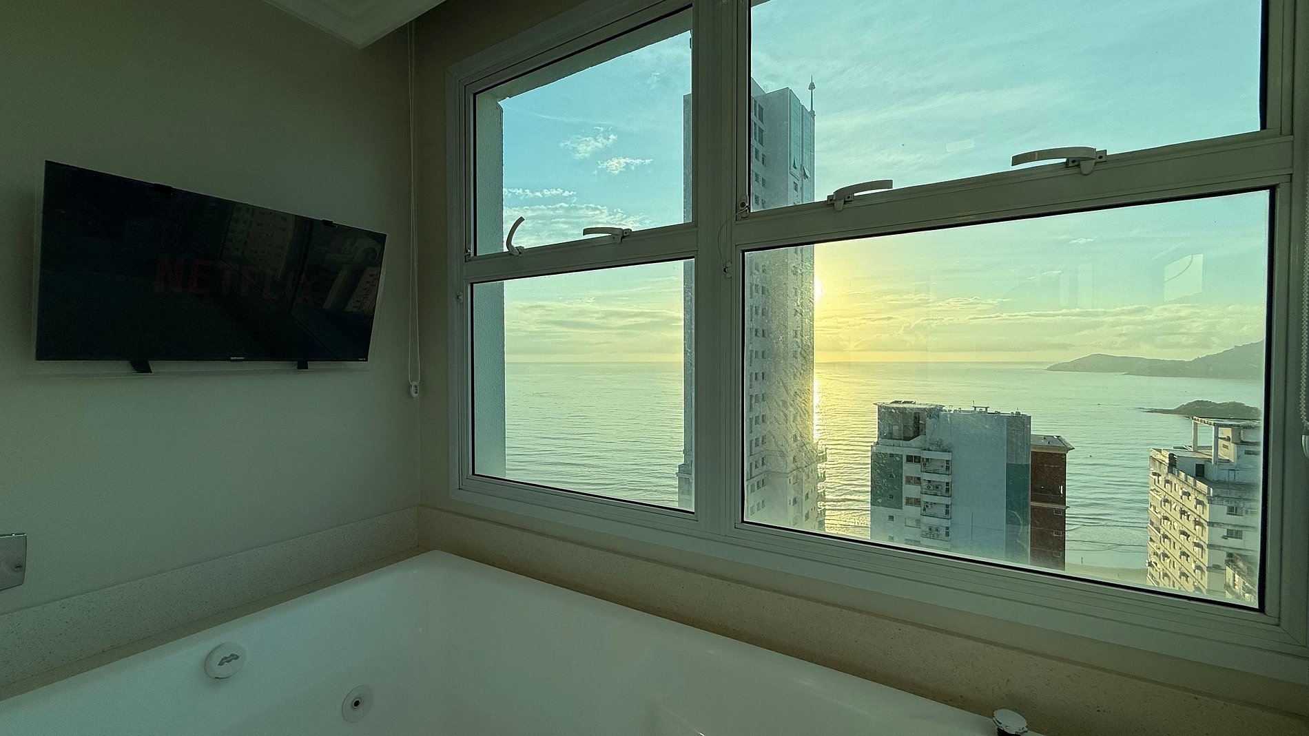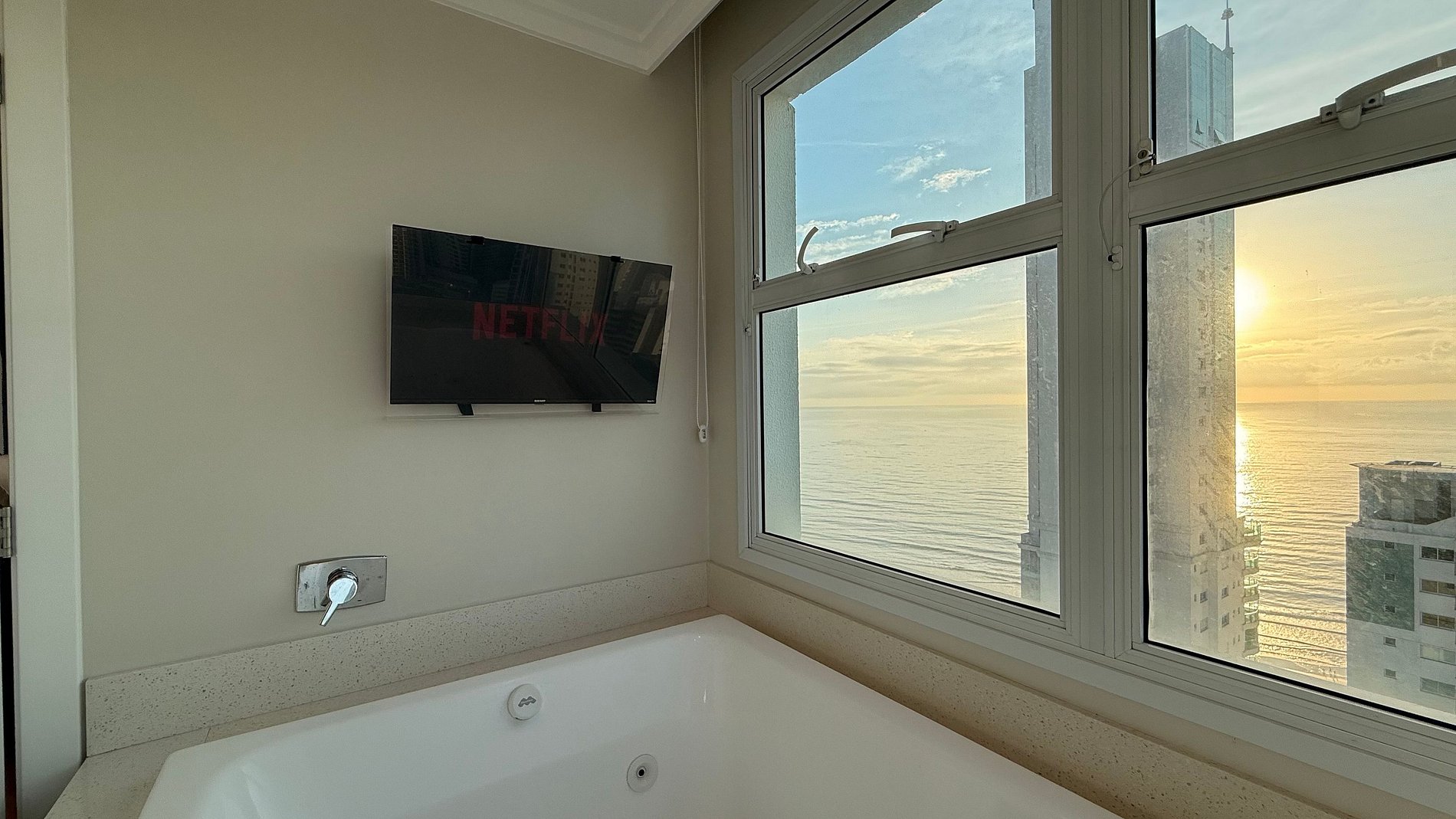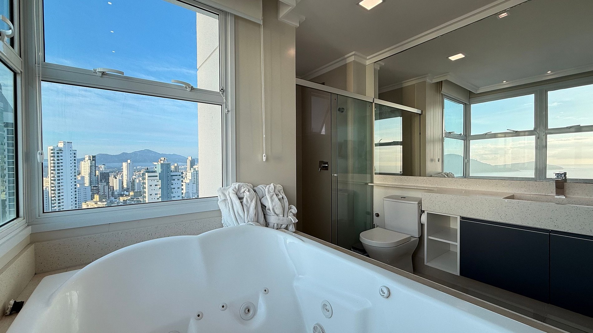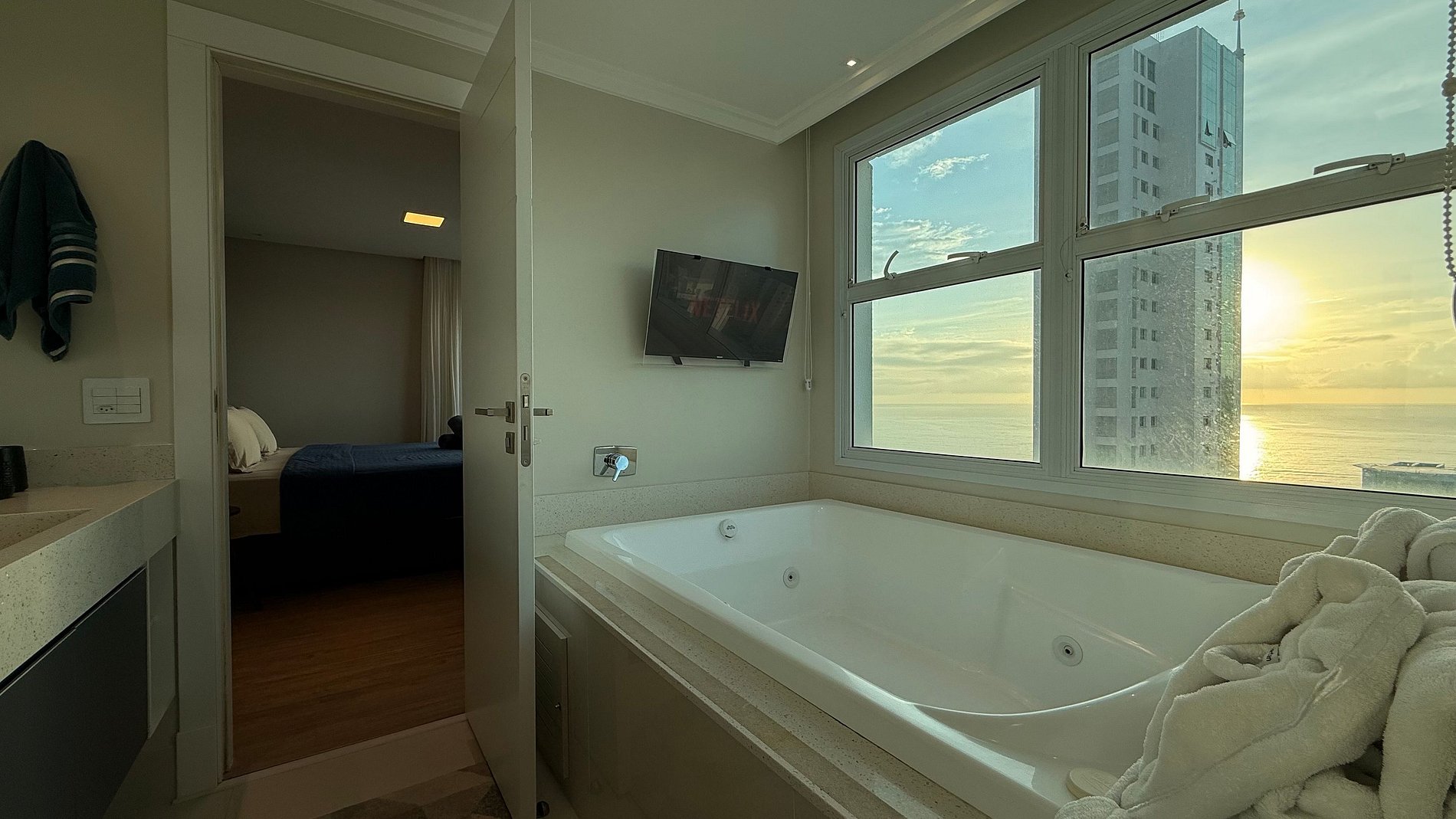 - SUÍTE 1 MASTER: Cama Casal King Size com banheira de hidromassagem, TV 50" Smart e vista privilegiada para praia central de Balneário Camboriú e closet grande.