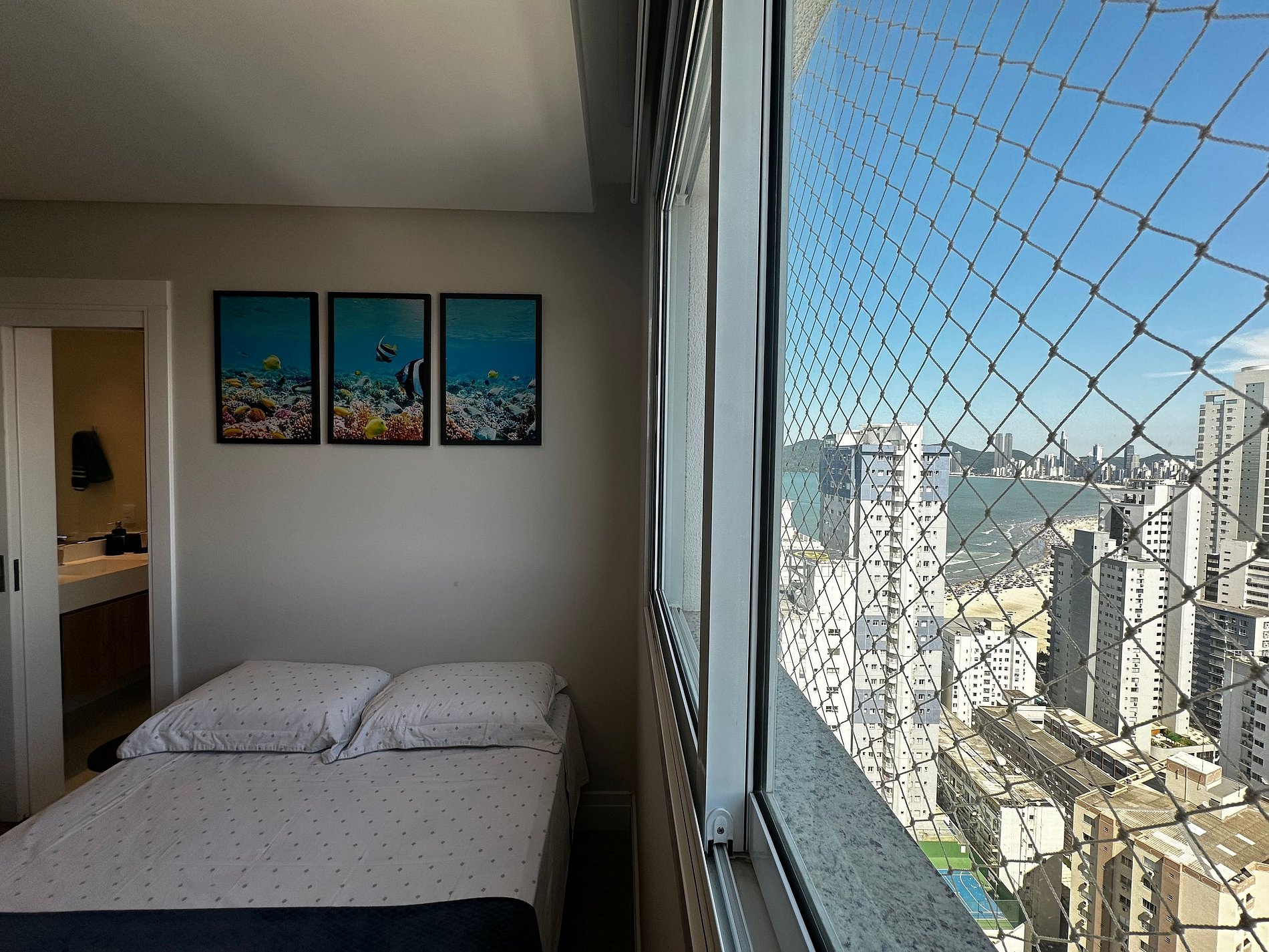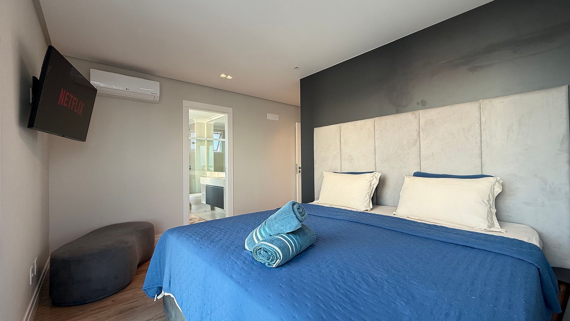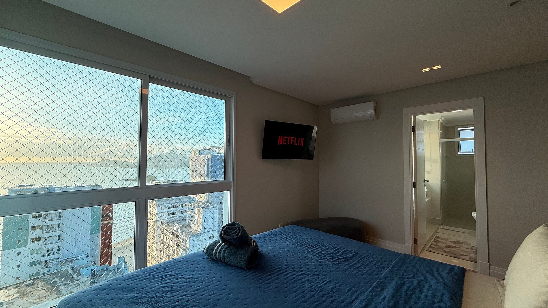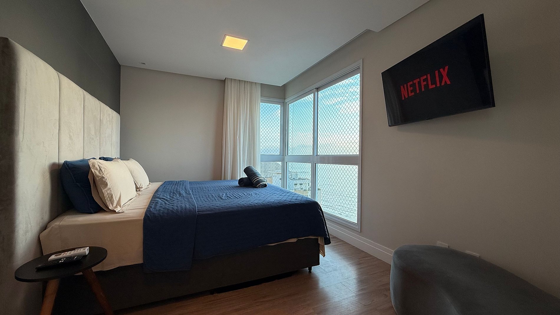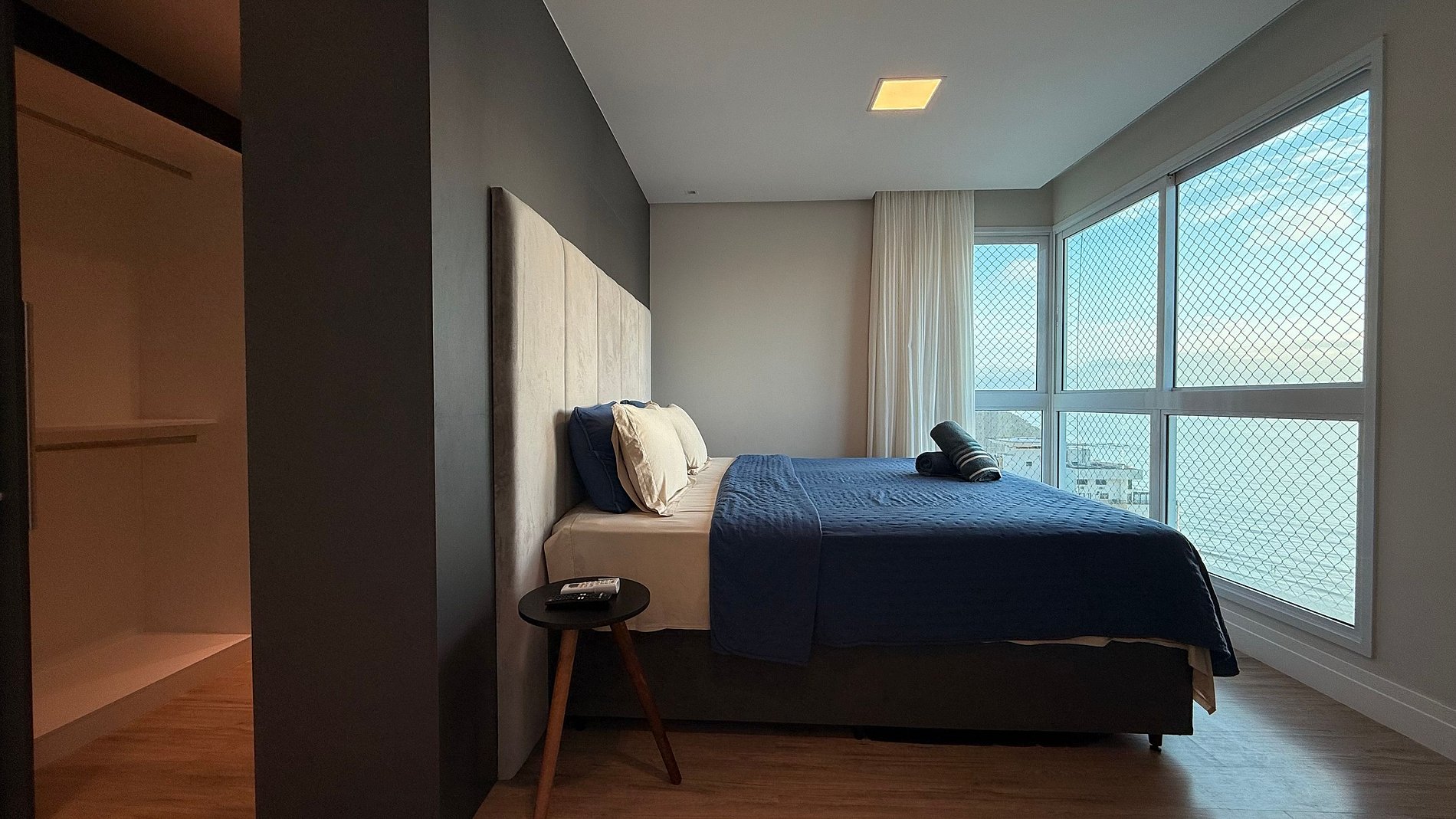 - SUÍTE 1 MASTER: Cama Casal King Size com banheira de hidromassagem, TV 50" Smart e vista privilegiada para praia central de Balneário Camboriú e closet grande.