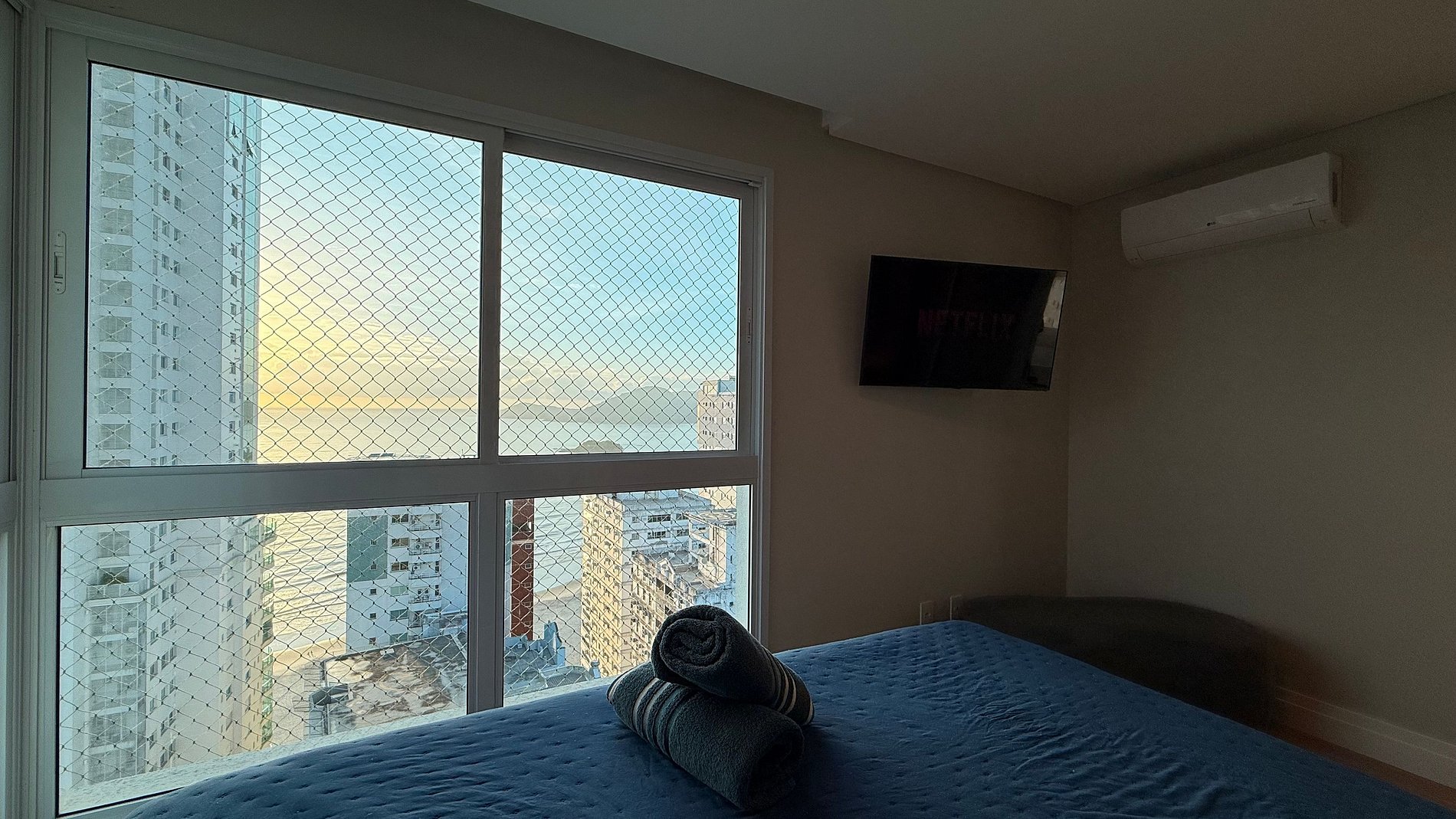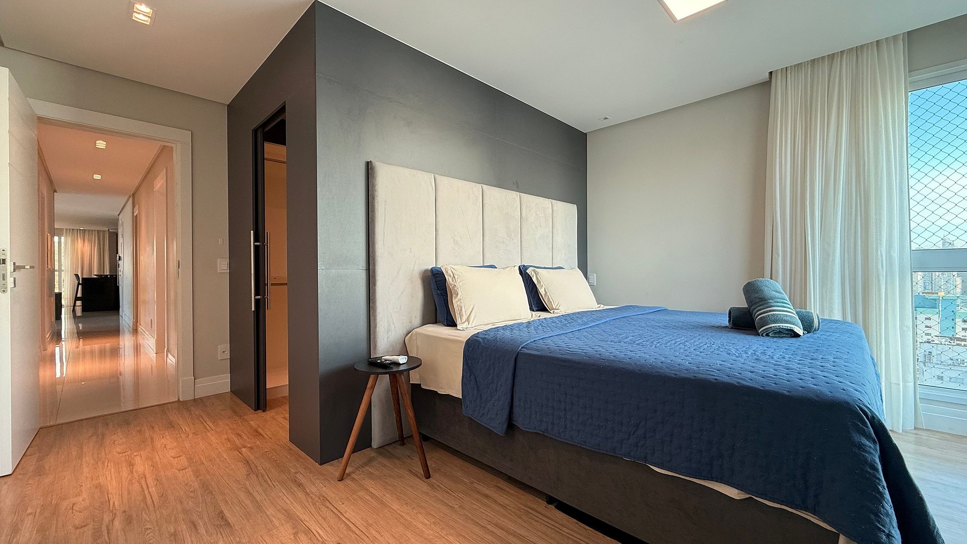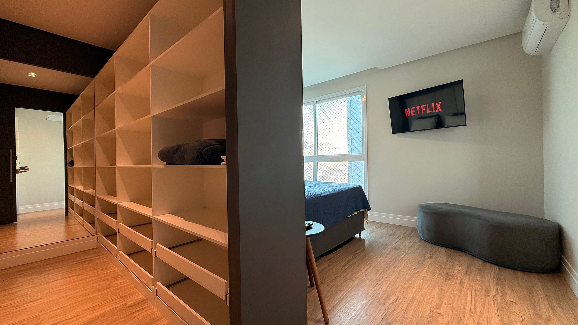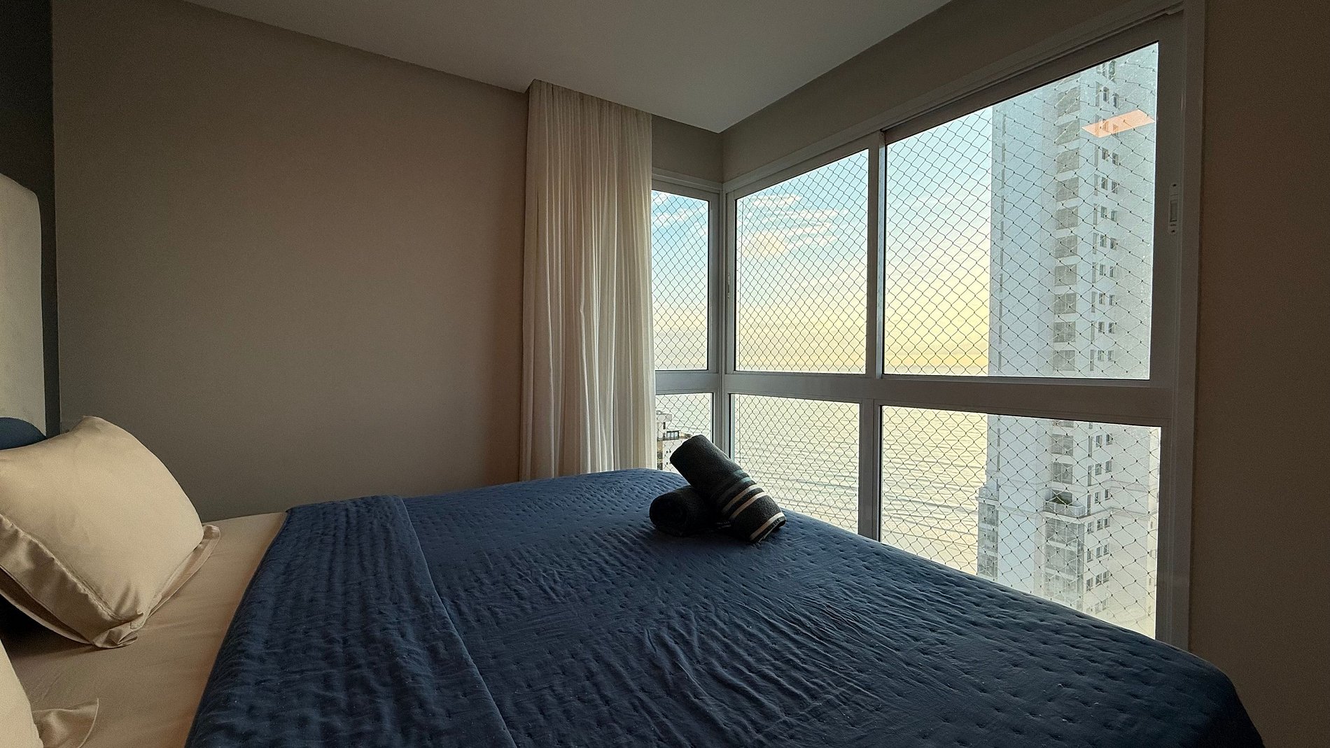 - SUÍTE 1 MASTER: Cama Casal King Size com banheira de hidromassagem, TV 50" Smart e vista privilegiada para praia central de Balneário Camboriú e closet grande.