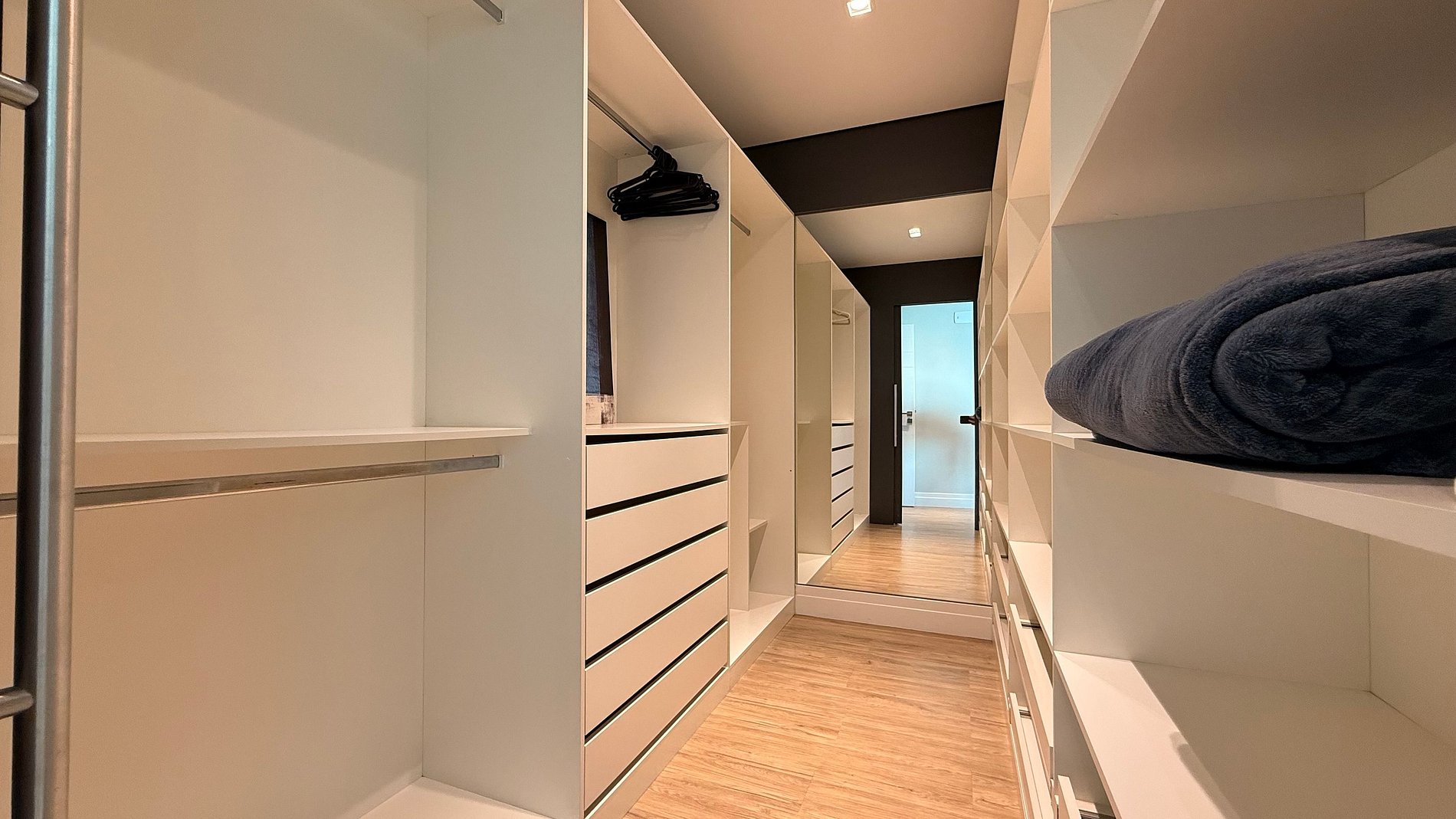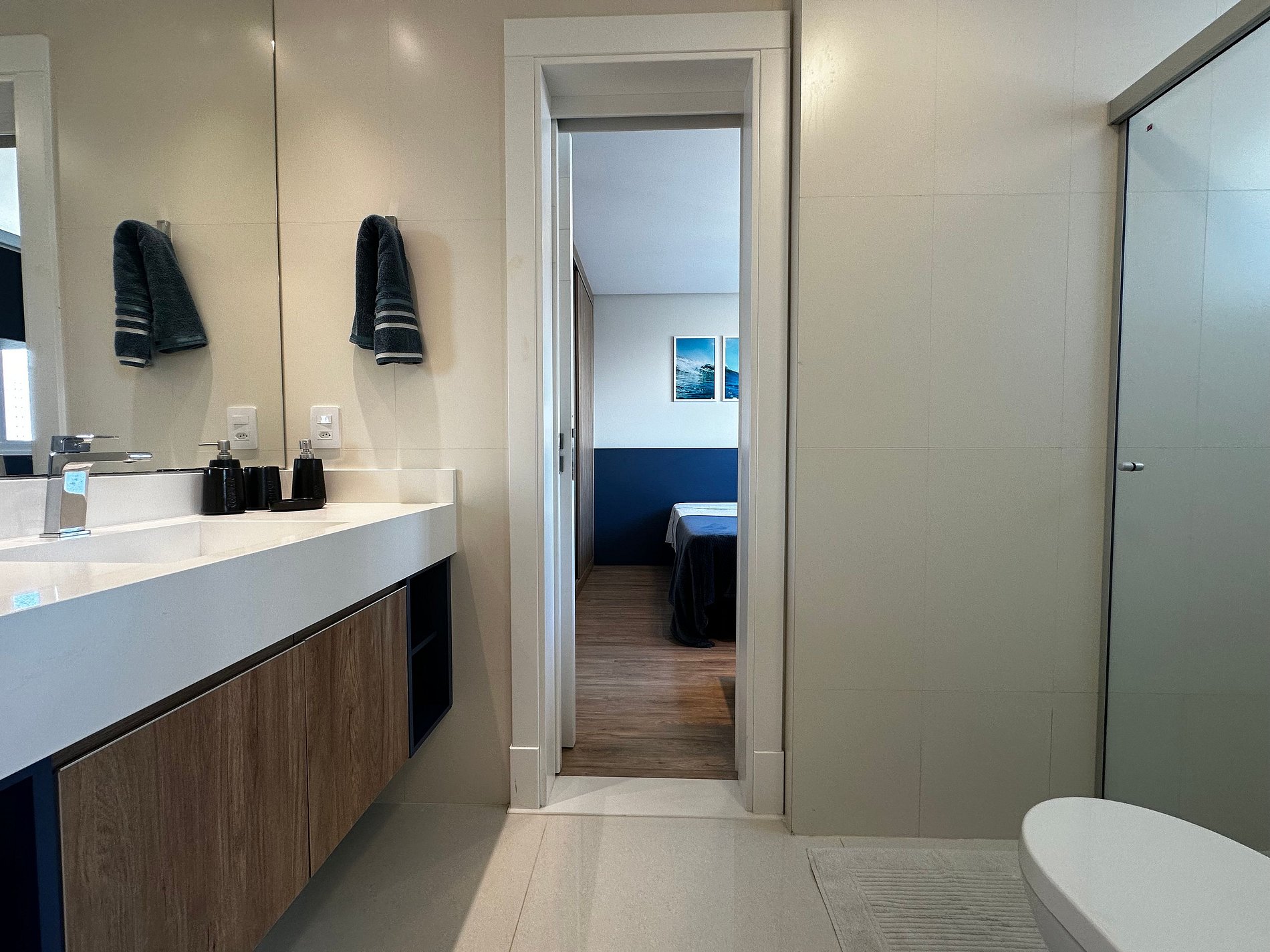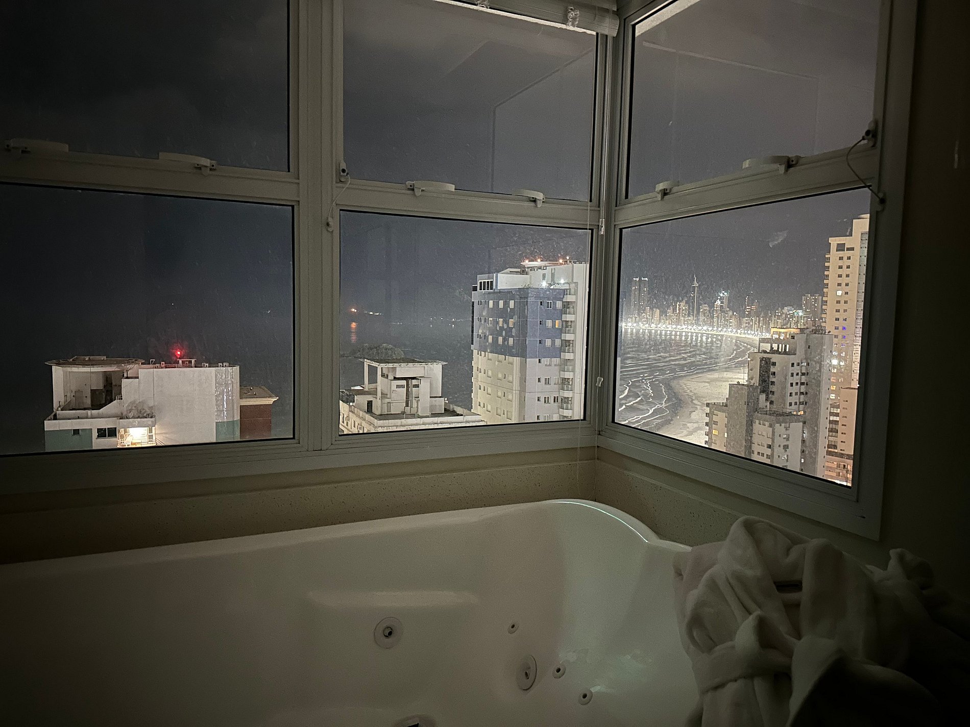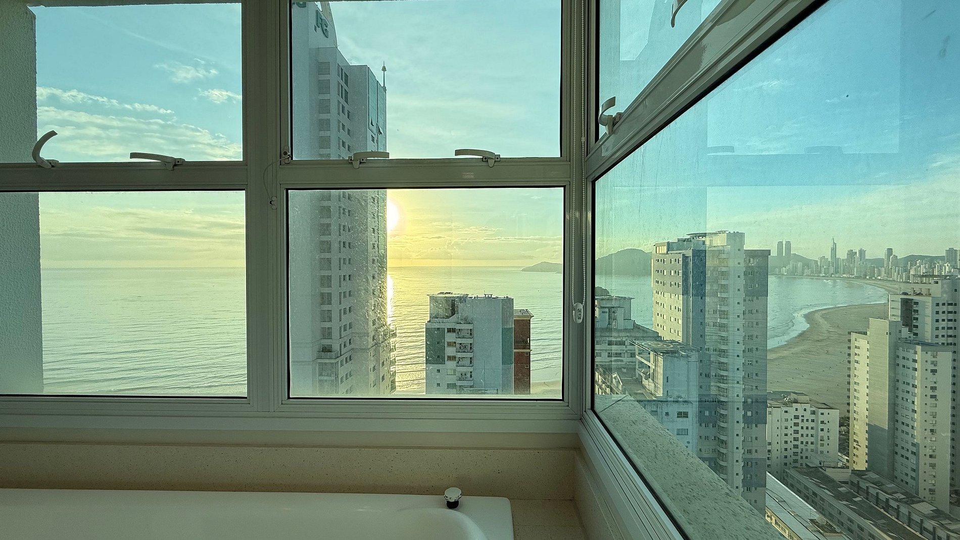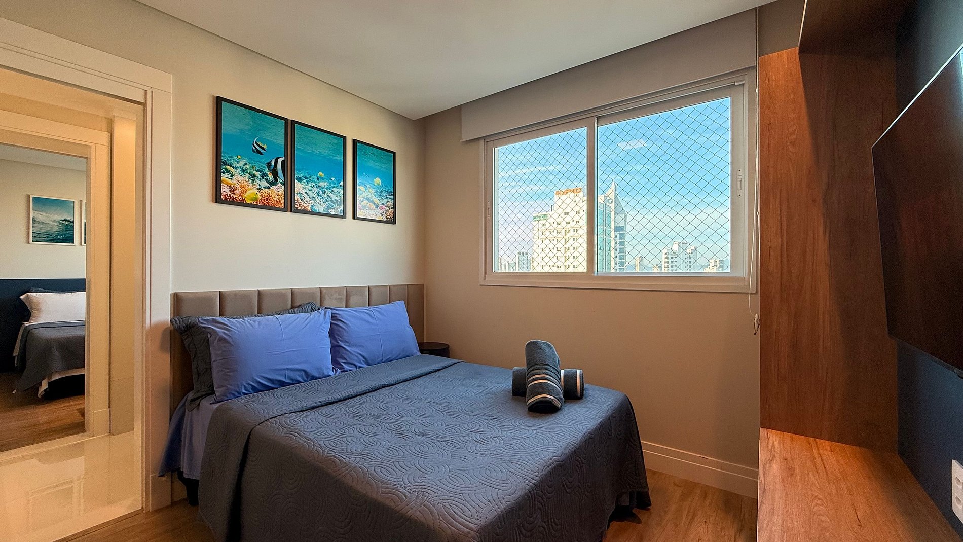 - SUÍTE 1 MASTER: Cama Casal King Size com banheira de hidromassagem, TV 50" Smart e vista privilegiada para praia central de Balneário Camboriú e closet grande.
