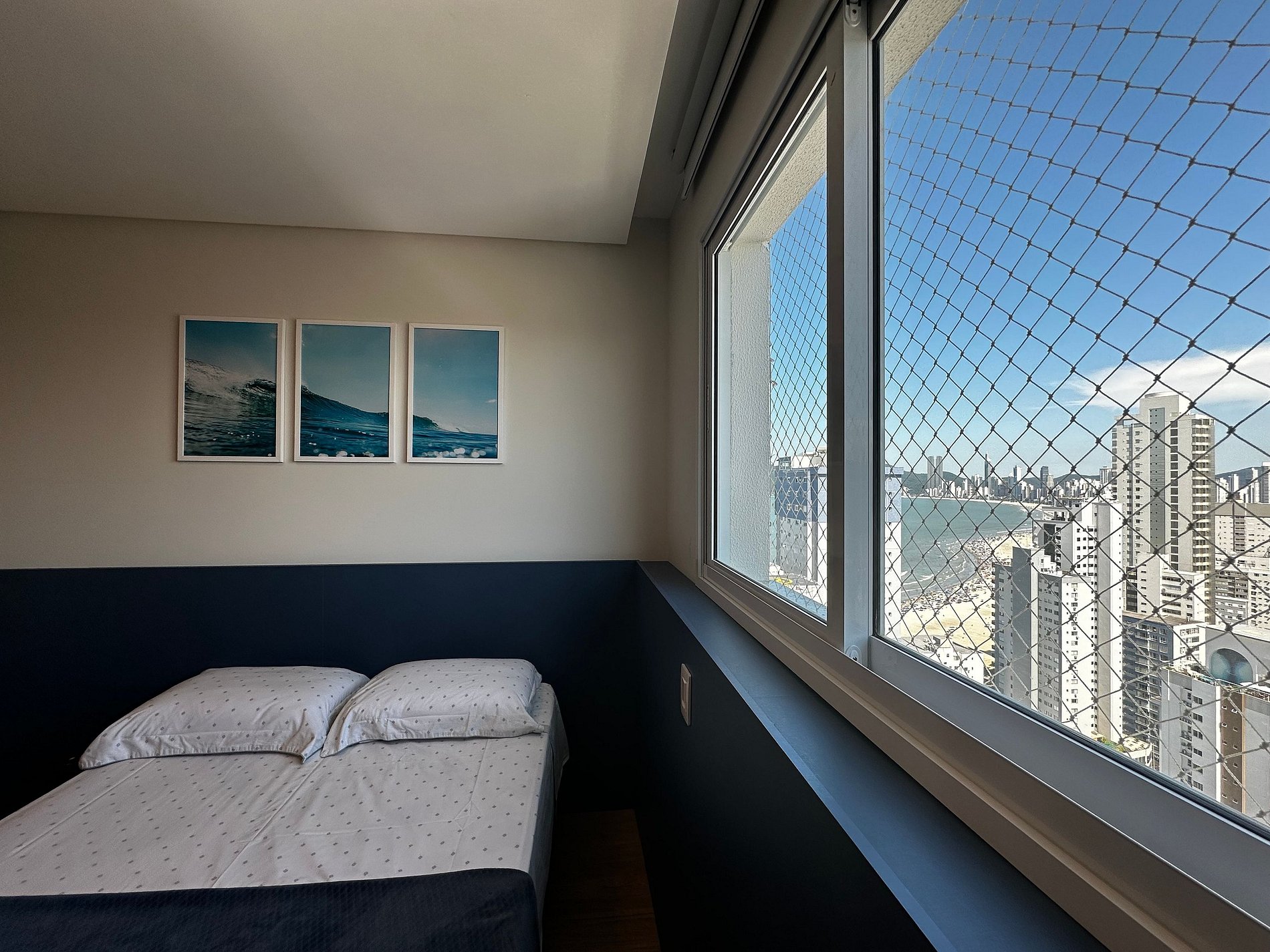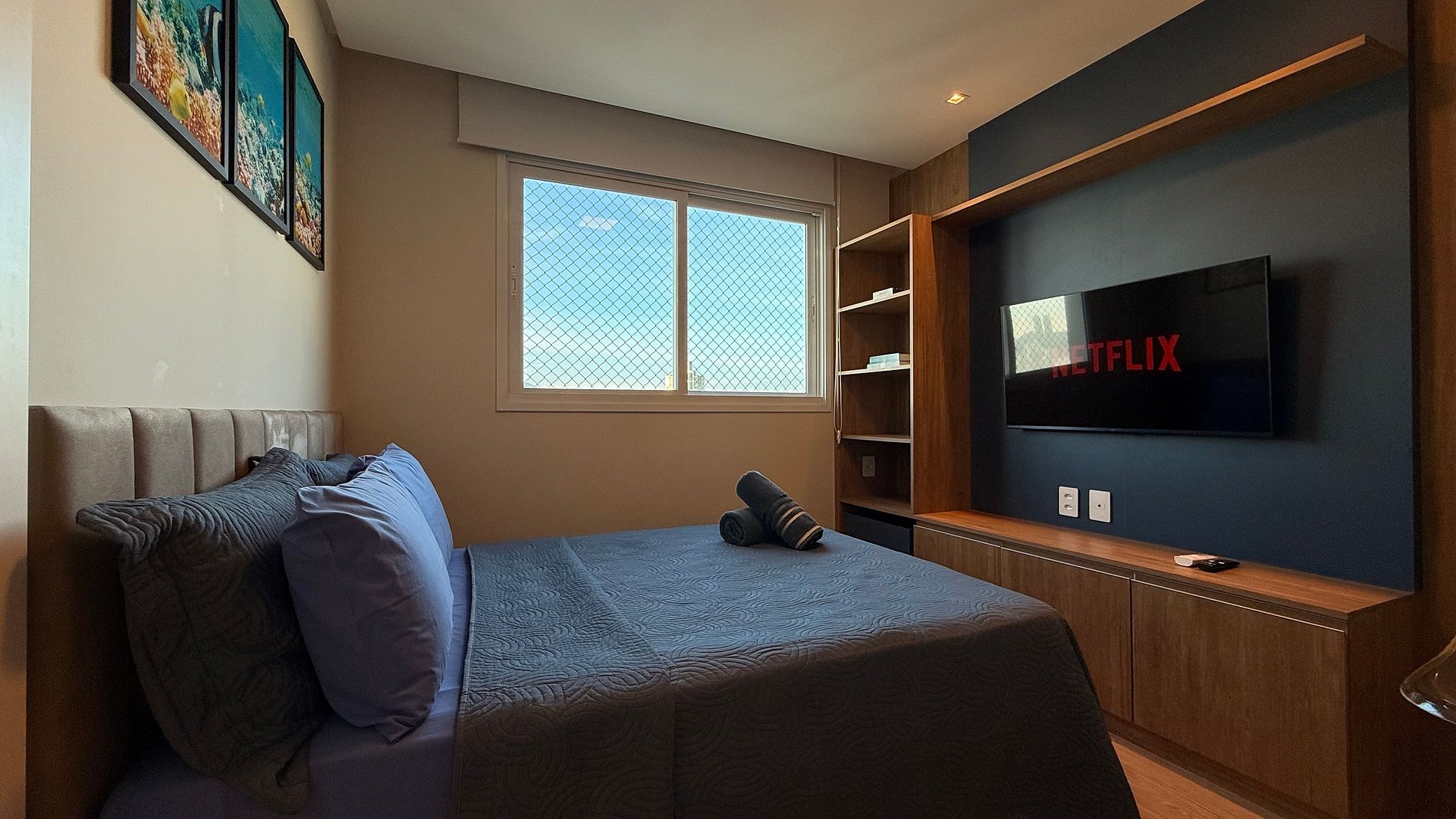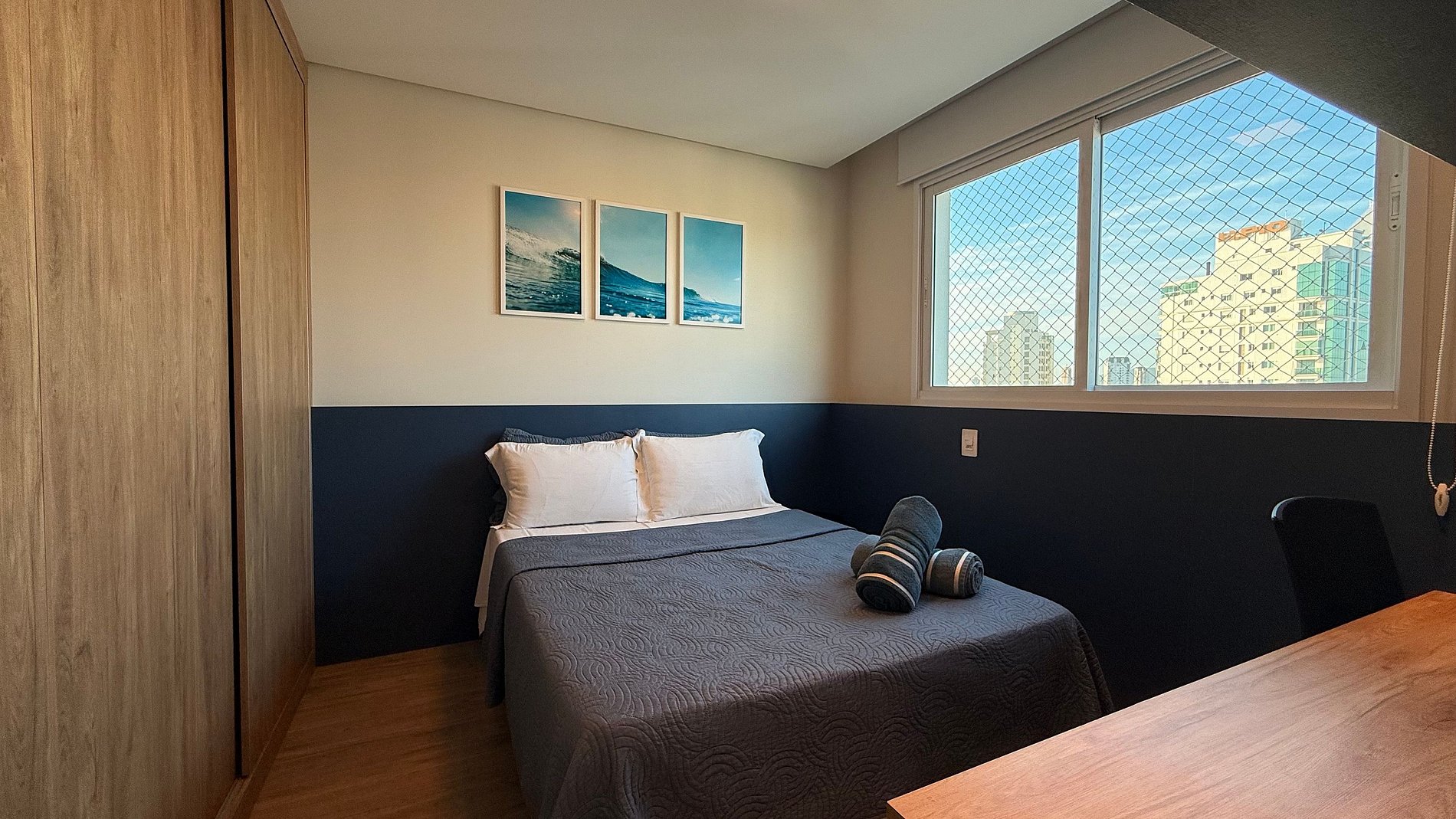 - DEMI-SUÍTE 2: Cama Casal Box com guarda roupa, TV 43" Smart e janela com vista para o mar e cidade
