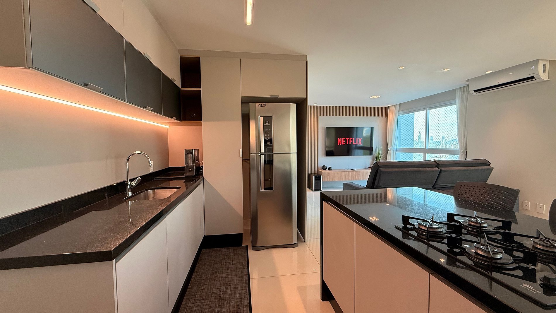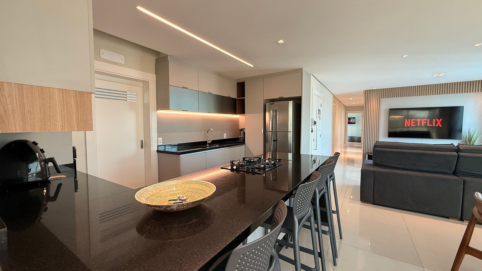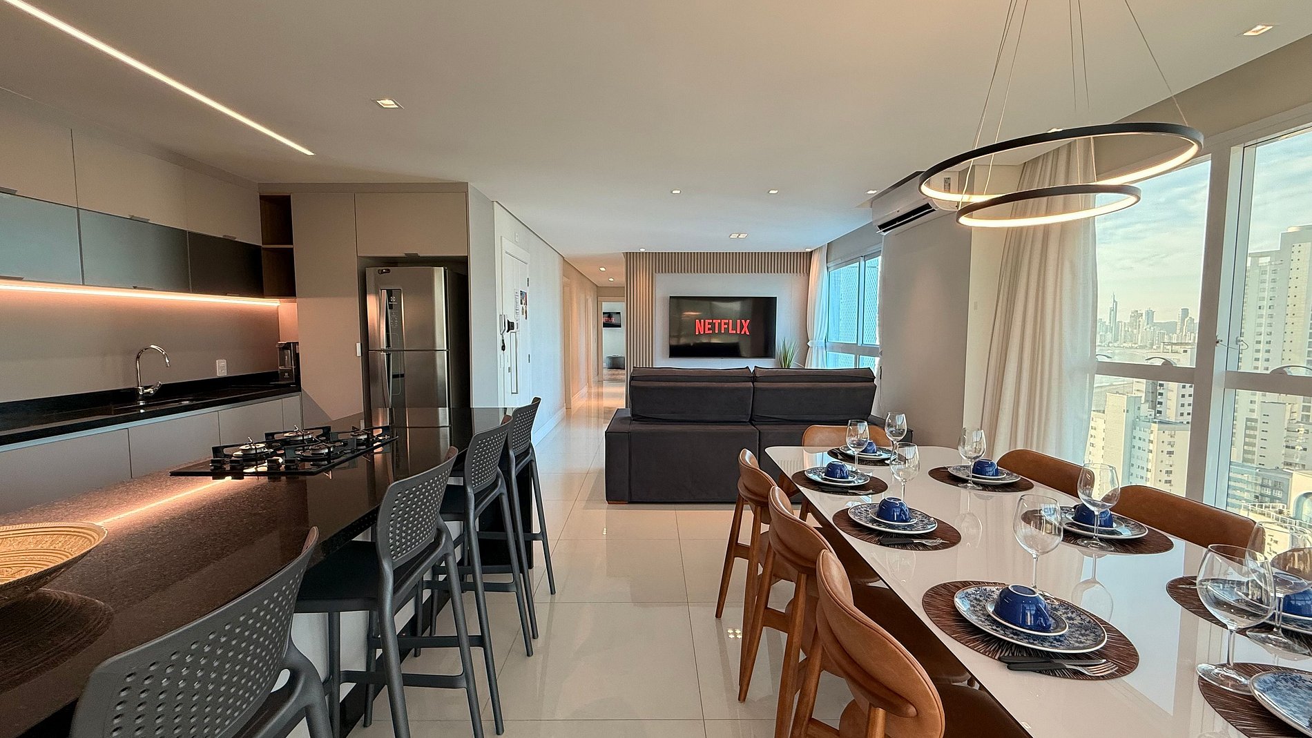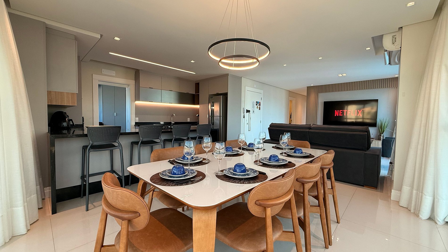 - Ambiente todo integrado sala, mesa jantar e cozinha com bancada em ilha e com ar condicionado climatizando todo ambiente